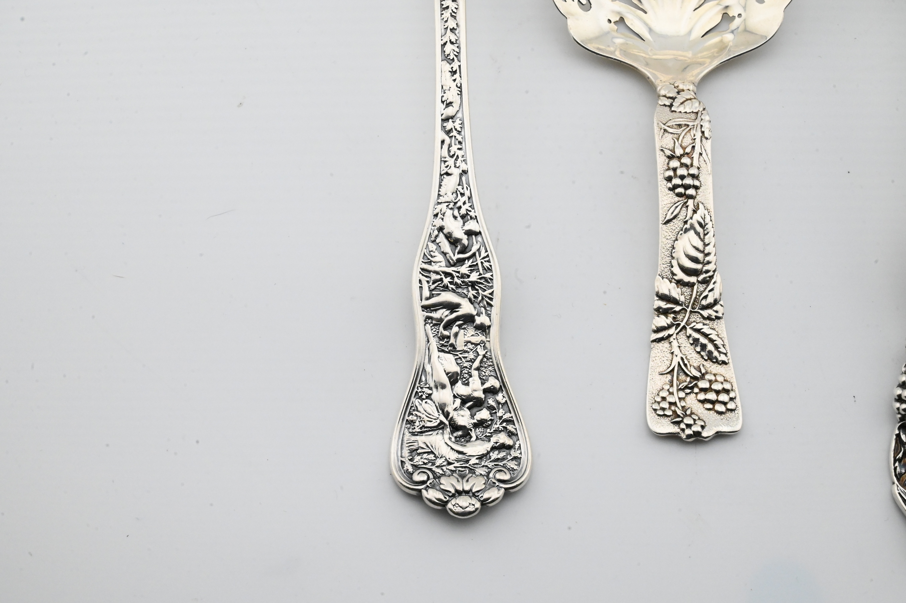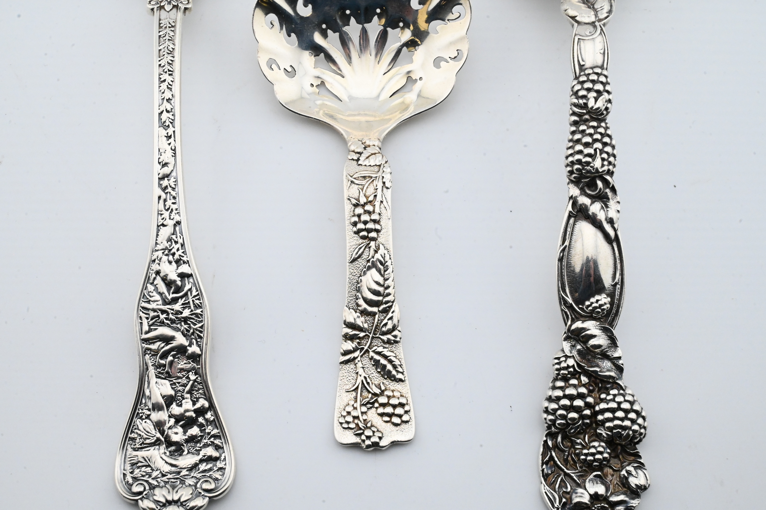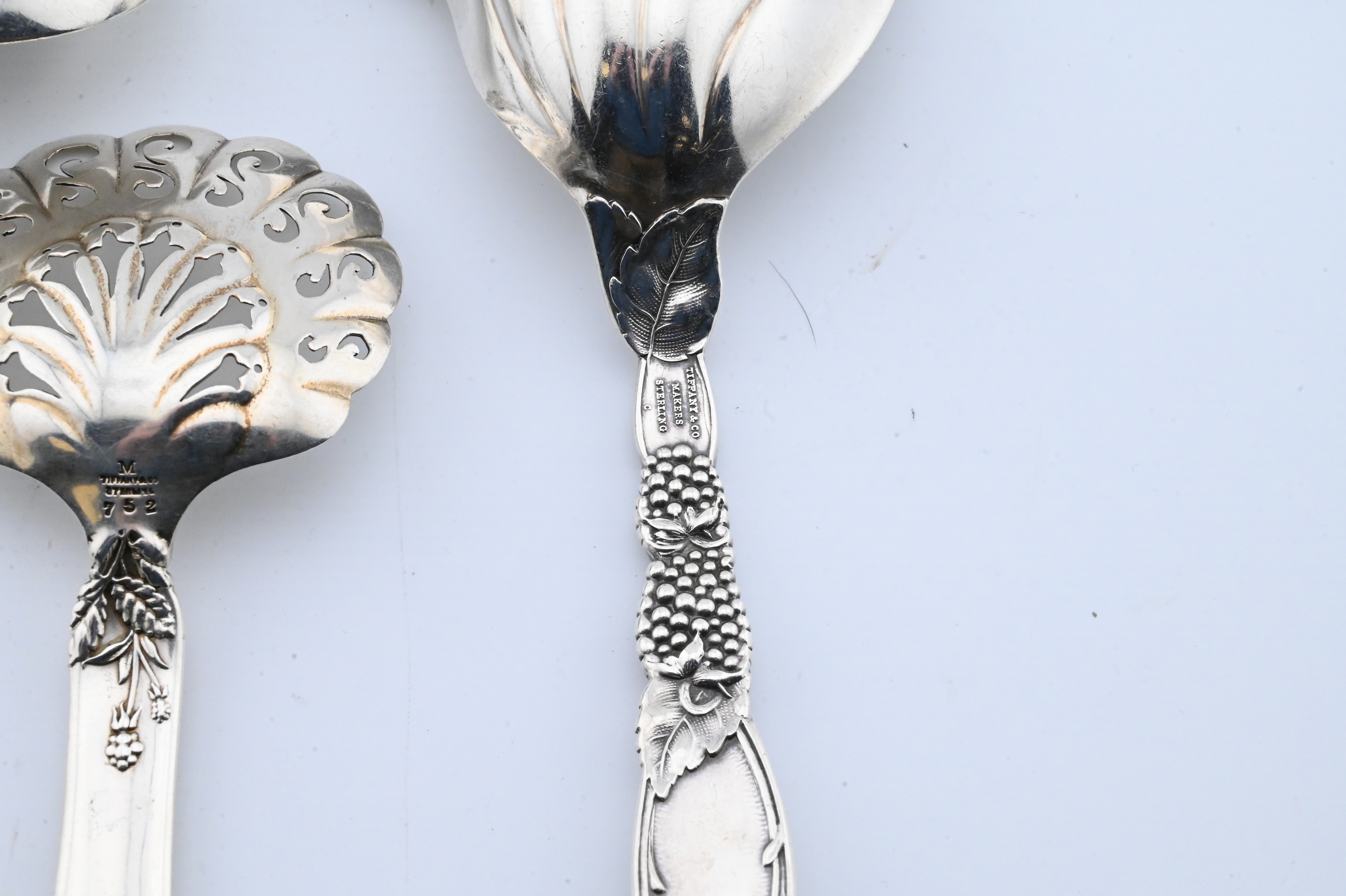 to include an Olympian pattern ladle with mythological figural handle and classical medallion, patented 1878, a Strawberry pattern berry spoon with pierced scalloped bowl and detailed fruiting vine handle (both marked Tiffany & Co. Sterling), sterling silver berry spoon in a Blackberry pattern having a large curled bowl with polished surface, handle cast and chased with blackberry clusters, leaves, and blossoms in high relief, marked TIFFANY & CO. / MAKERS / STERLING / C