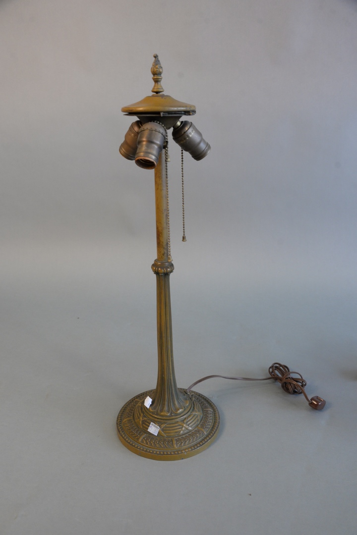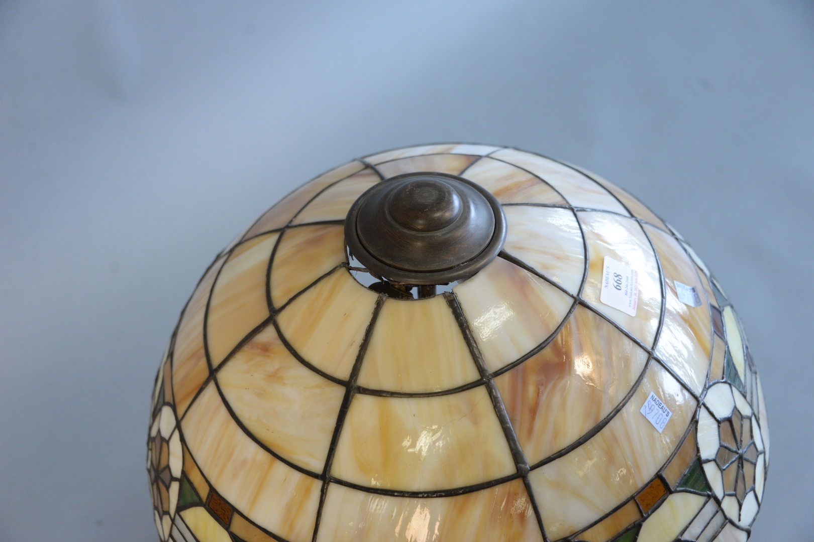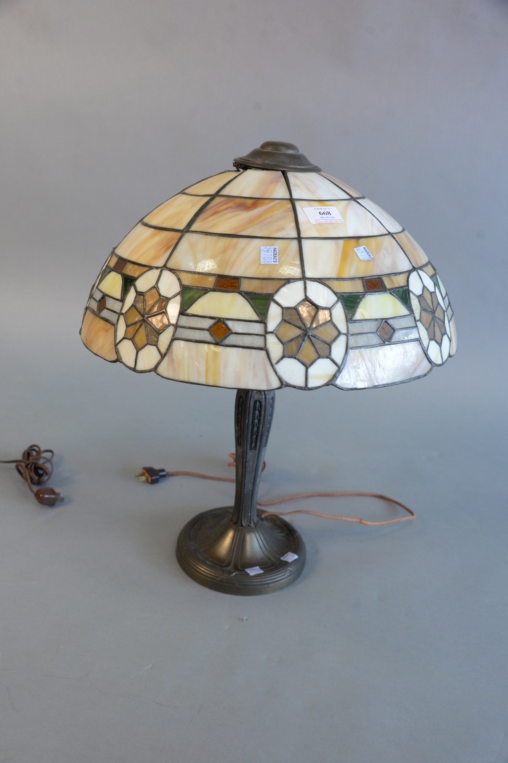 Lot 668: Two Piece Lot leaded glass table lamp and panel shade base leading at top pulling away height of base 25 inches Provenance: Thirt…