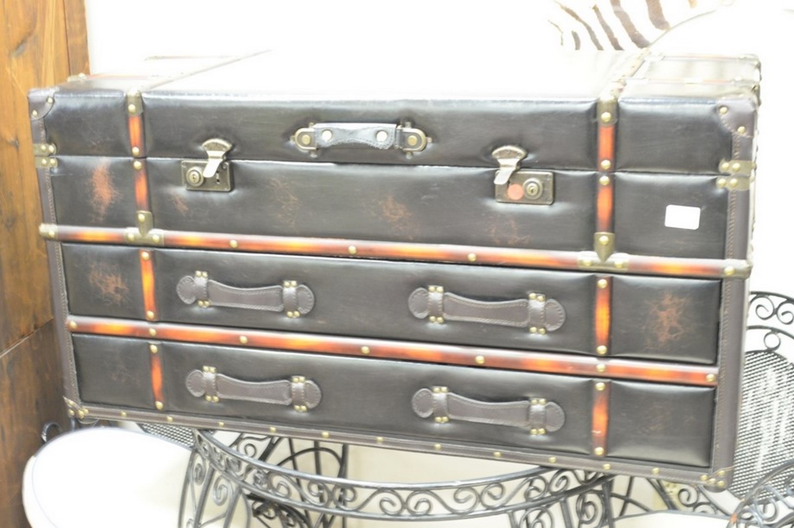 Lot 669: Six piece lot to include Leather lift top chest Along with an iron outdoor table with 4 side chairs missing glass top