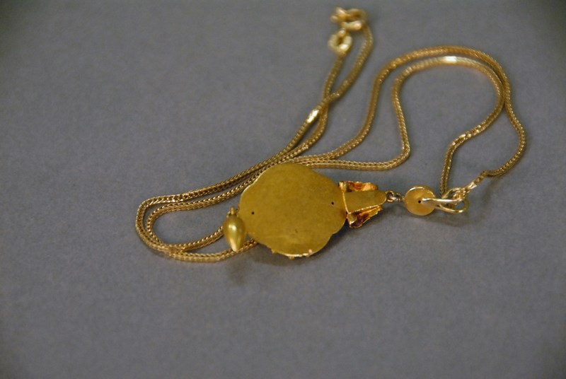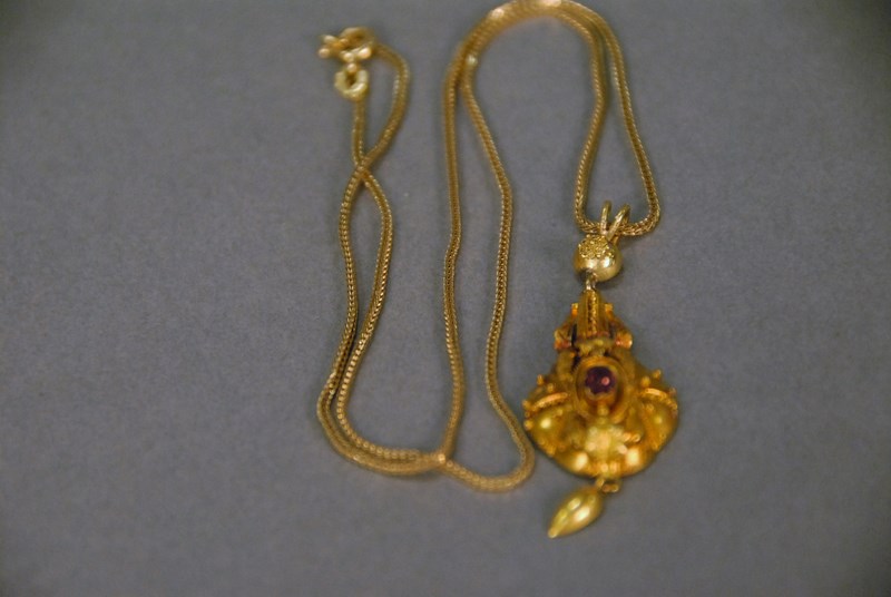 Lot 67: 14k gold chain and Victorian pendant set with small oval amethyst. 6.5 grams, chain lg. 18 1/4in. pendant lg. 2in.