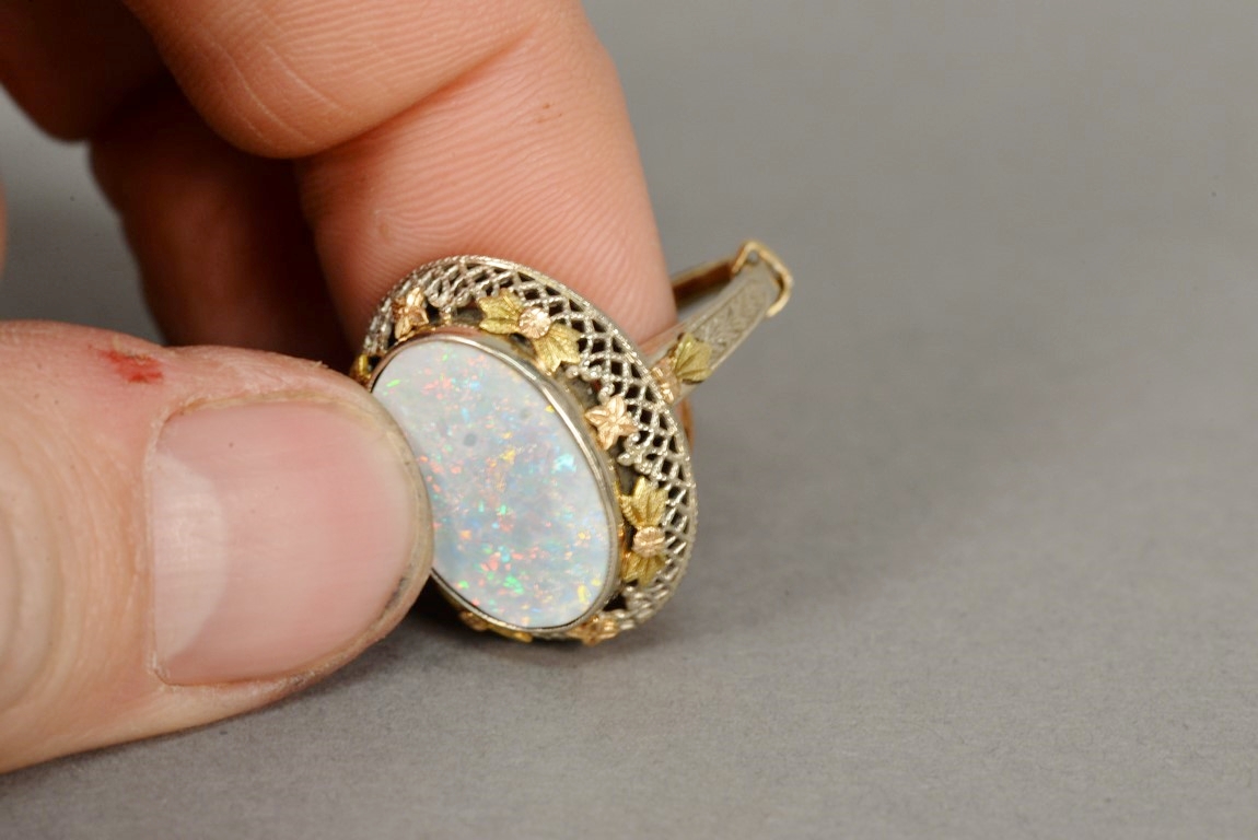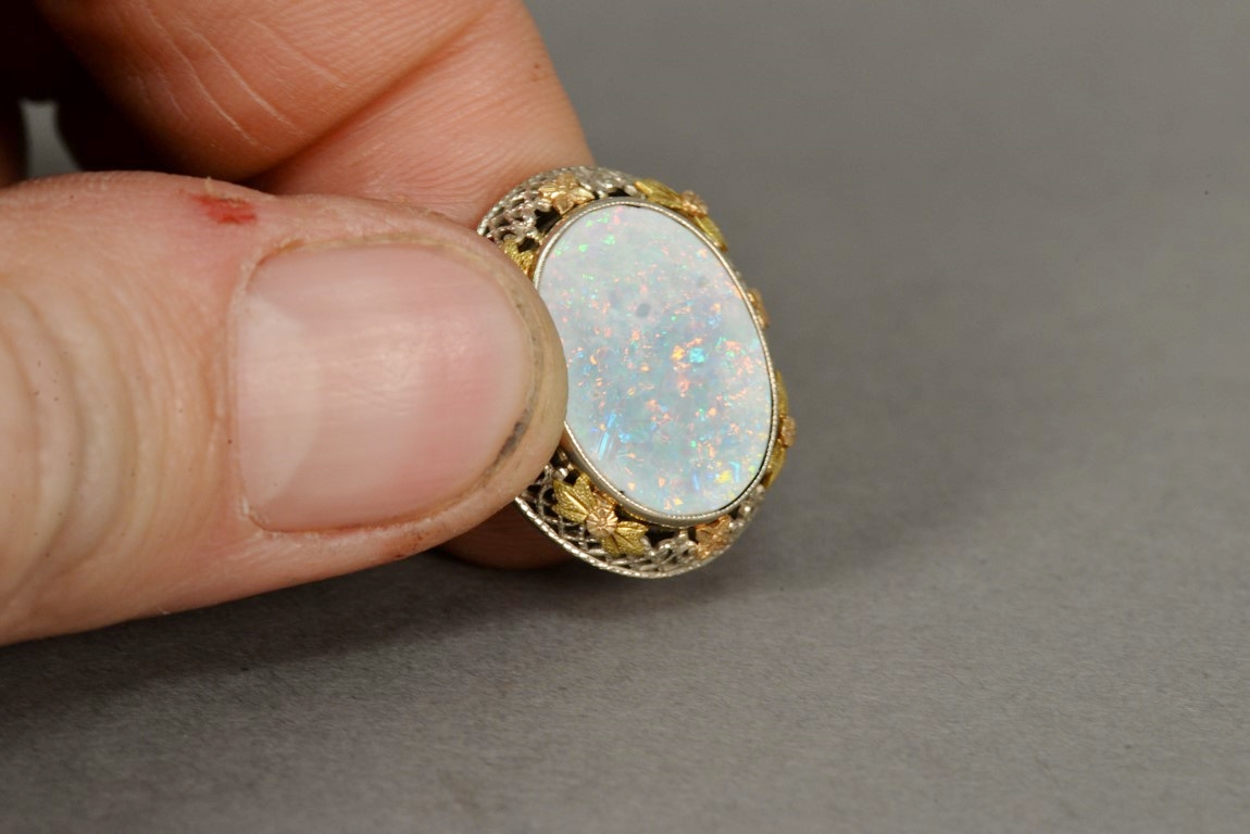 14K gold ring having large center opal mounted on filigree setting of white, yellow, and rose gold.