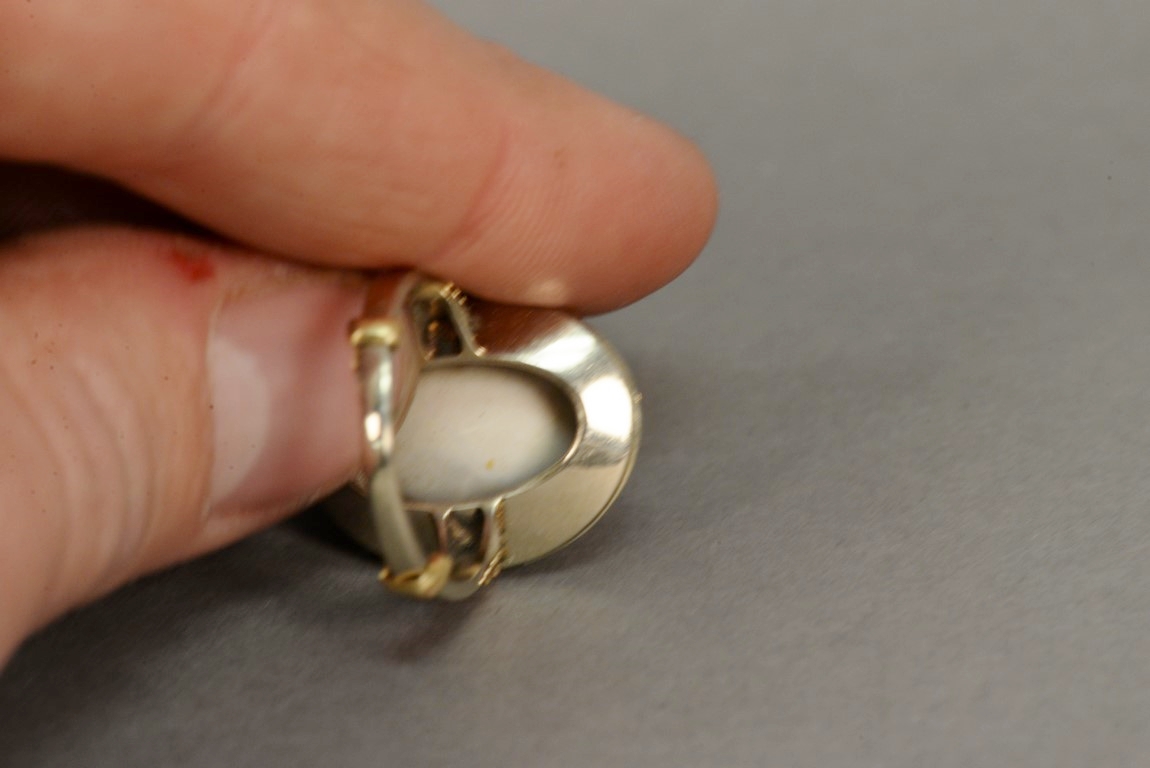 Lot 67: 14K gold ring having large center opal mounted on filigree setting of white, yellow, and rose gold.