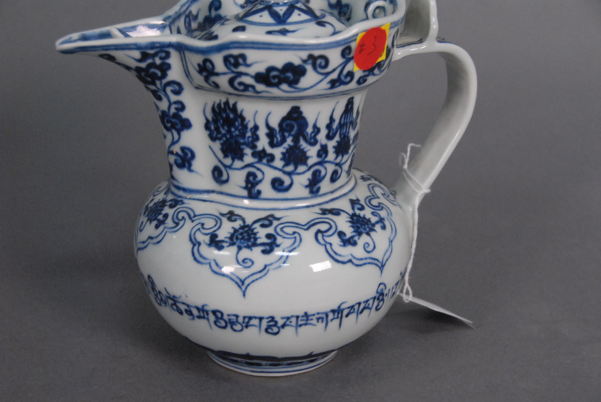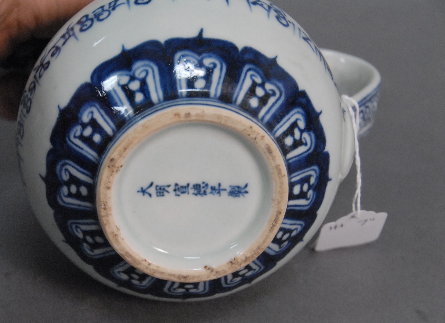 Lot 67: Blue and white porcelain teapot having scrolling flowers and vine decoration with cover and six character mark on base, ht. 7in.