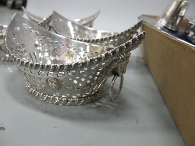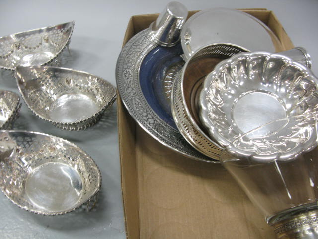 Box lot of mostly silver plate to include four small baskets with lion mask handles, crystal dish with sterling base