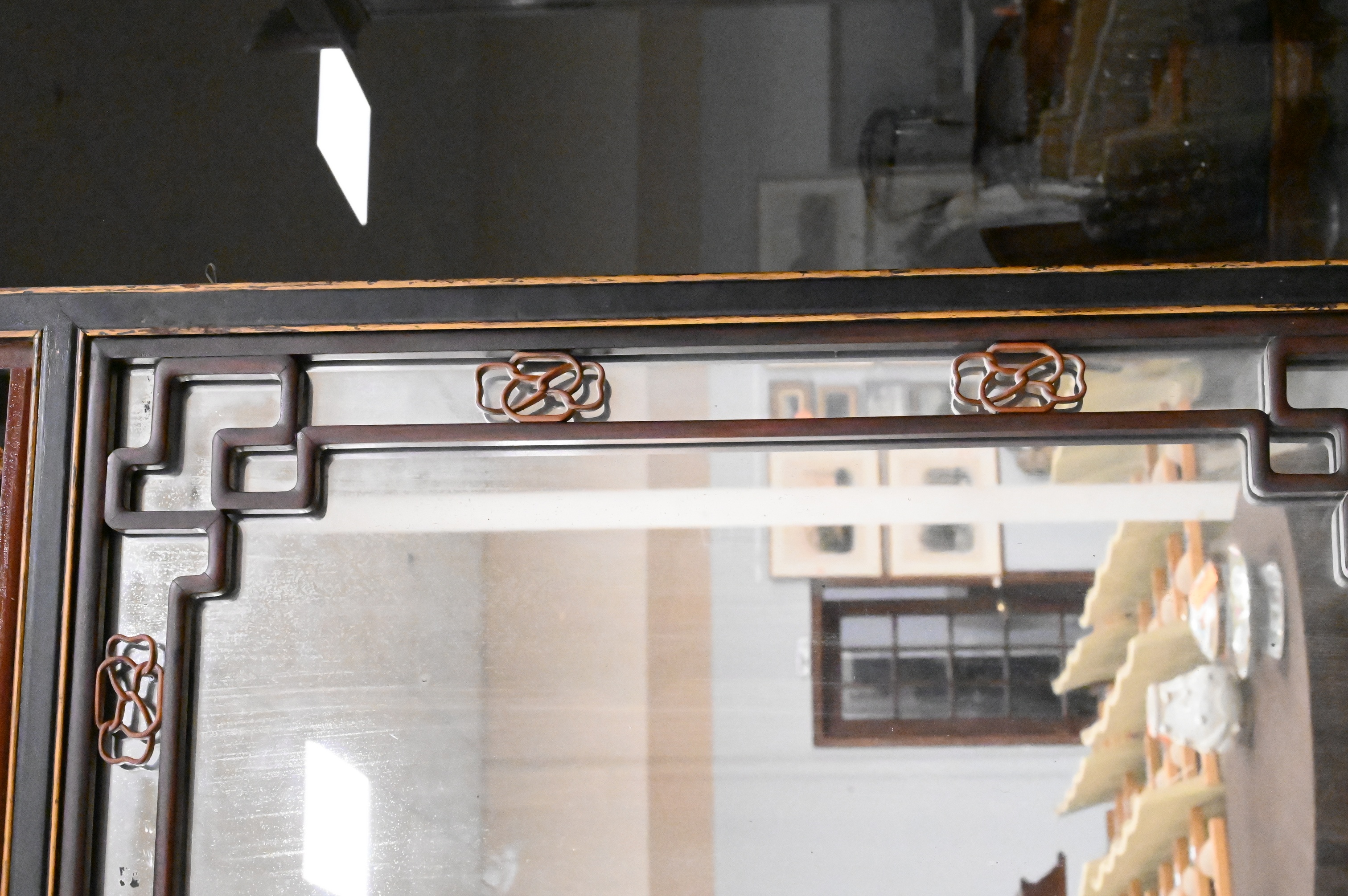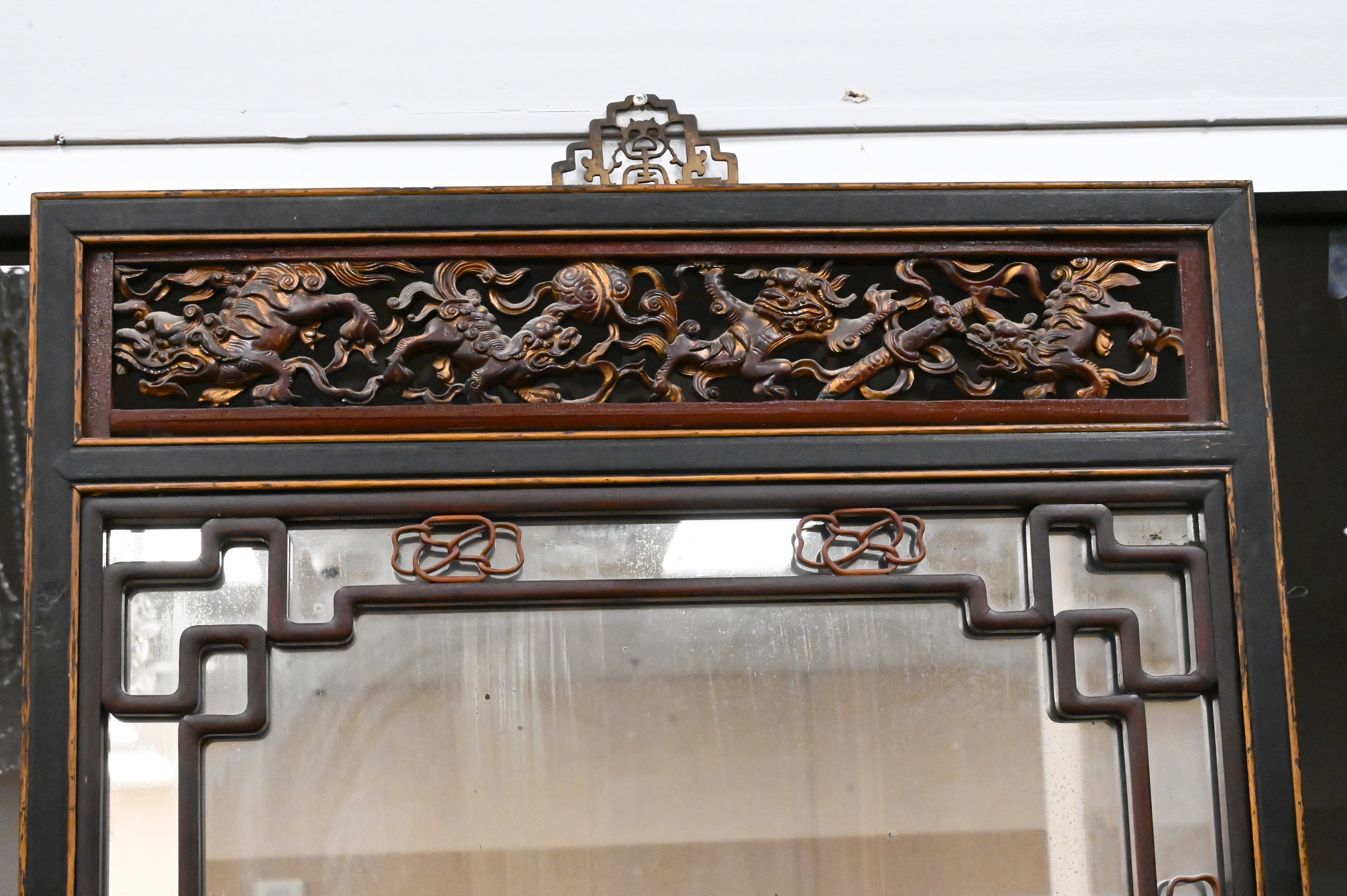 The rectangular frame with openwork carved crest of dragons amidst clouds, the mirror plate within a border of pierced geometric spandrels and floral rosettes.
