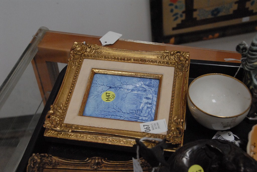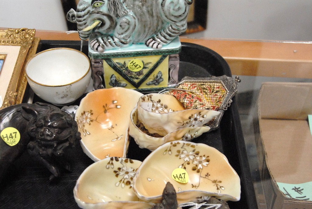 Lot 67: Group lot enameled framed plaque, three dimensional stone plaque, bronze foo-dog, five shell shaped cups, mesh bag, porcelain foo-d…