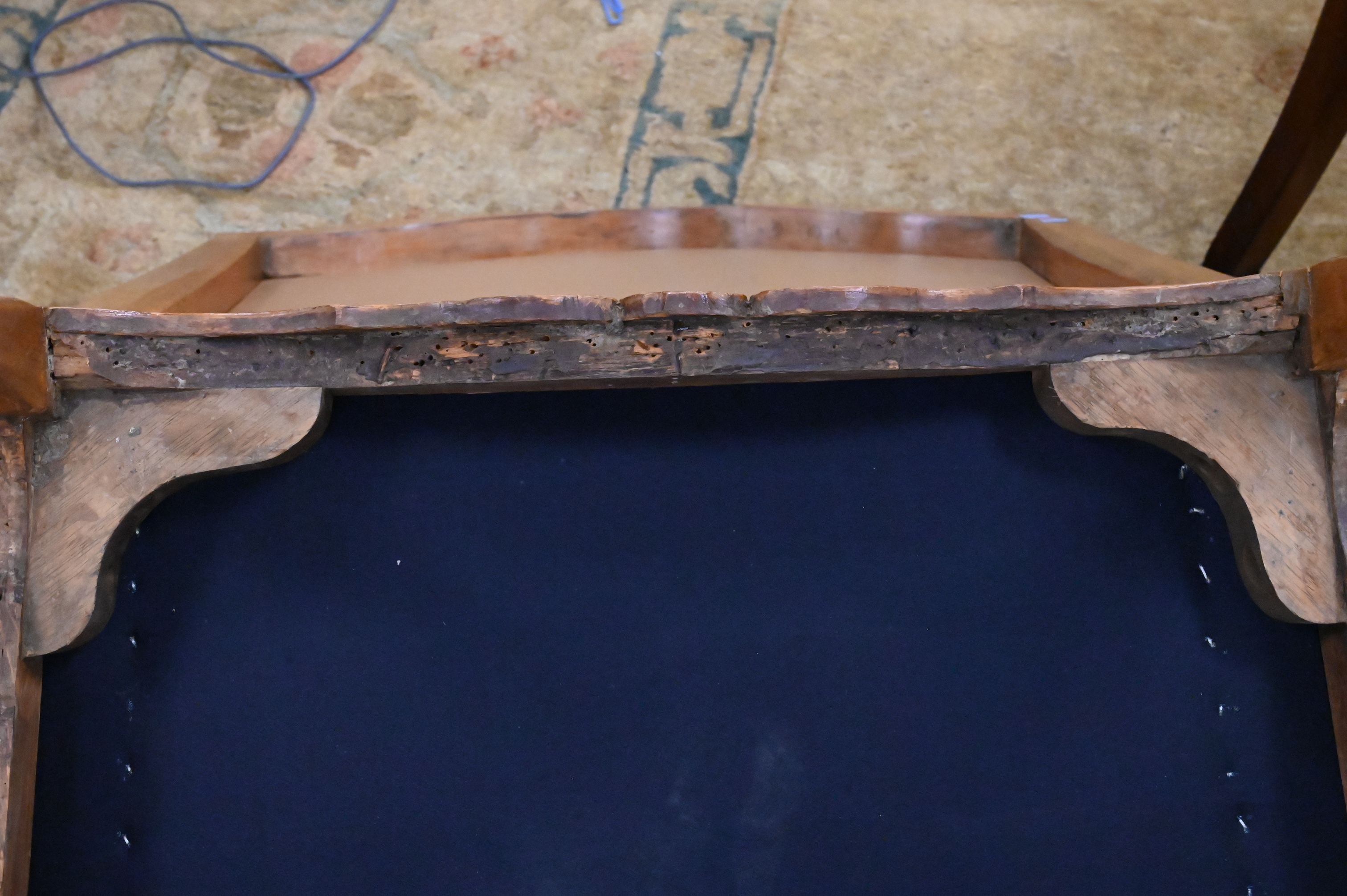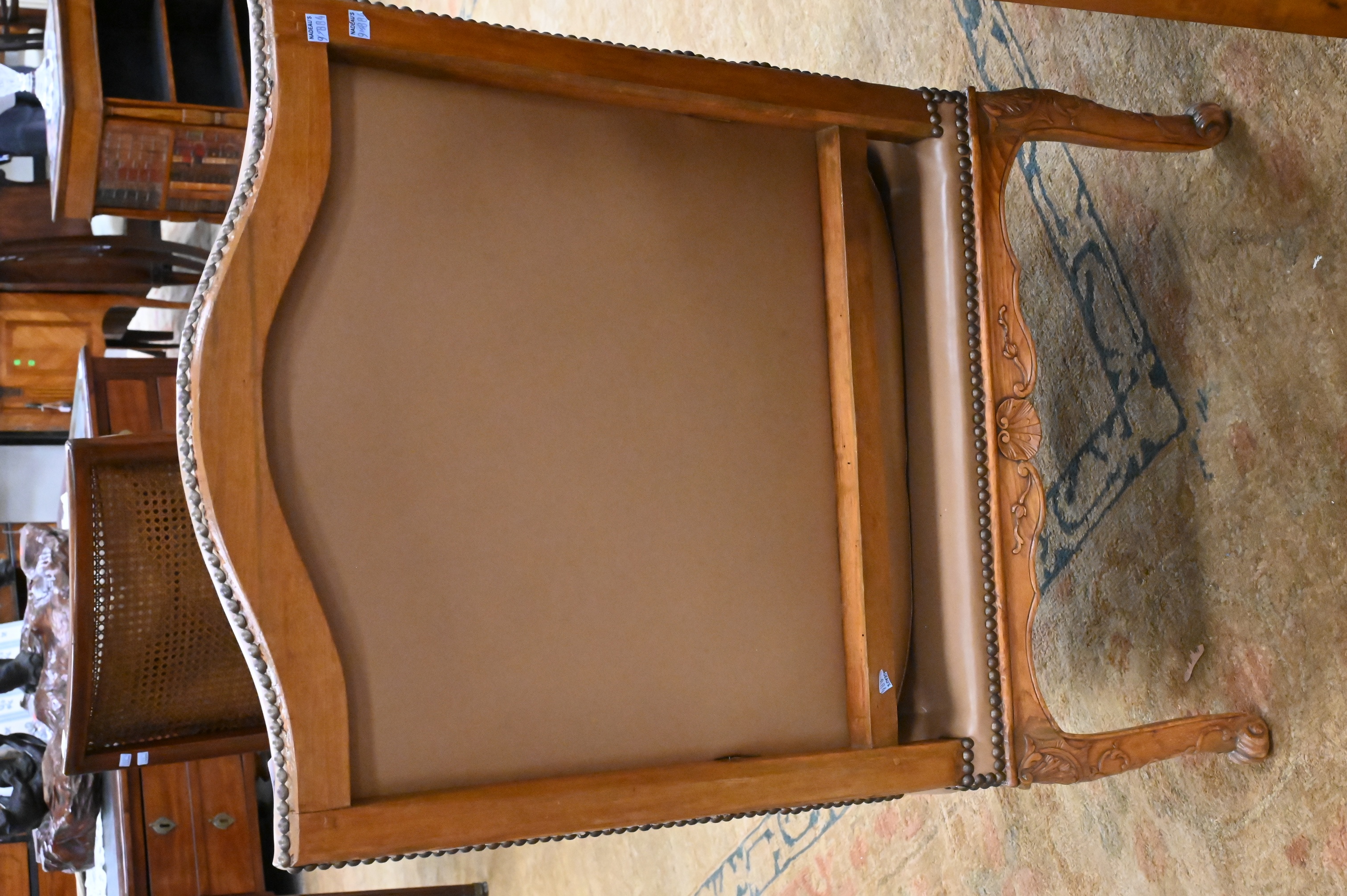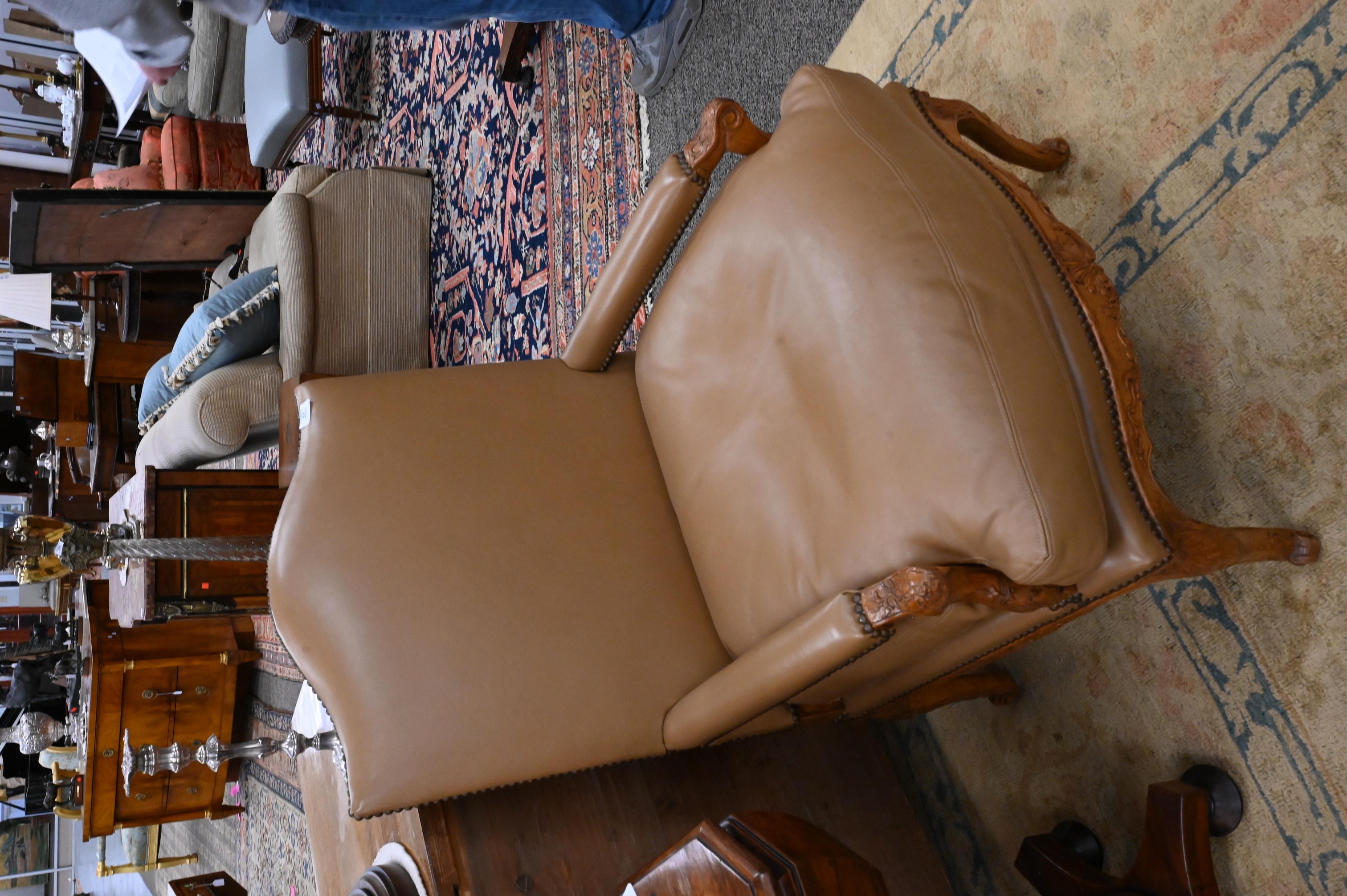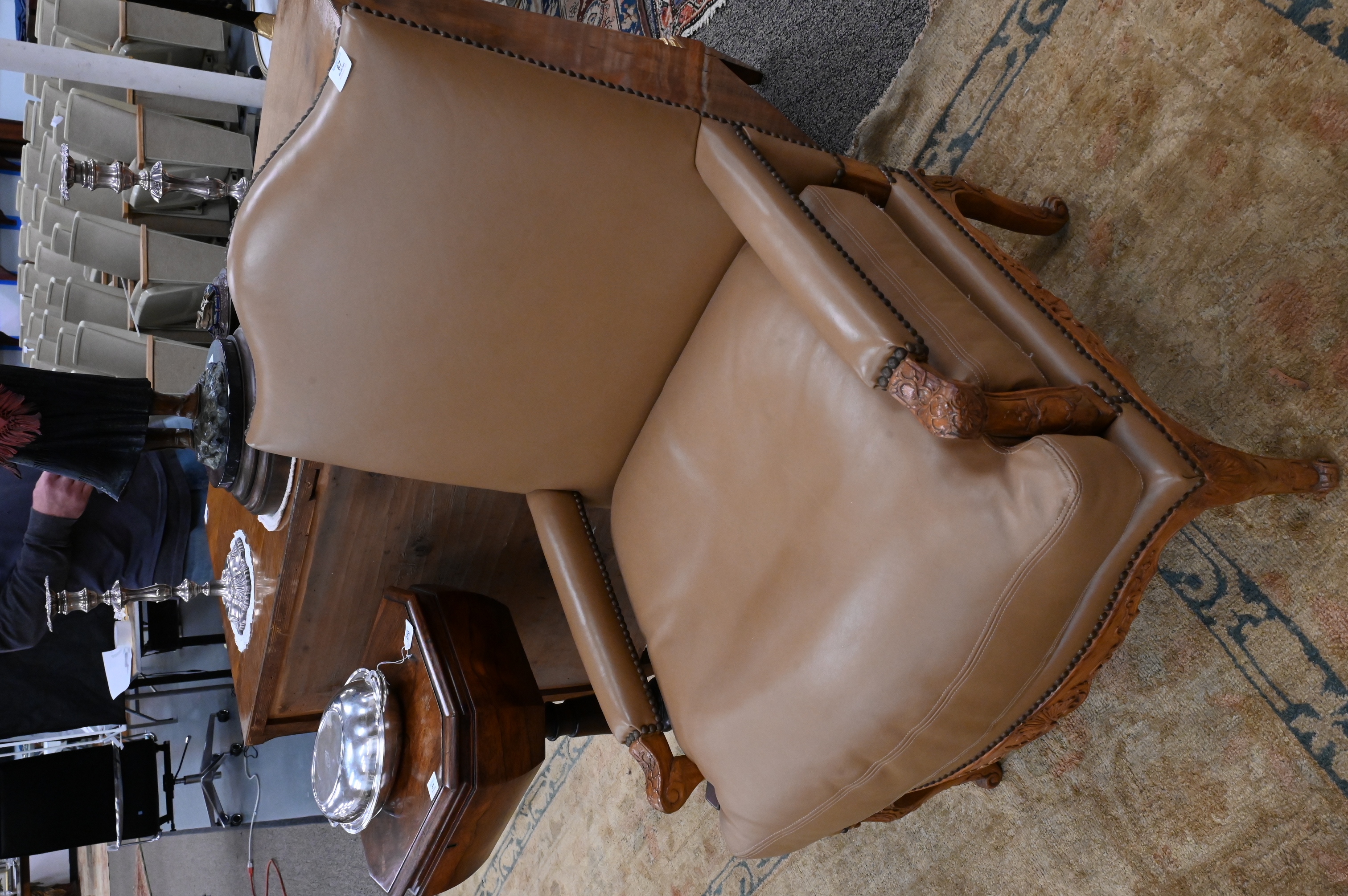 large-scale walnut armchair with serpentine crest rail, carved scrolling arms, and cabriole legs with foliate motifs, upholstered in tan leather with brass nailhead trim, shaped apron with shell and leaf carving, France, 18th/19th century