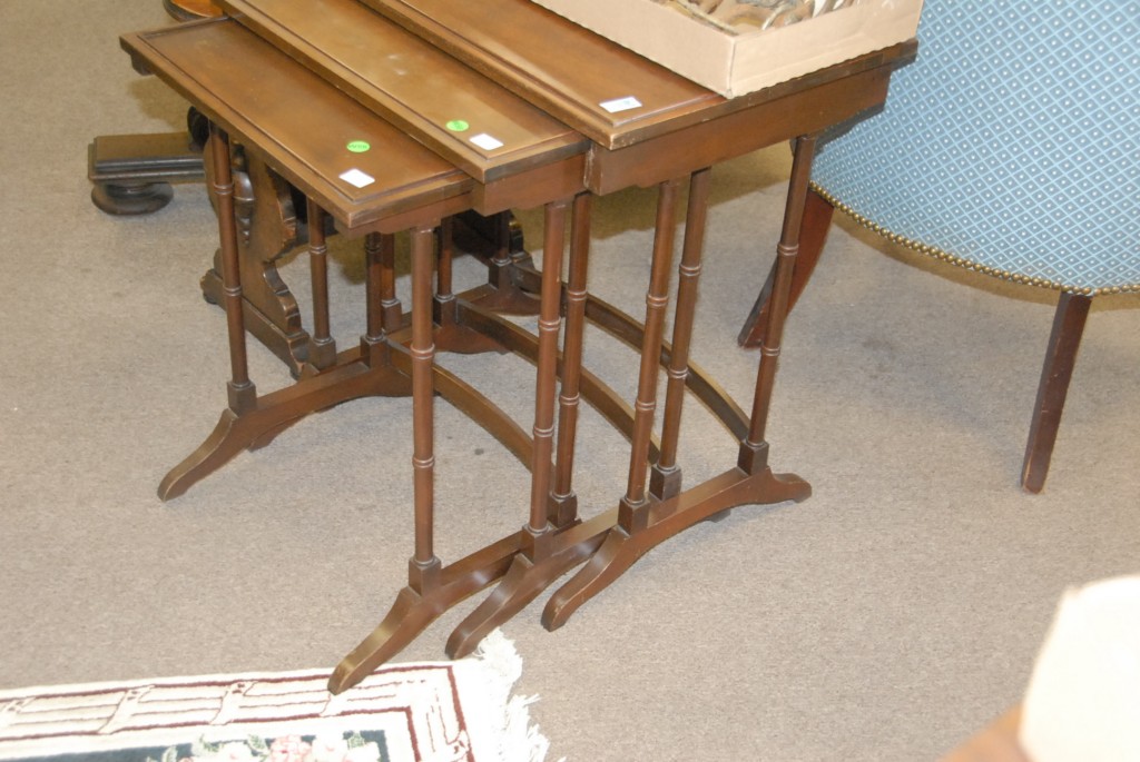 Nest of three mahogany Georgian style tables and a small walnut table.