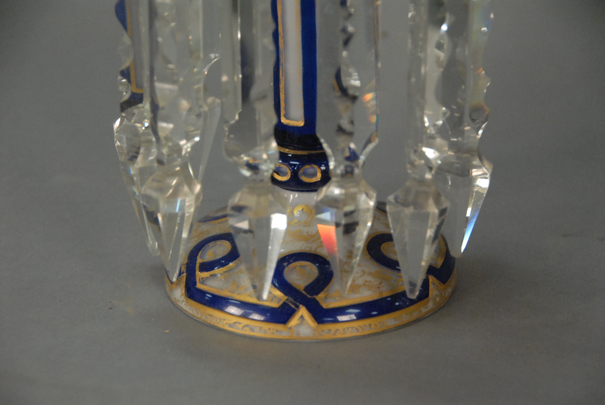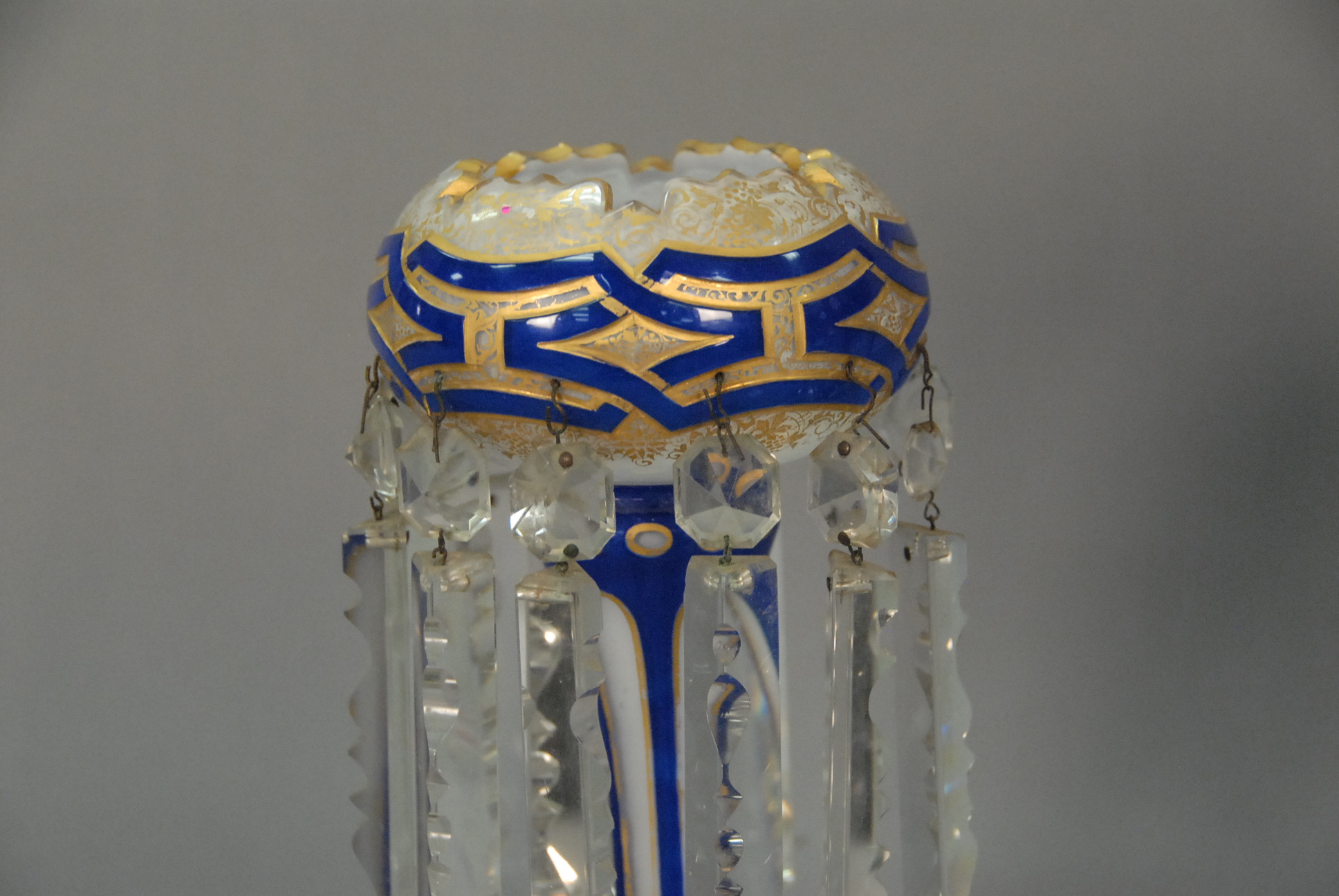 Overlay luster, cobalt clear to white with gold decoration two prisms missing. ht. 11in.