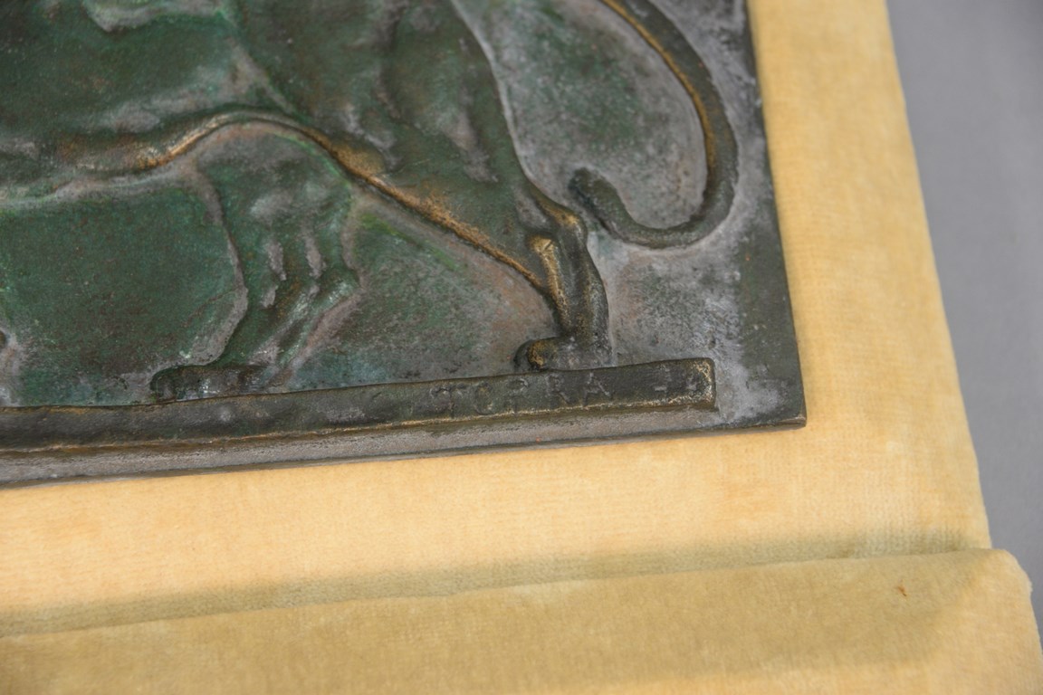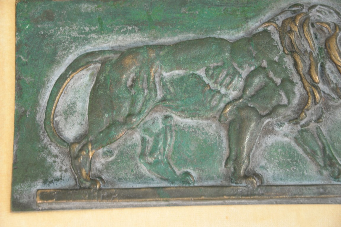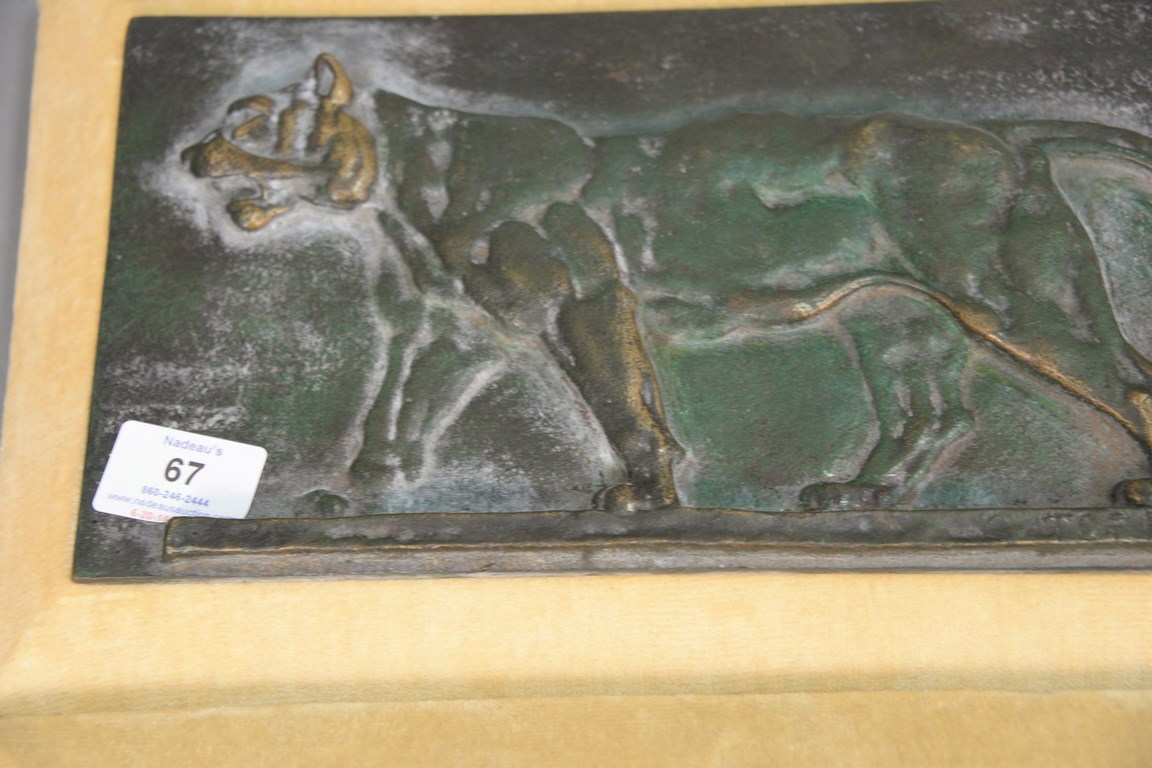 Lot 67: Pair of bronze plaques of a male and female lion marked Torra. bronze: 6 1/2 x 12, total size: 9 x 15