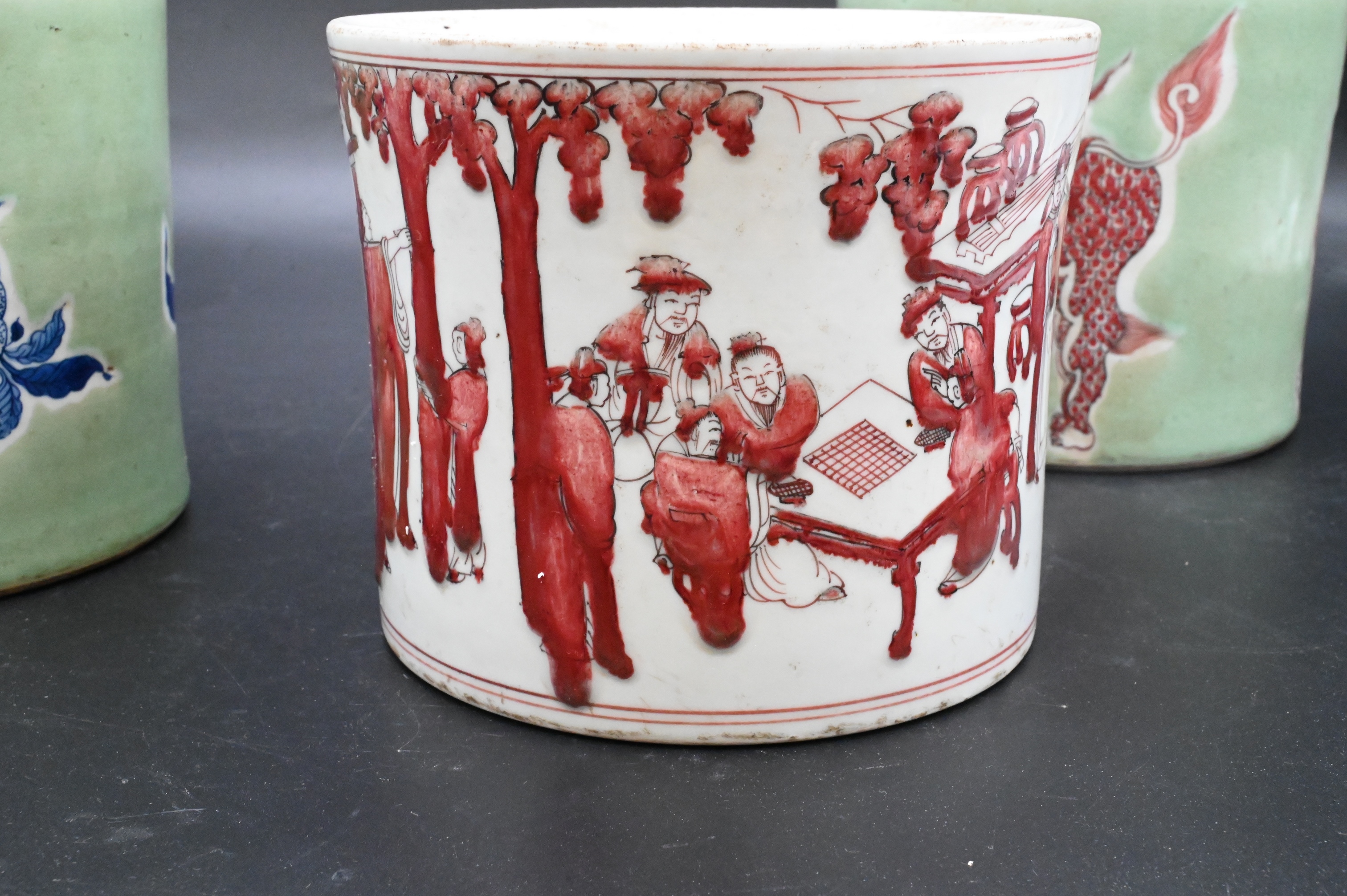 to include one pot having underglaze copper and red brush motifs, one celadon pot having underglaze copper and red and blue brush botanical motifs, one celadon pot having underglaze copper and red and blue foo dog motifs