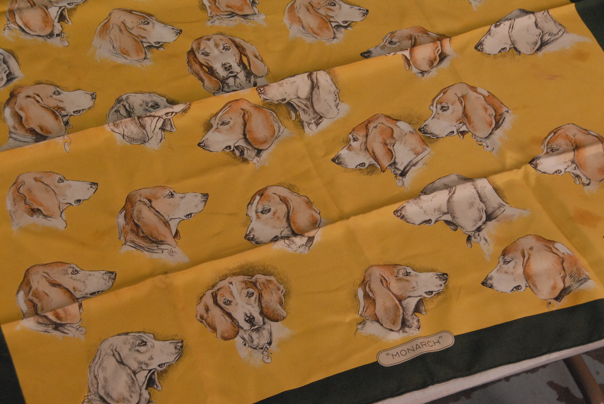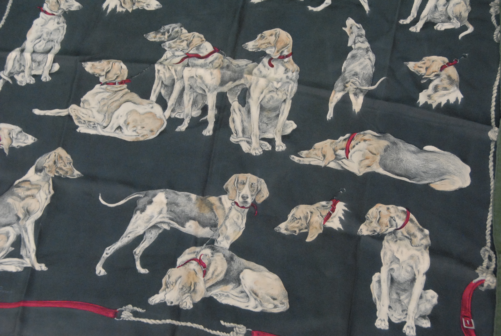Two Hermes silk scarves, each with dogs on them signed Poret.