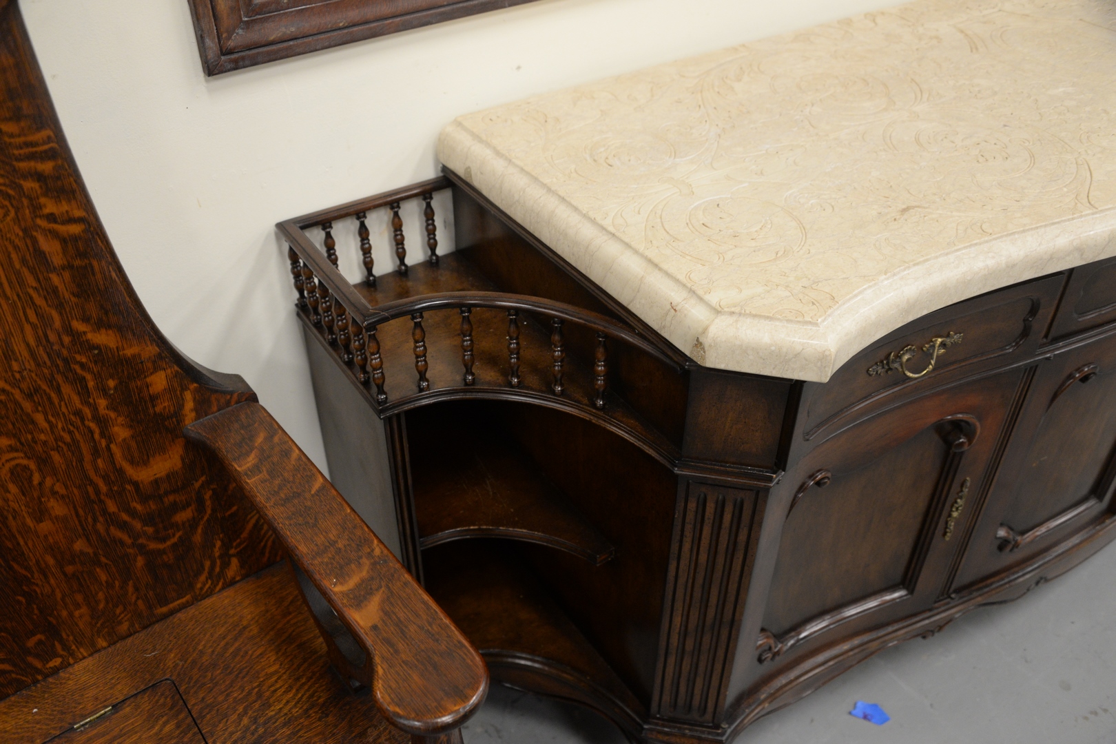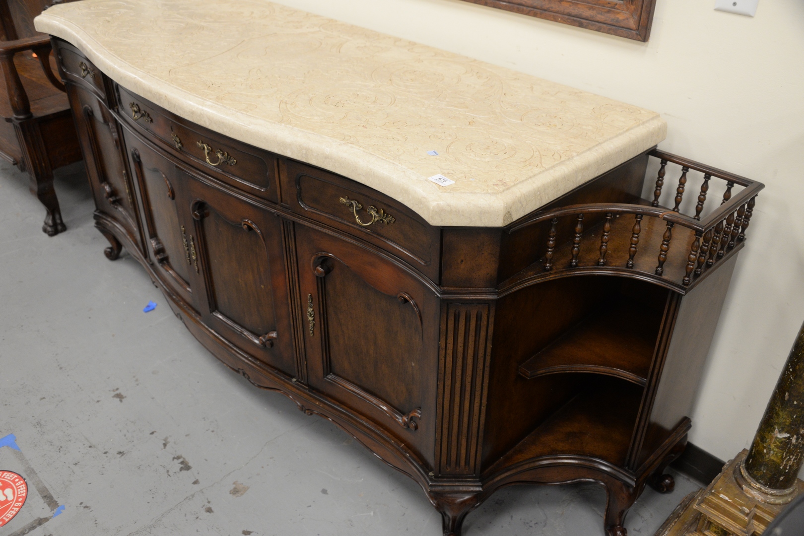 Lot 670: Contemporary Server, having etched, carved marble top over three drawers and four doors, flanked by shelves on each side, height 34 …