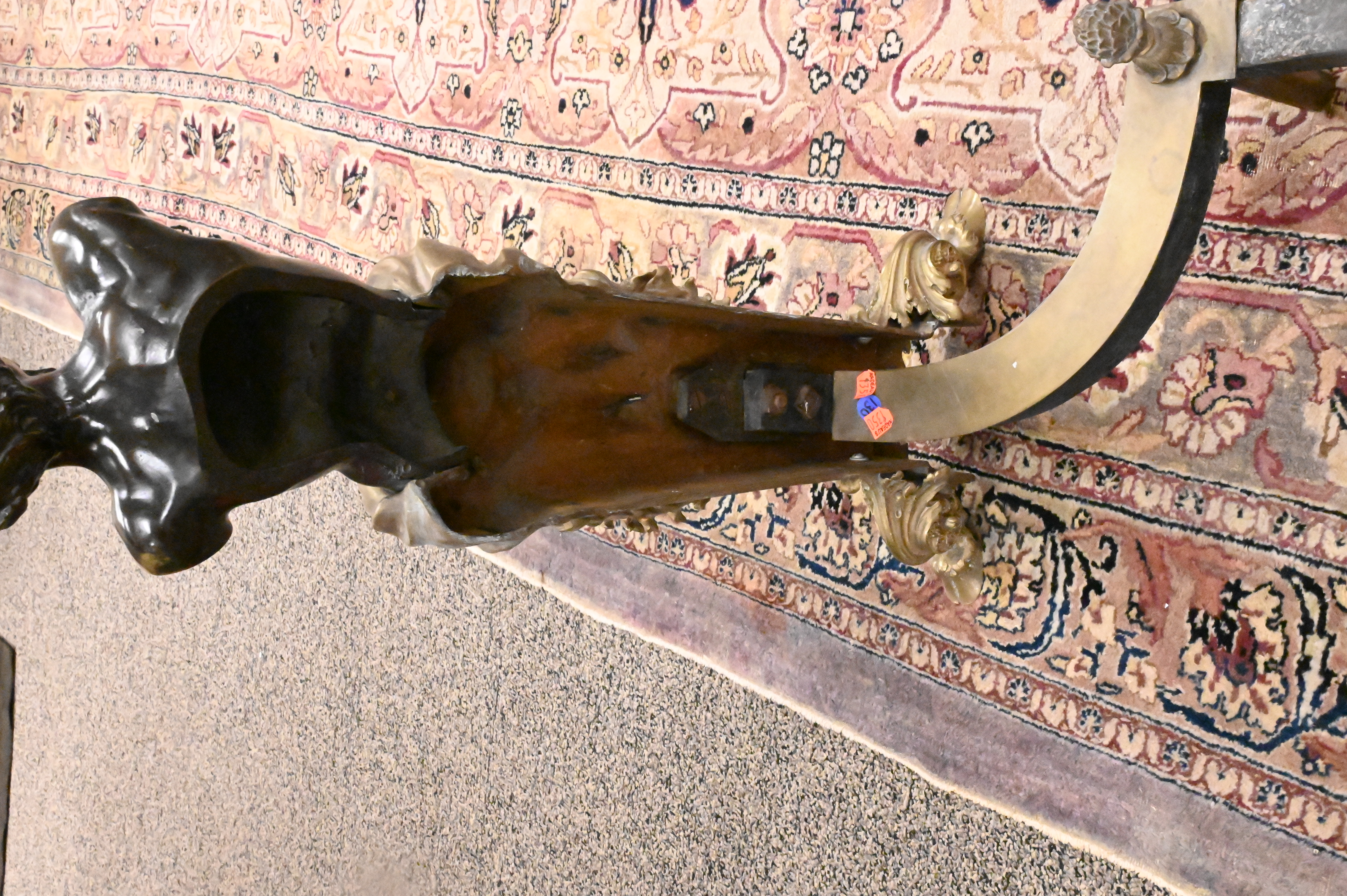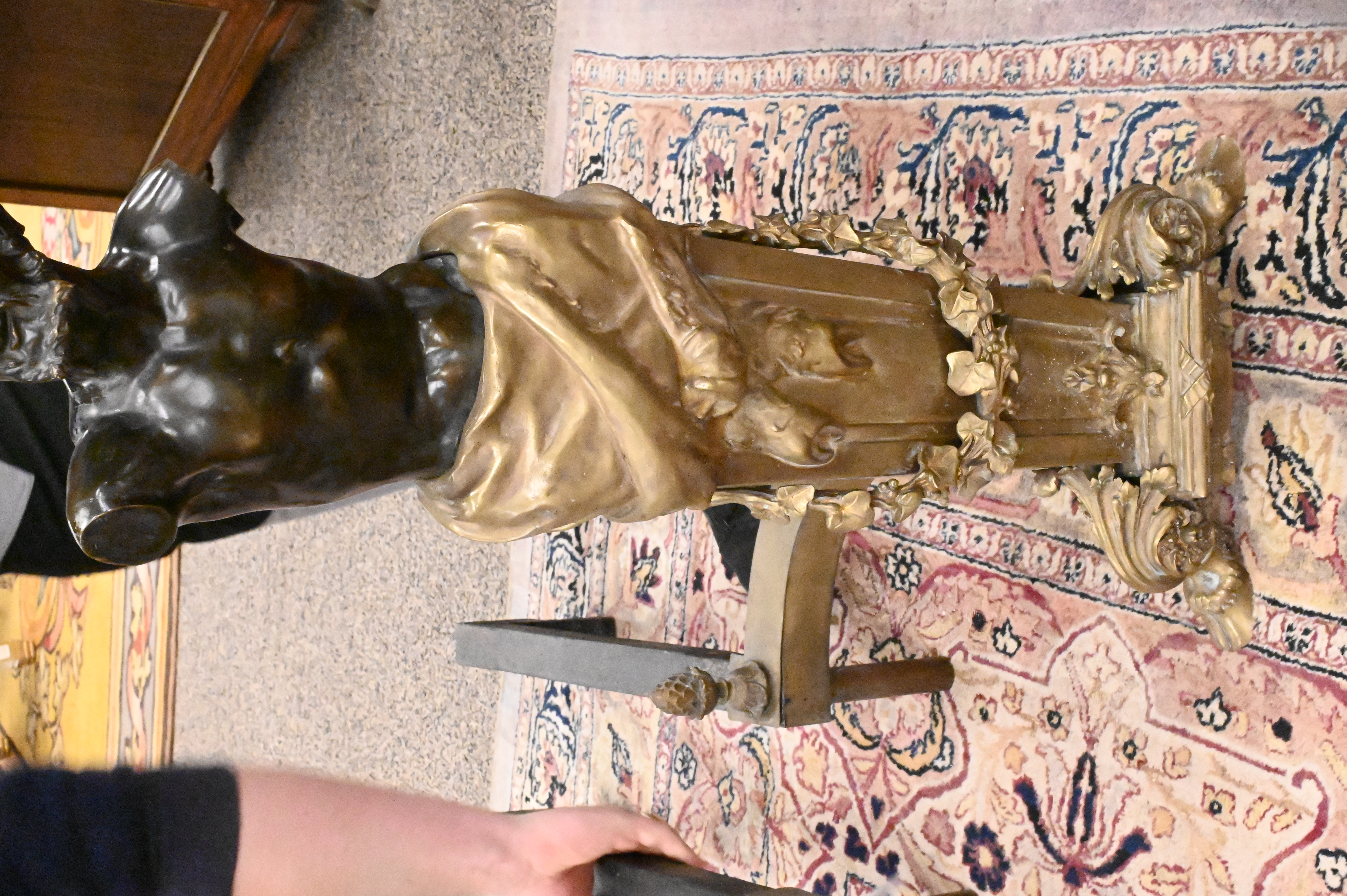 each molded as a bacchic-form herm figure draped with floral swags, raised on scrolled hoof feet