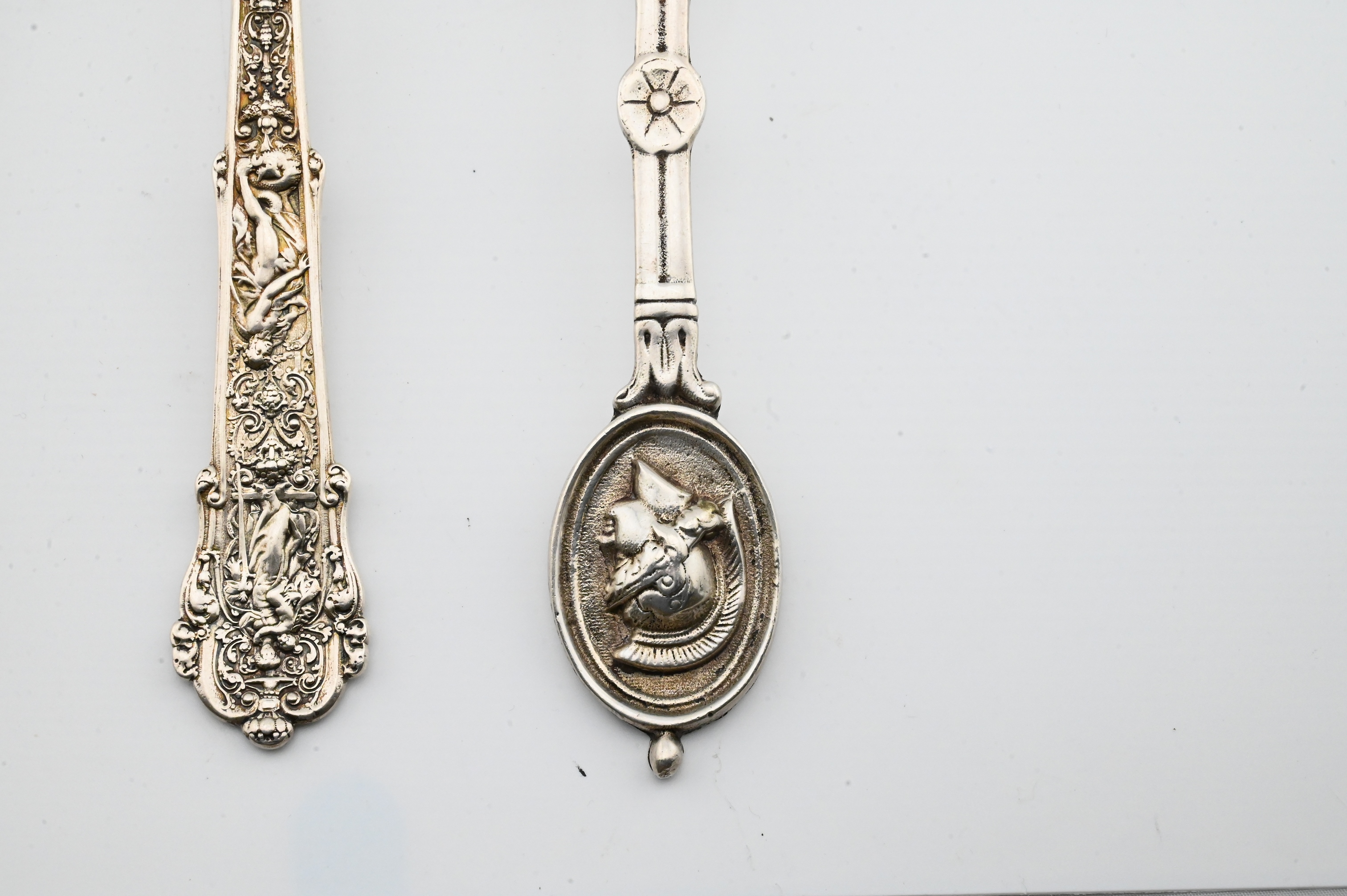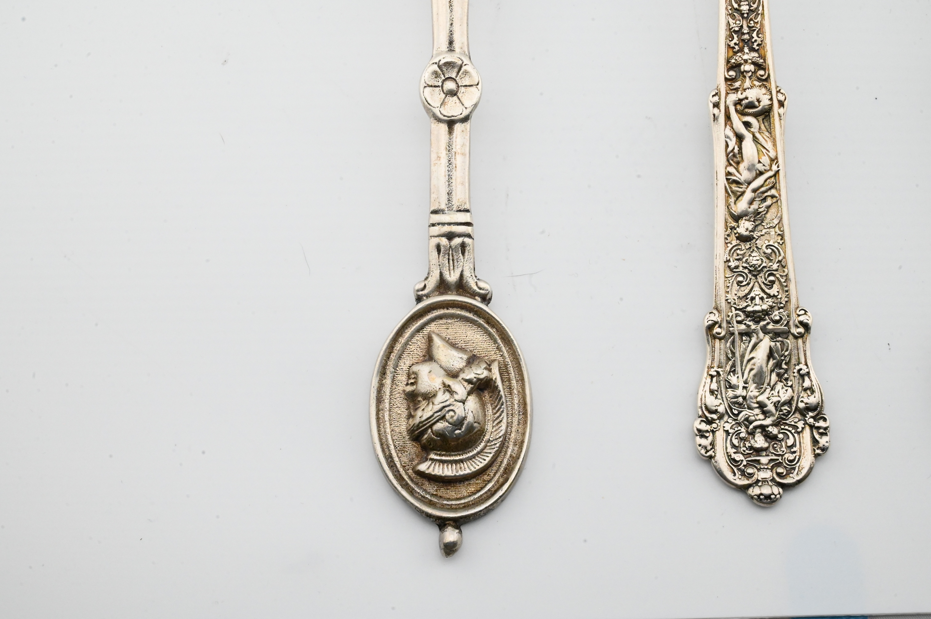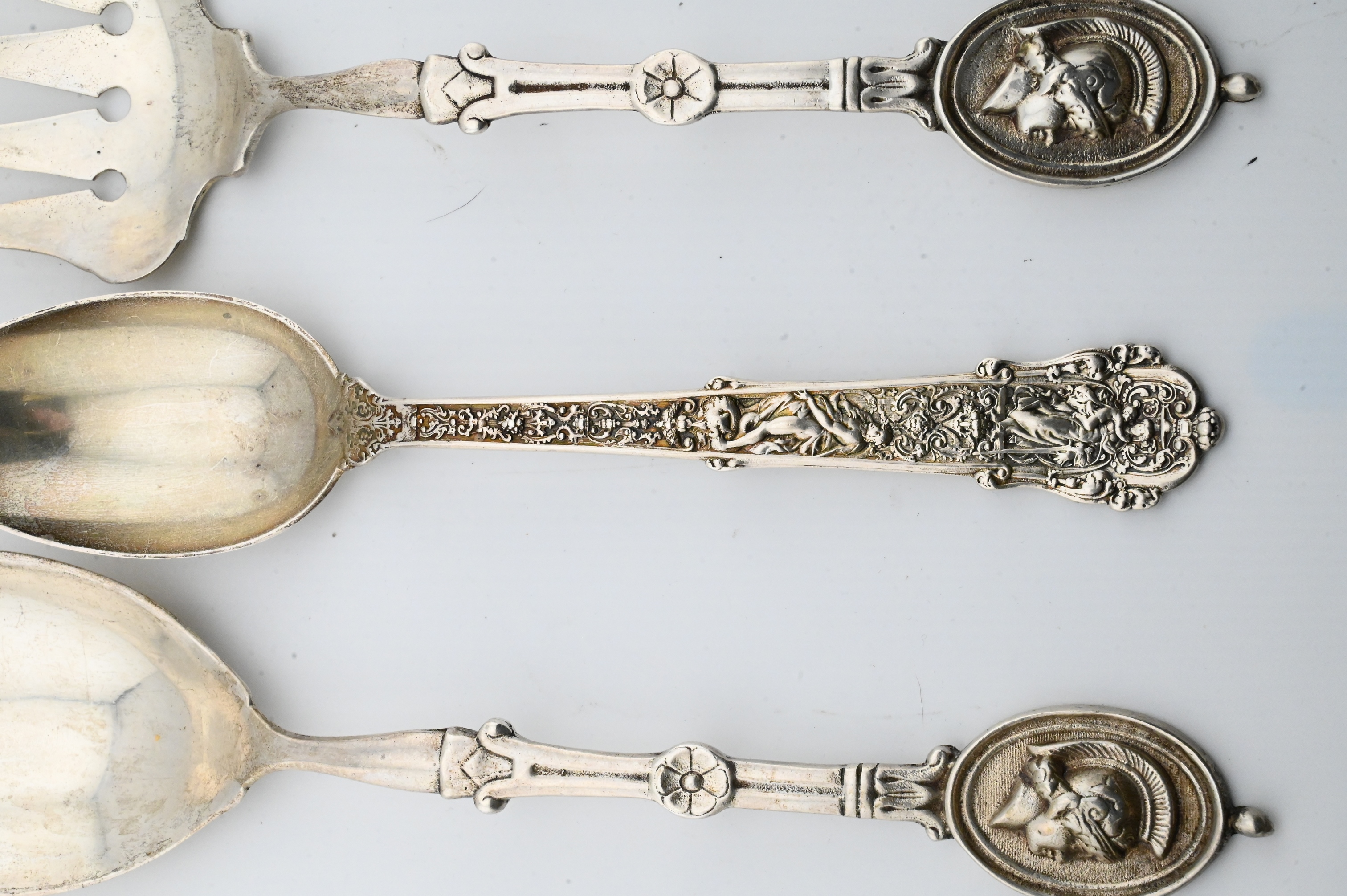 to include a pair of classical-motif servers with helmeted warrior medallions at the terminals, each marked STERLING, the larger 10¼ inches long; together with one Gorham elaborately decorated sterling silver spoon featuring Renaissance-style relief figures and foliate scrollwork