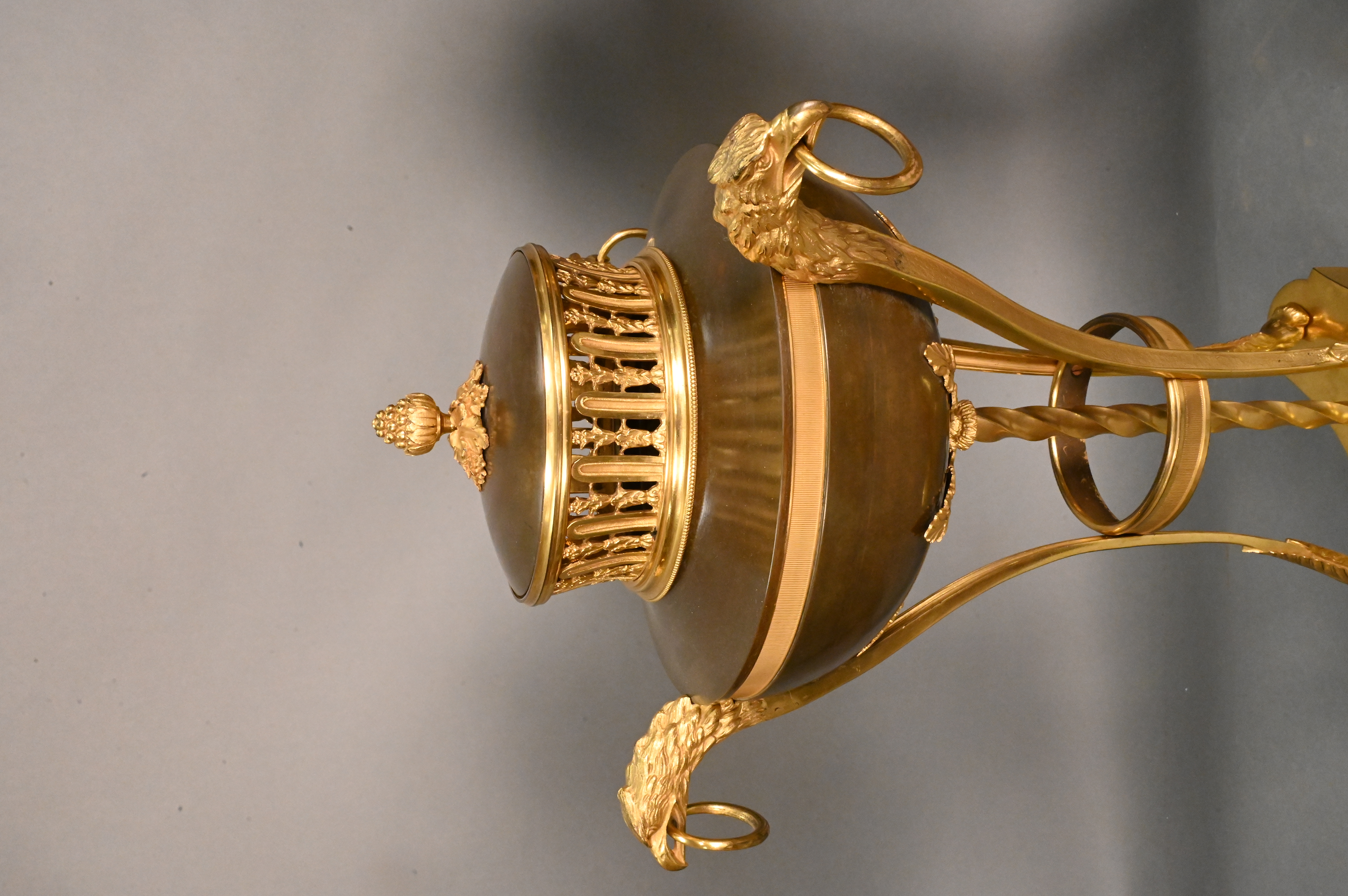 having patinated bronze ovoid bodies held with dore bronze supports, ending in eagle head handles on hoof feet and tripod base