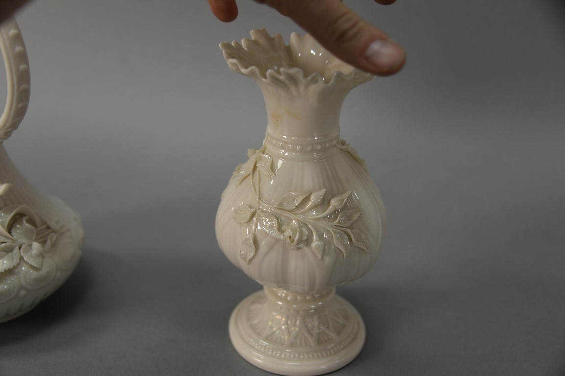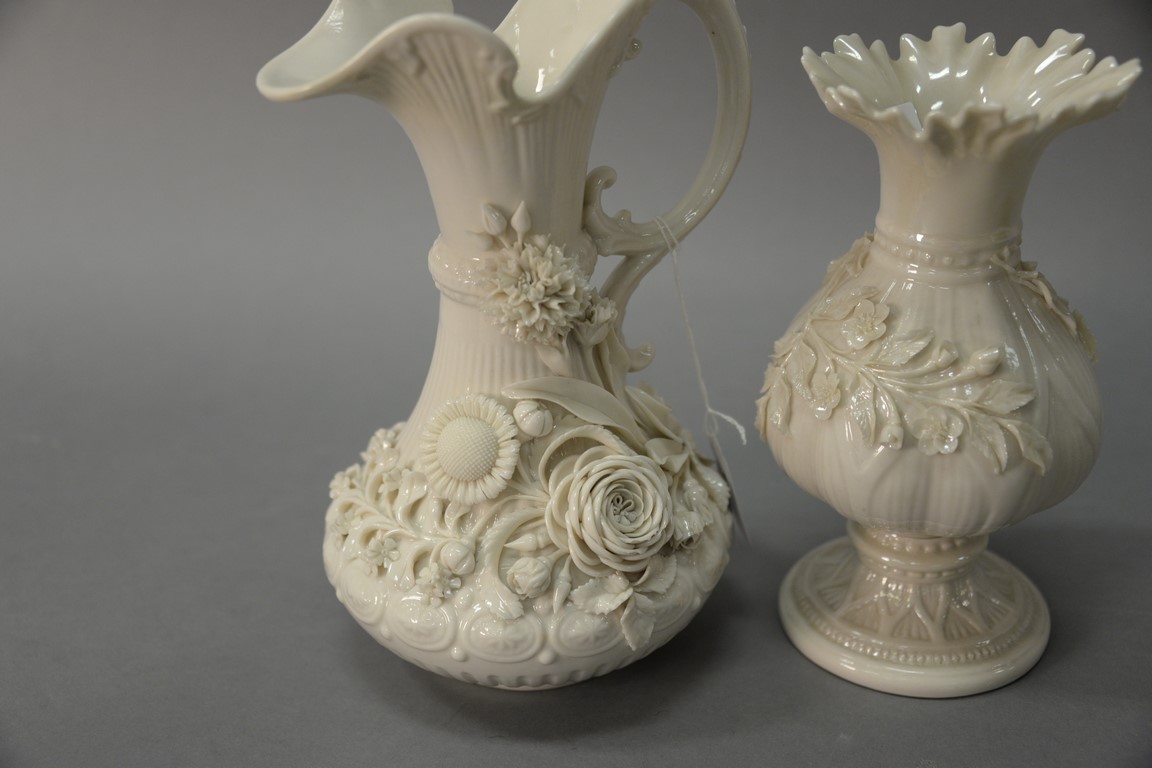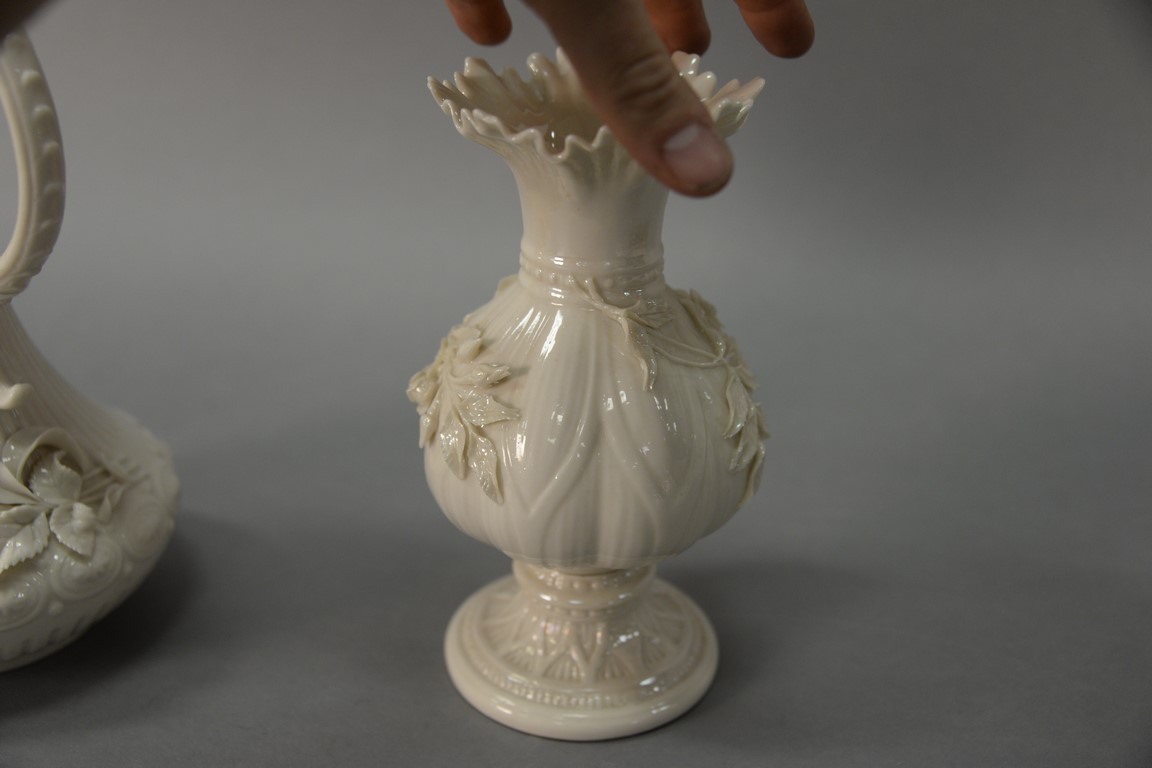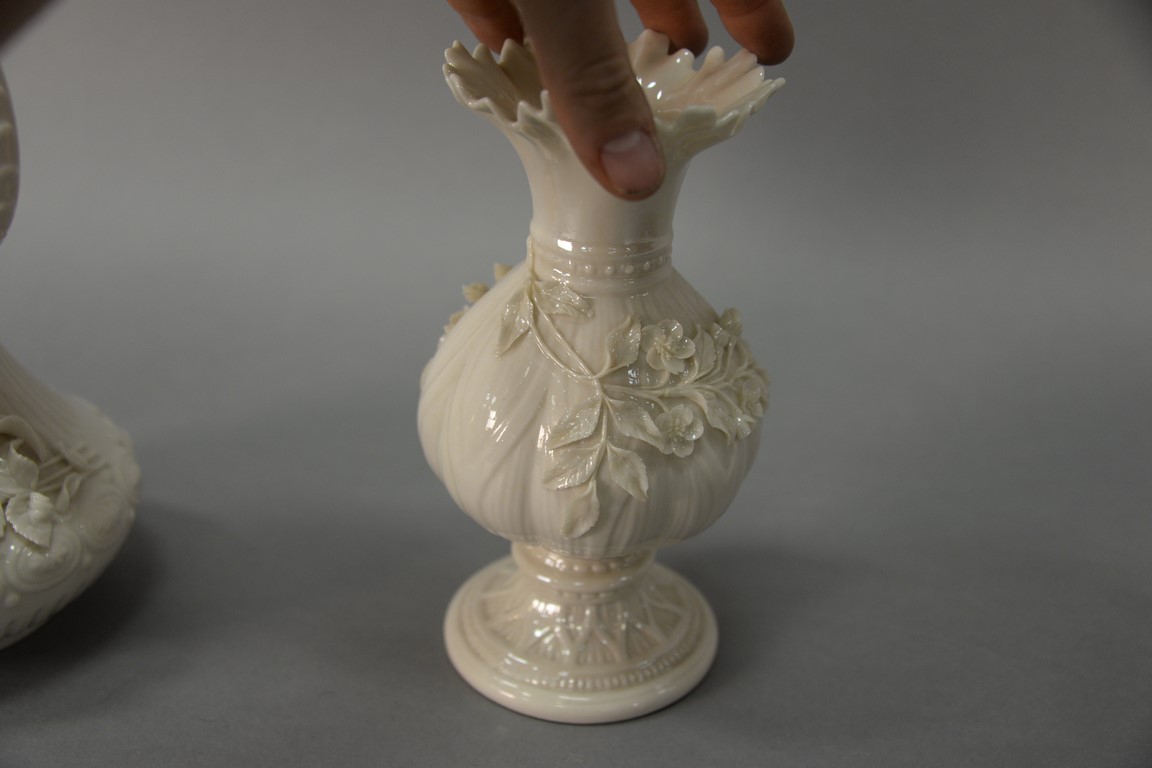 Two Belleek vases including Belleek Aberdeen vase with applied floral decoration and an Irish vase with applied flowers, both with black marks.