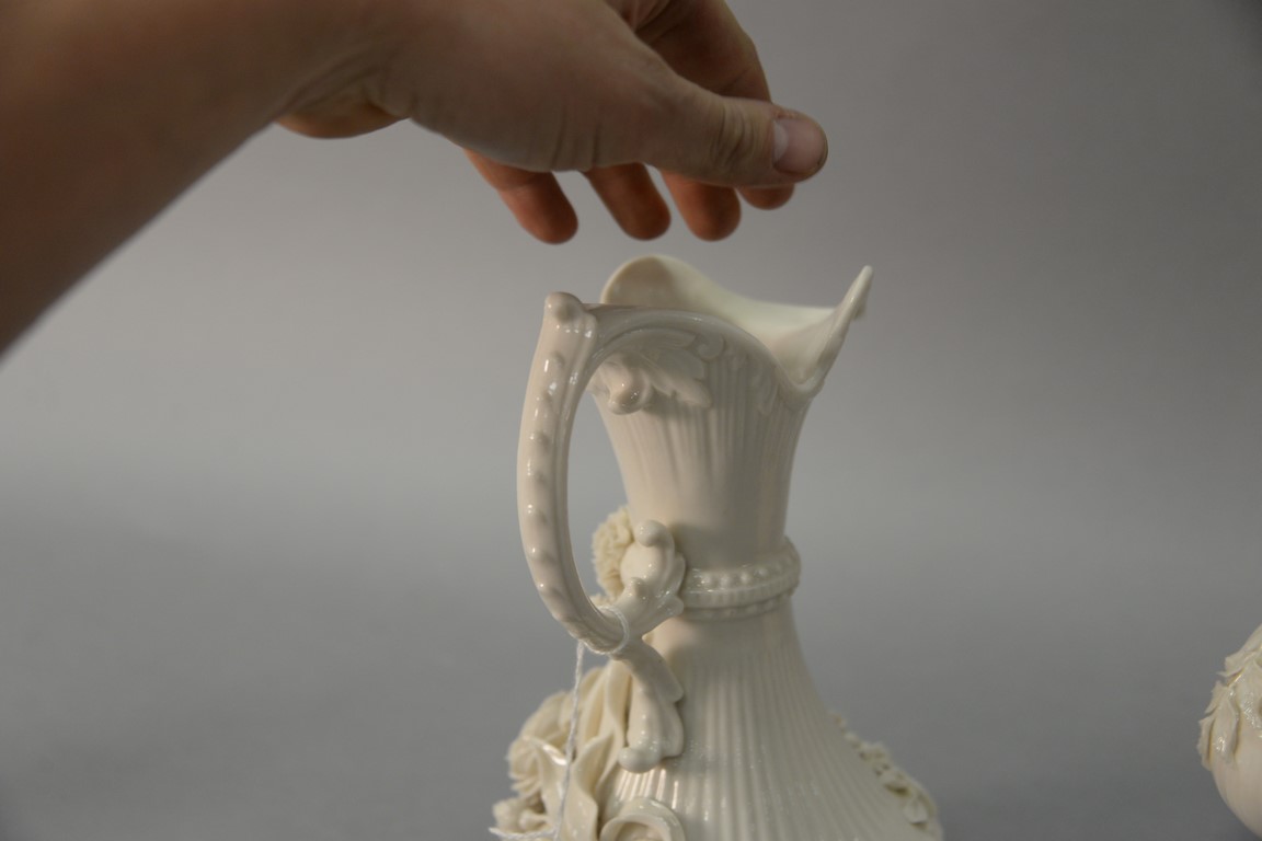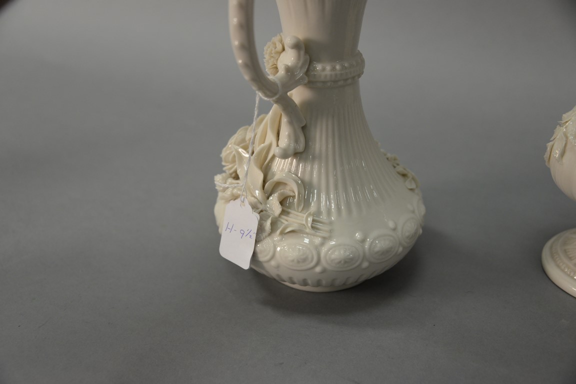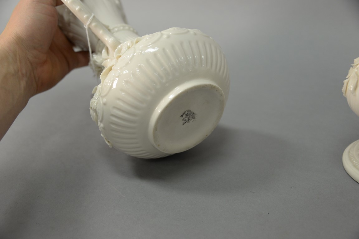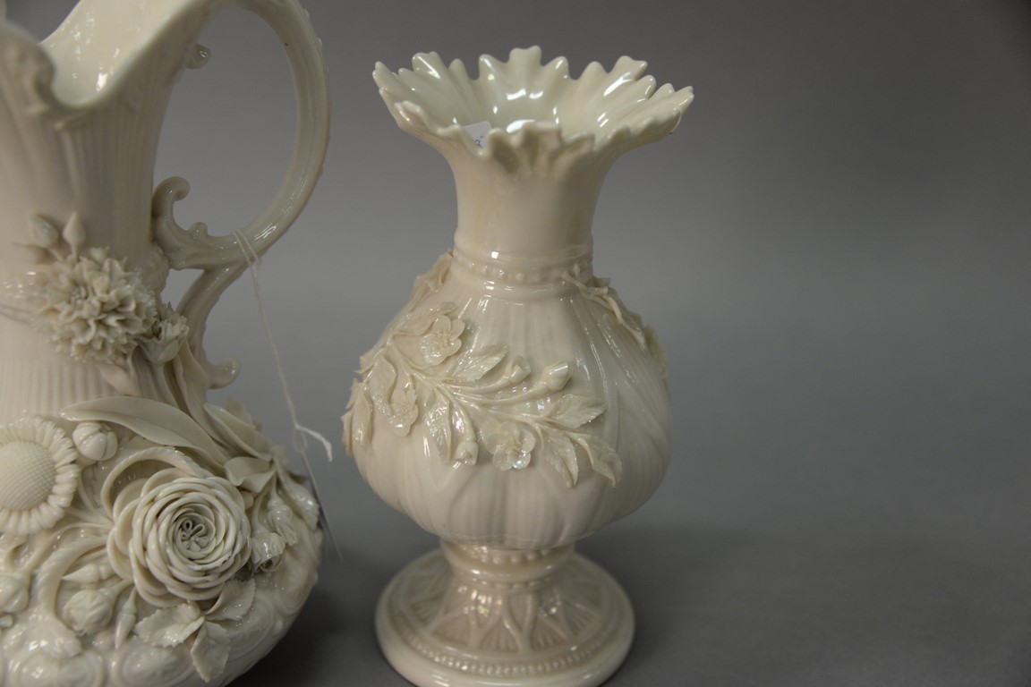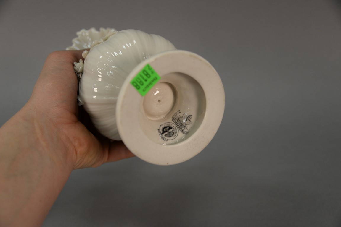 Lot 672: Two Belleek vases including Belleek Aberdeen vase with applied floral decoration and an Irish vase with applied flowers, both with b…