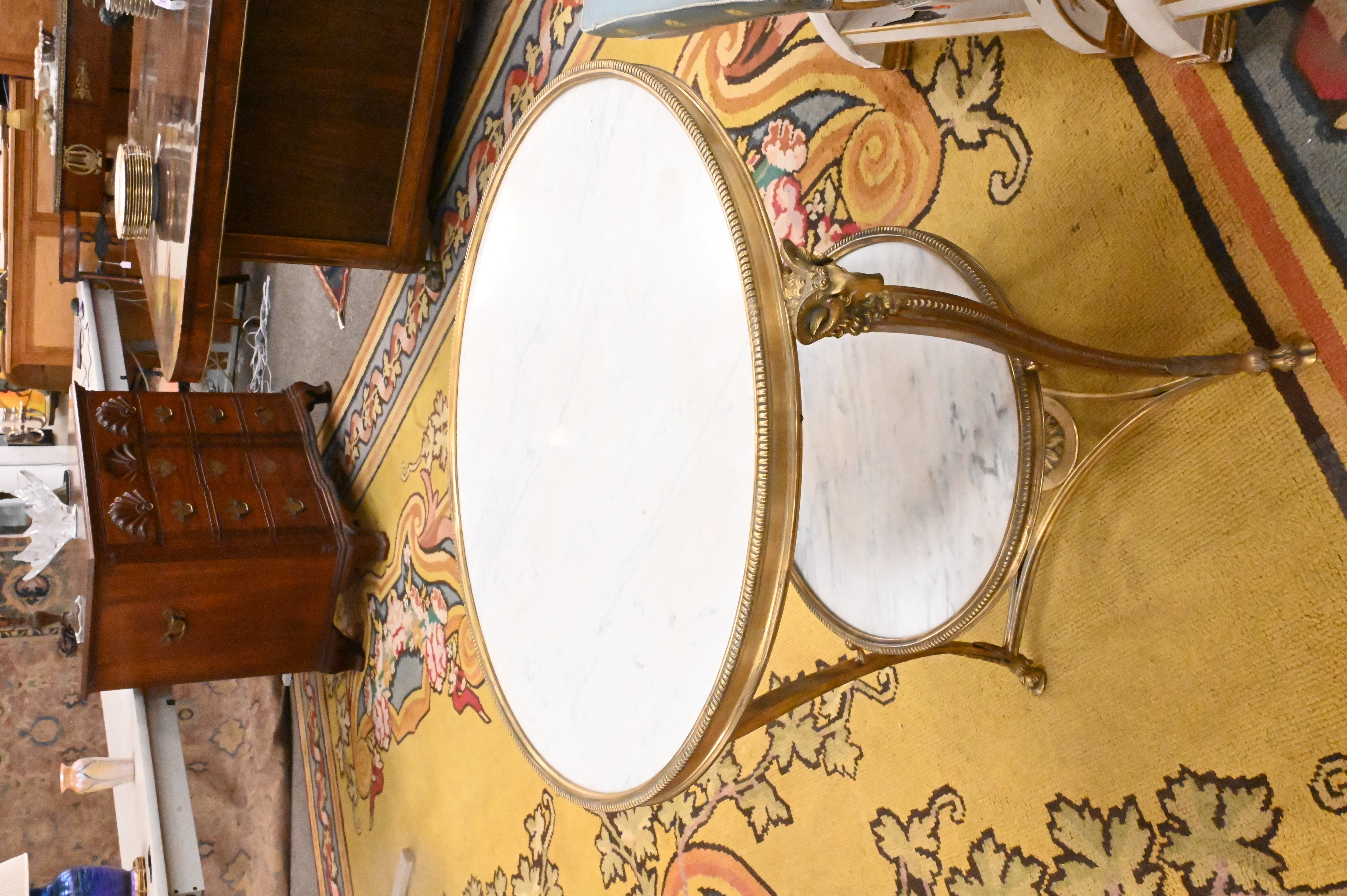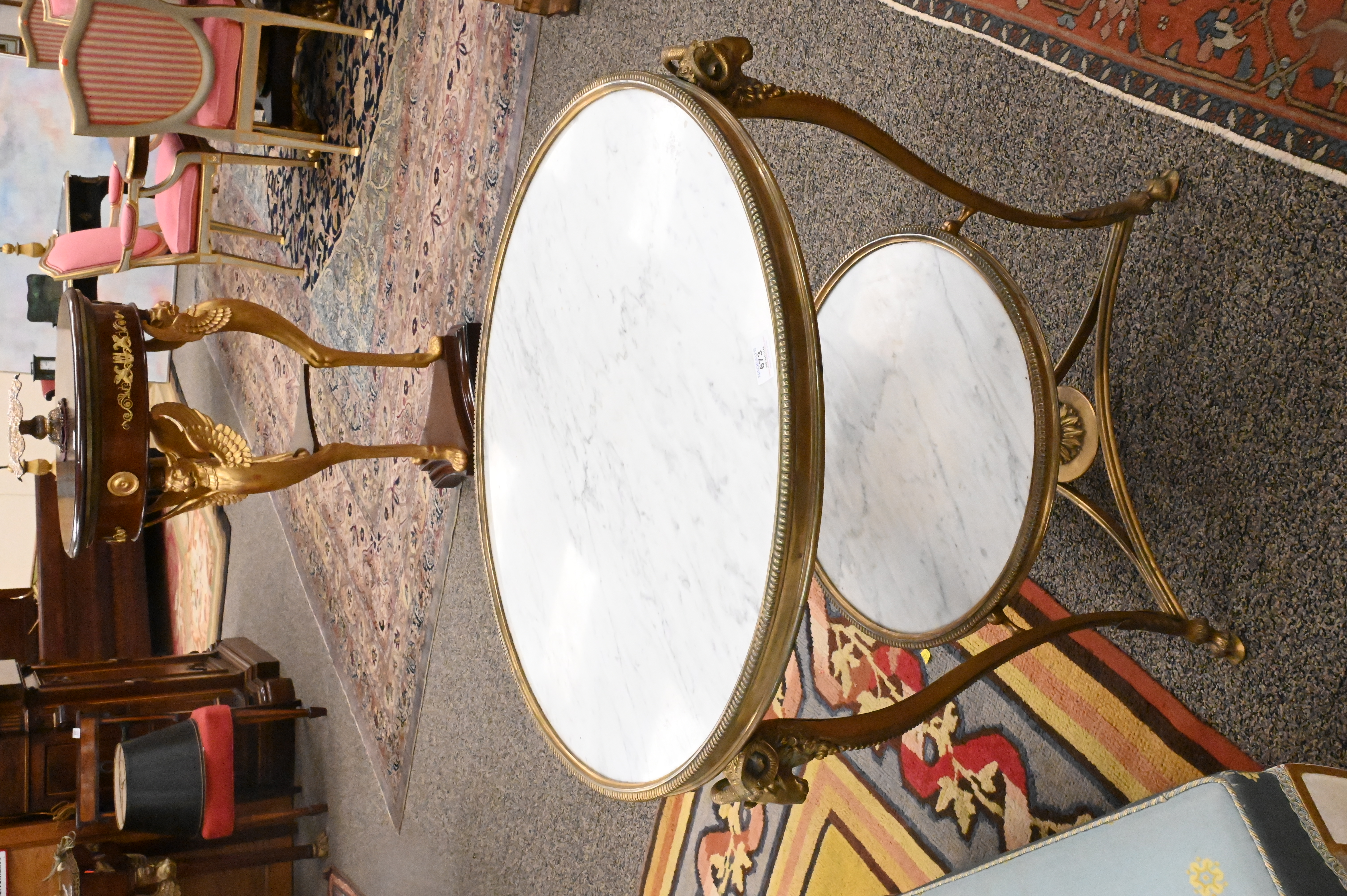 each circular white and grey-veined marble top with beaded rim, raised on ram’s mask monopodiae, united by a medial shelf and further shaped stretcher