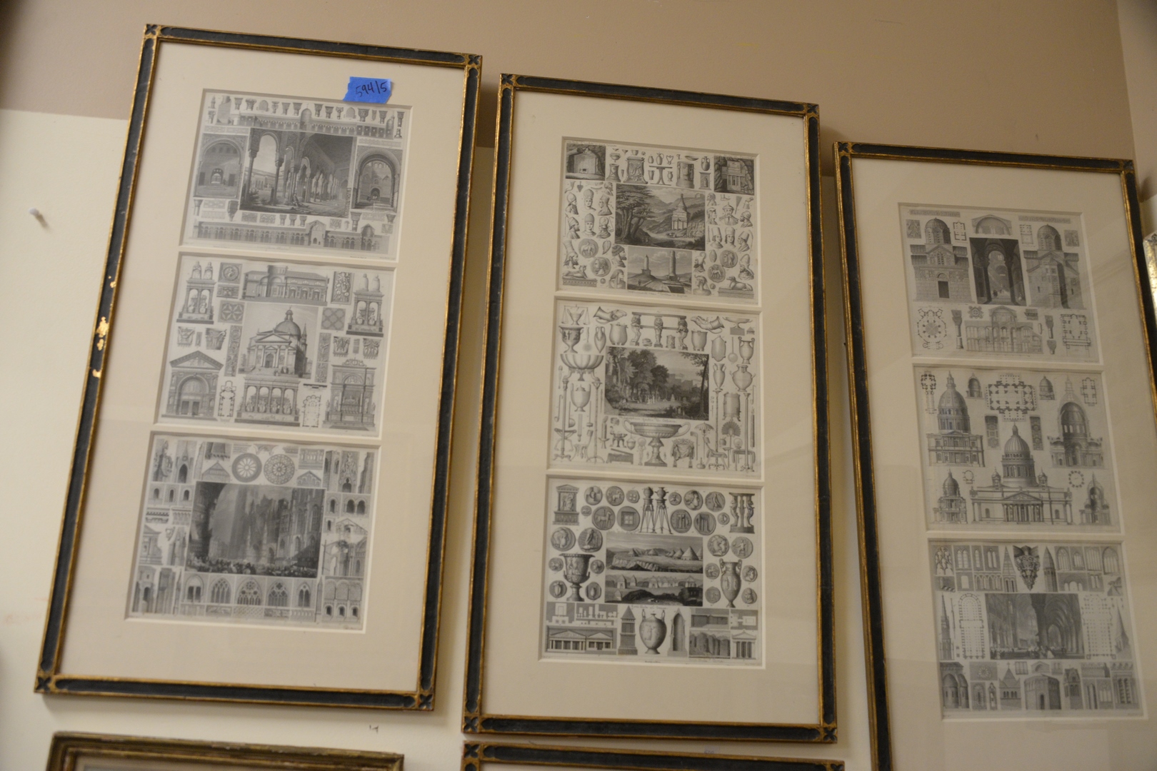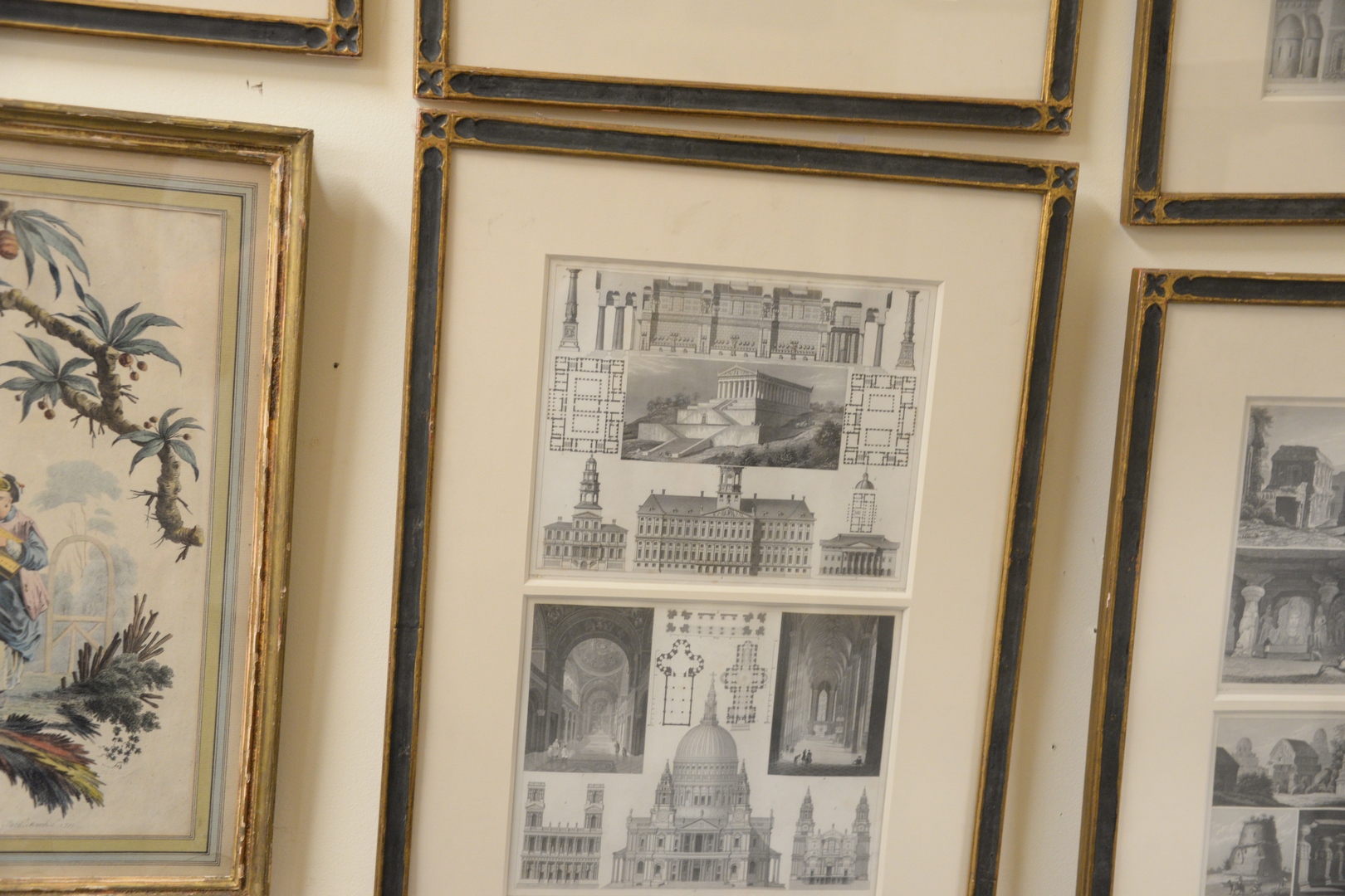 Nine Piece Framed Group, to include two European coats of arms charts two hand-colored engravings with Asian scenes, signed P.C. Canot, along with five framed groupings of architectural designs, each inscribed Henry Winkles and G. Heck in the lower margins.
