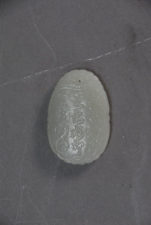 Small celadon jade pendent with incised scholar figure on one side and characters on the other. ht. 2in. wd. 1 1/2in.