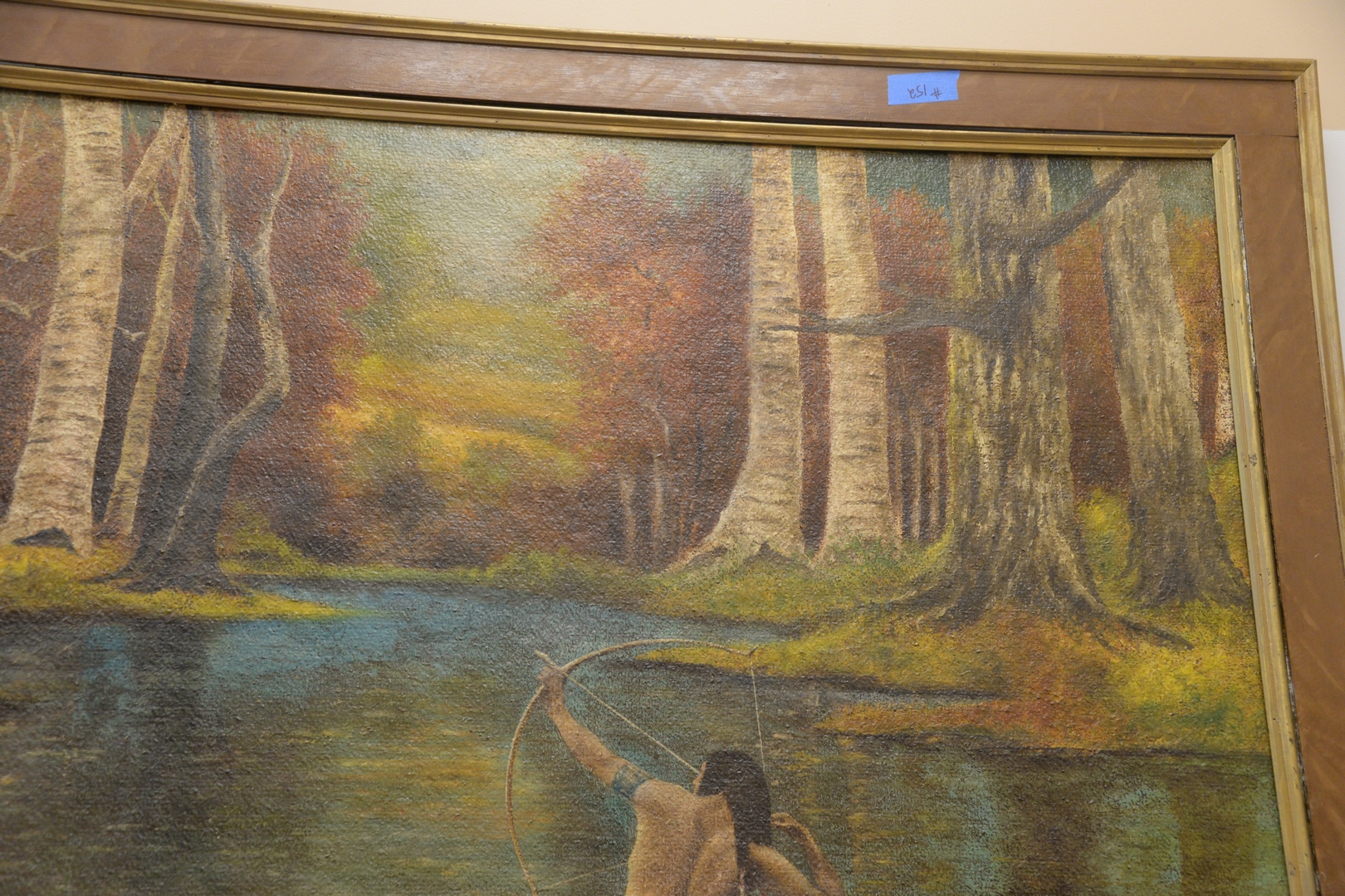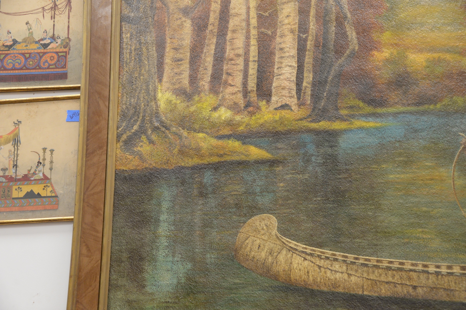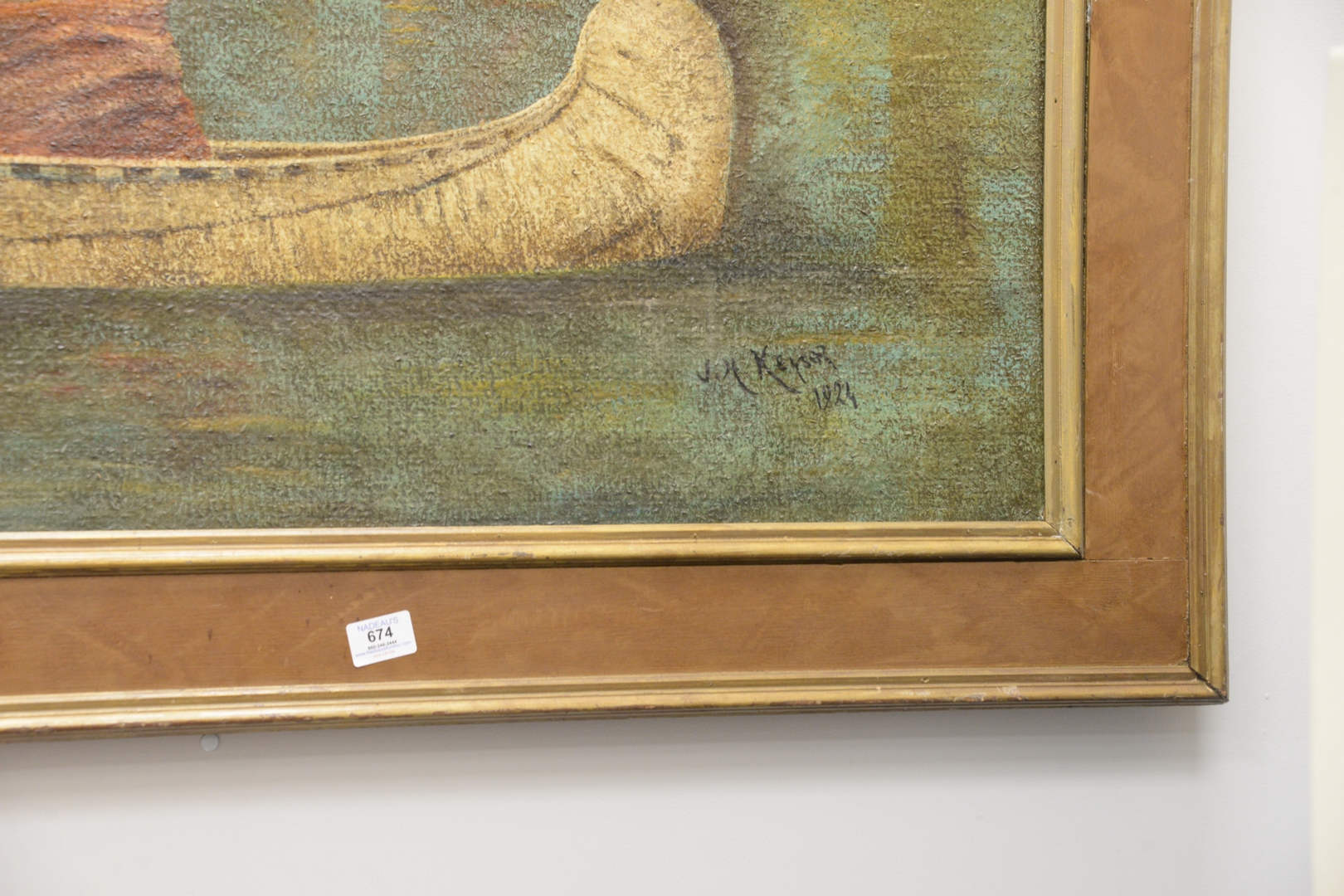 James H. Keys American, 20th century, Native American in a canoe, oil on board, signed and dated lower right J.H. Keys, 1924, height 45 inches, width 67 inches.