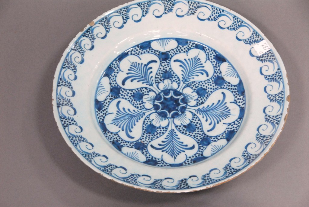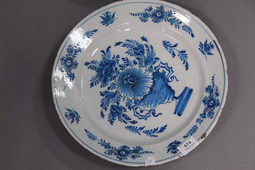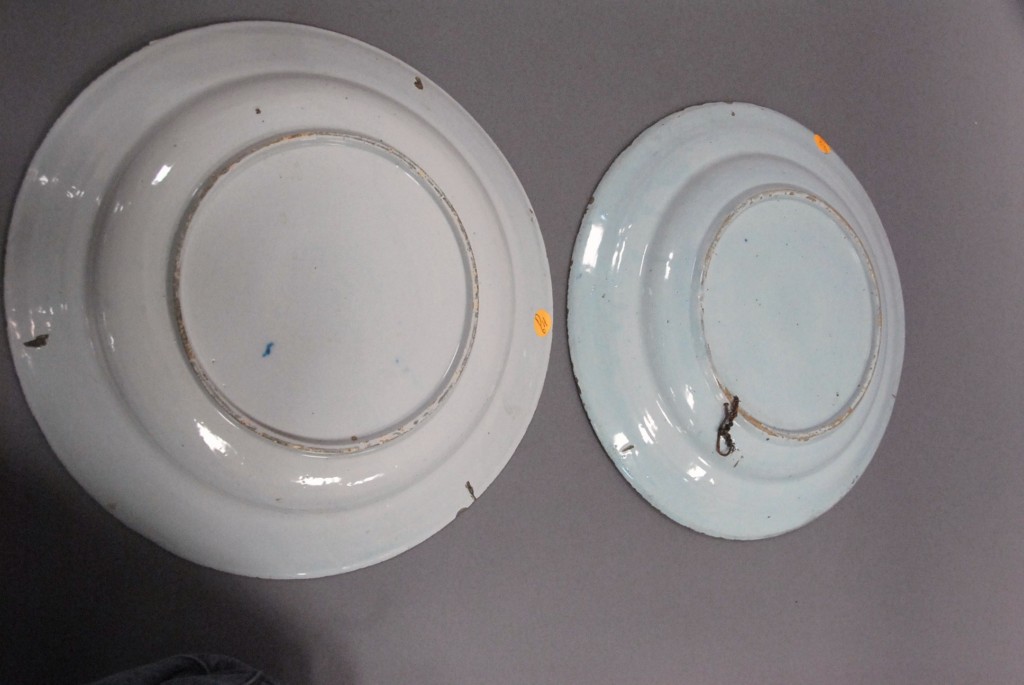 Two Delft blue and white chargers small chips. – dia. 13 1/2in. & 14in.