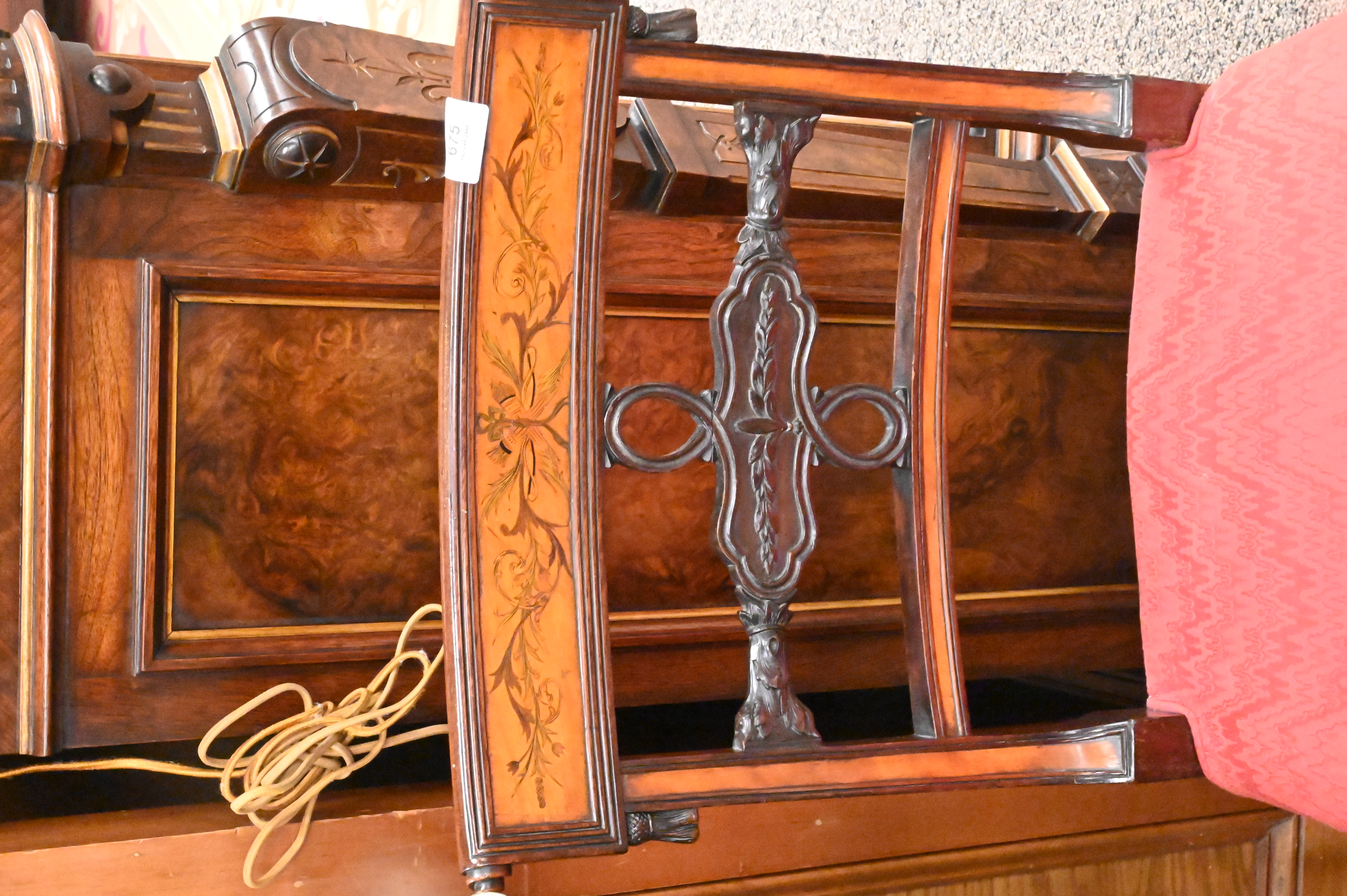 each with a strapwork cruciform splat beneath a crestrail inlaid with trailing vines, the seat in a burgundy and bargello patterned fabric, along with square tapering legs, 19th century