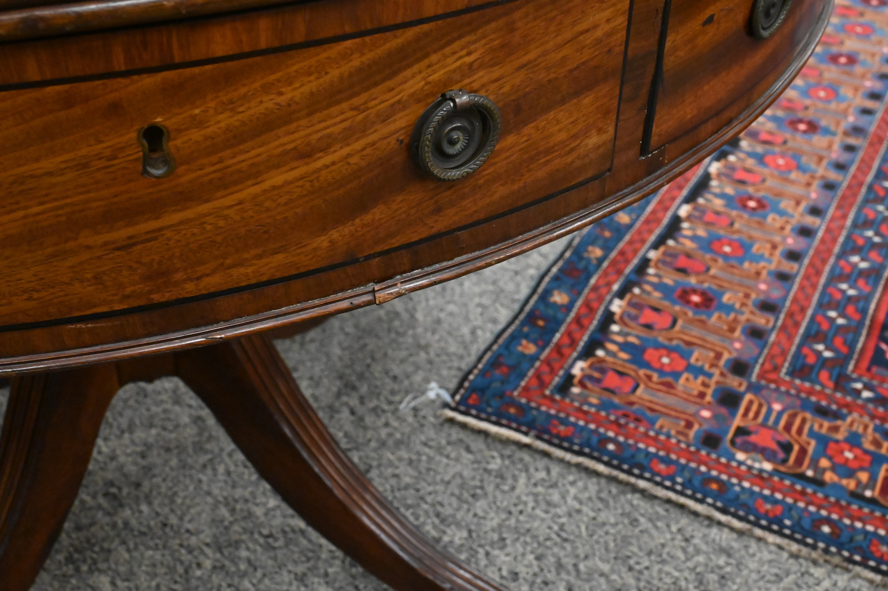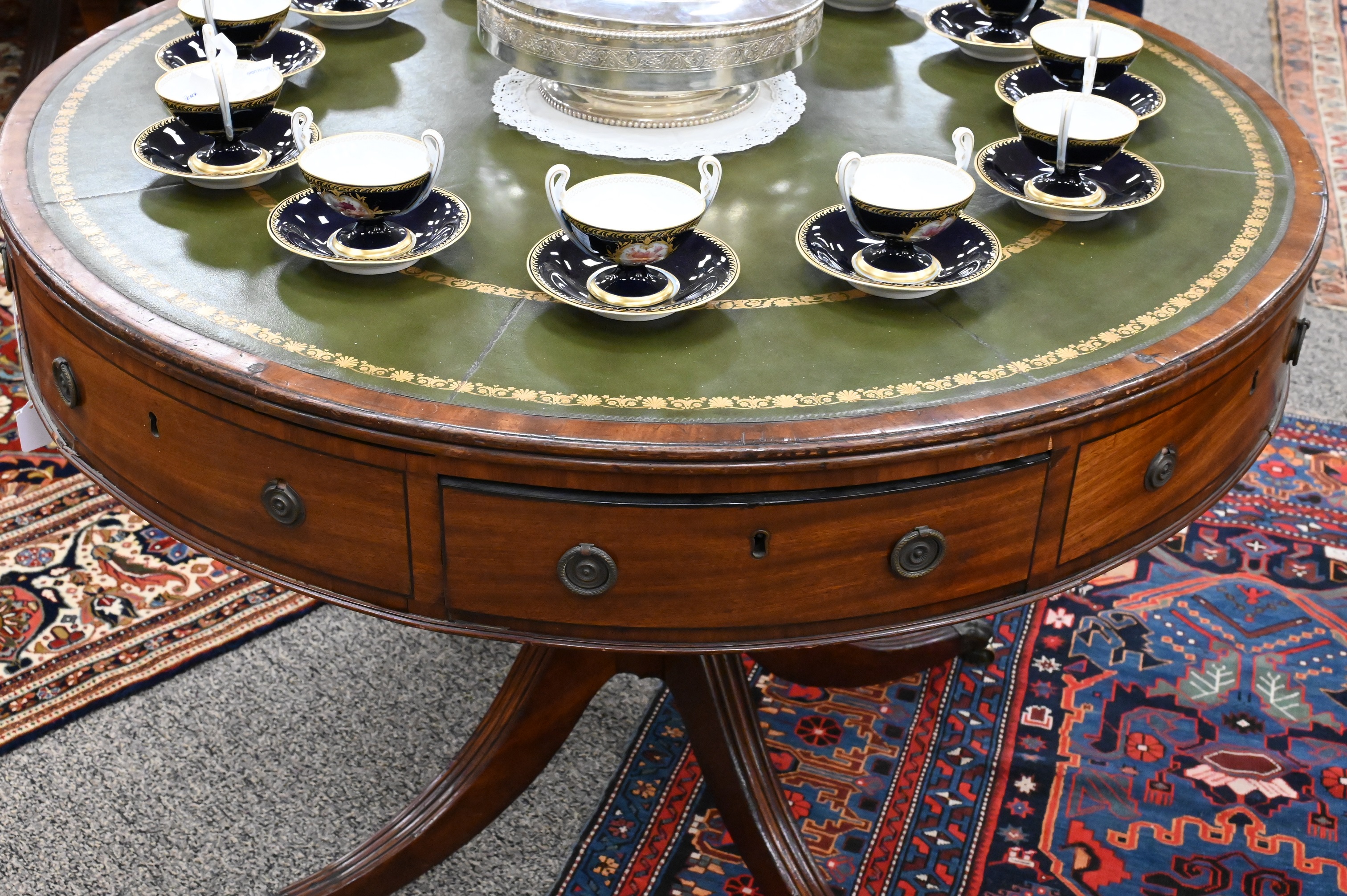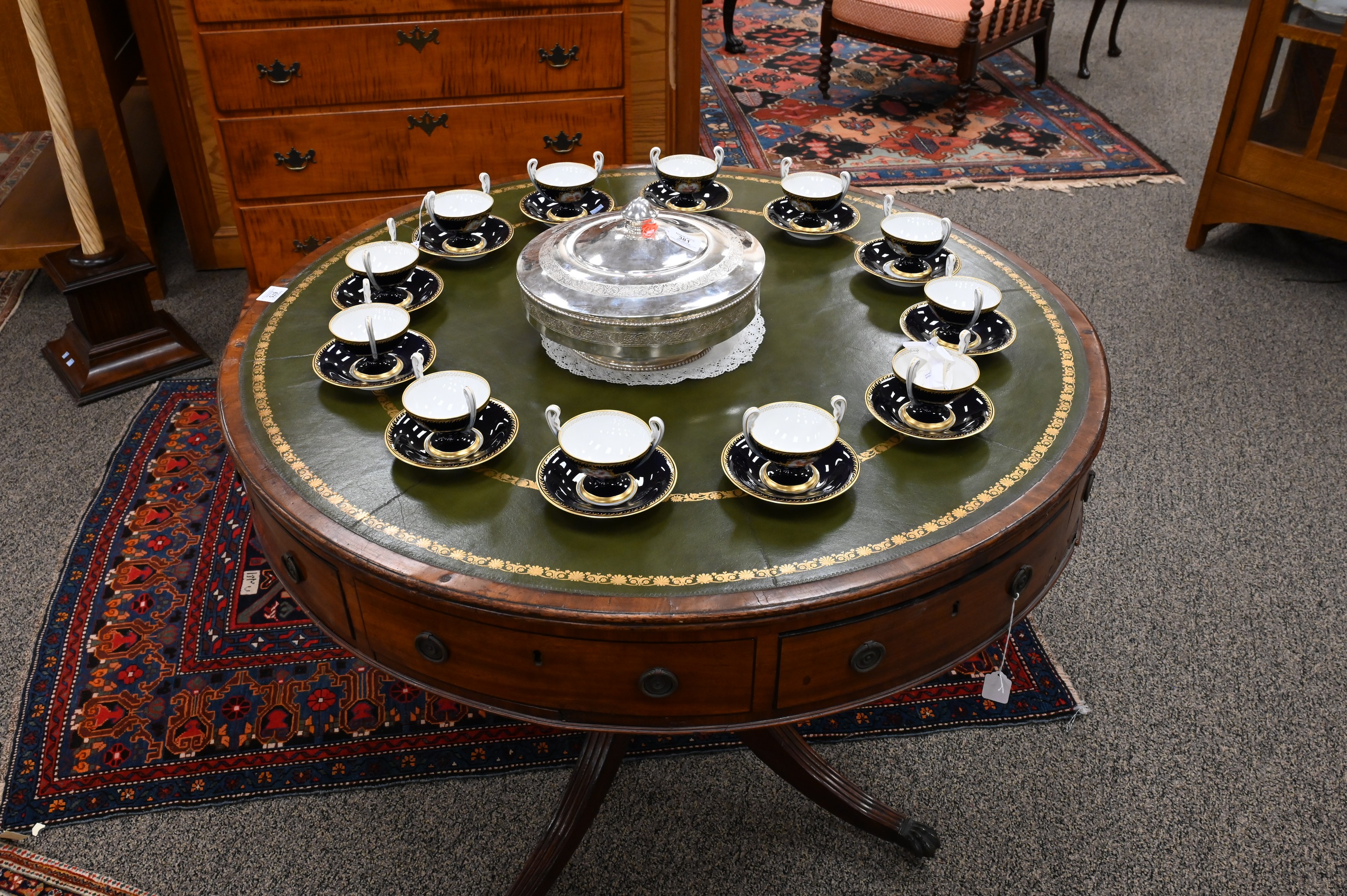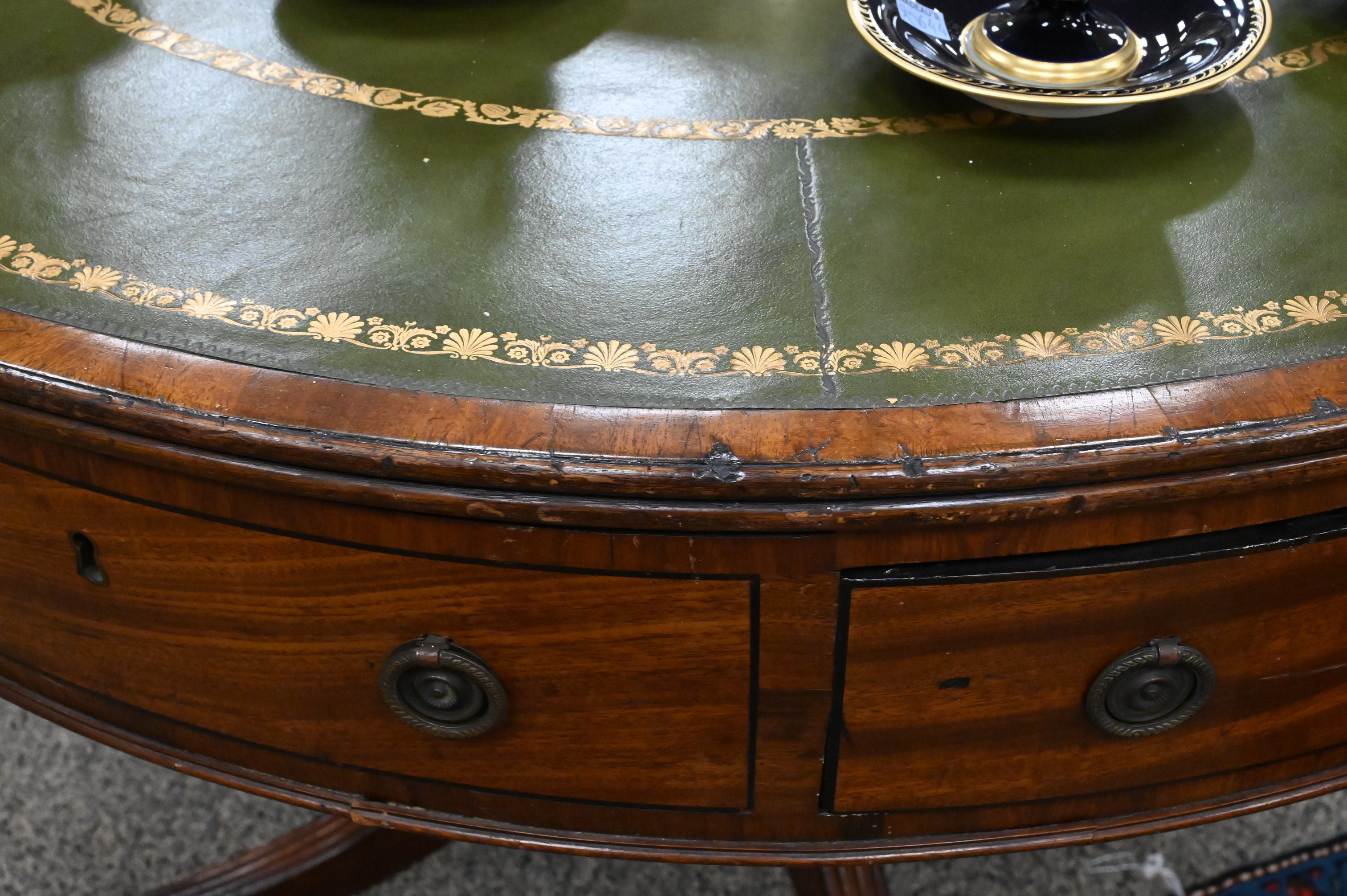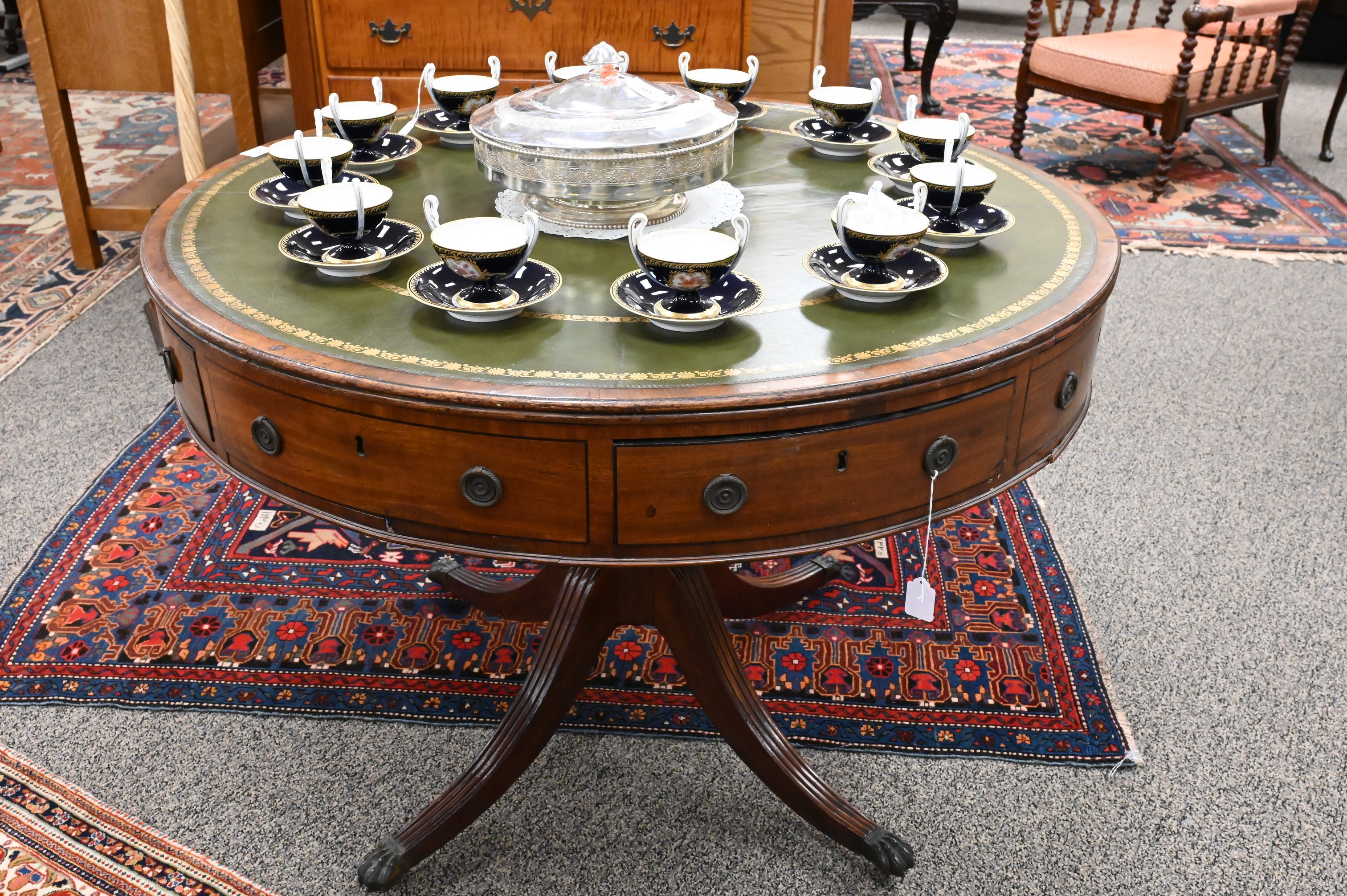 Condition: Presents well, very minor wear top leather surface, wear to edge of table, repairs to molding under drawers, one leg repaired near foot.