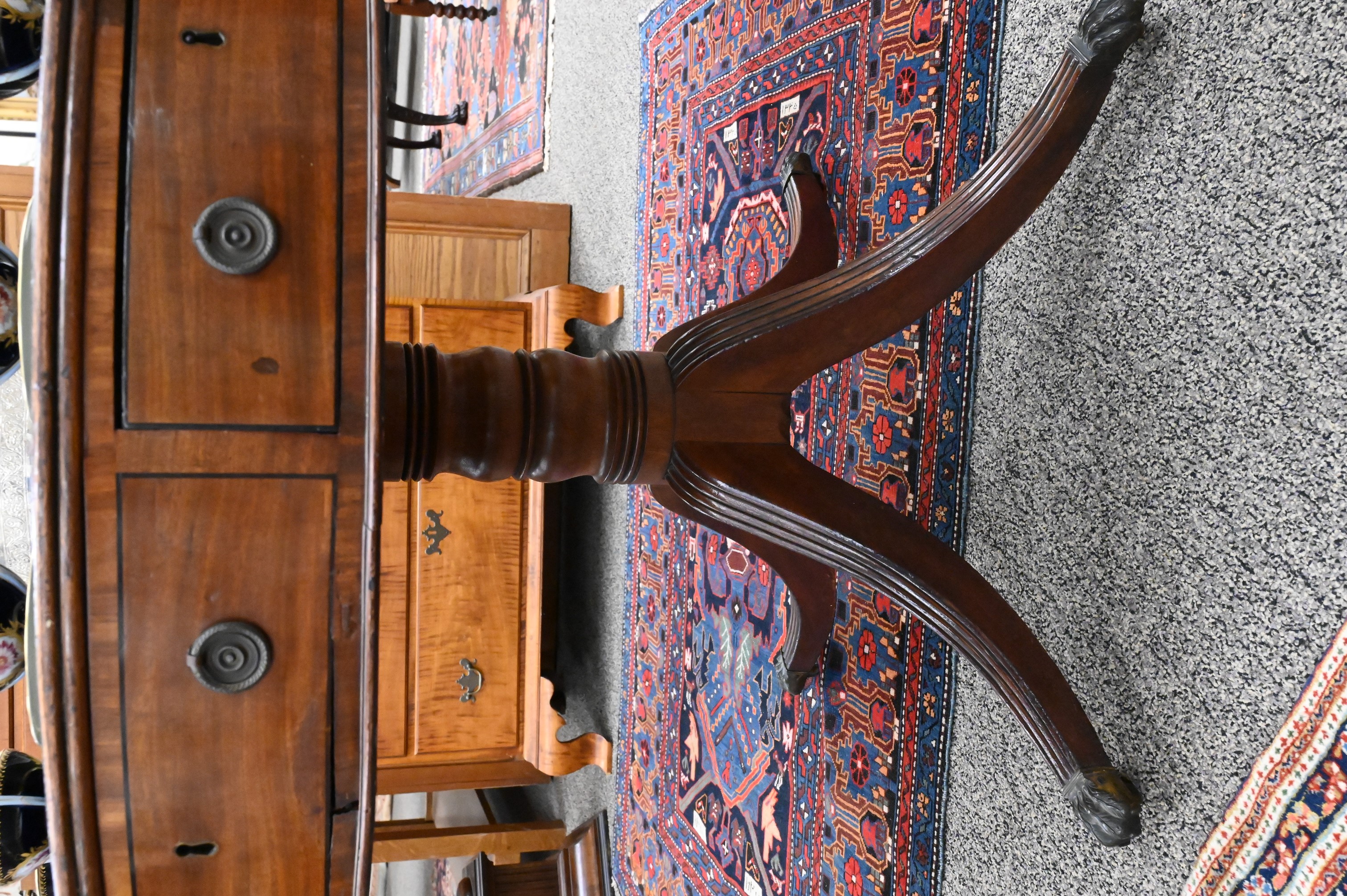 having green leather top, four drawers, and four false drawers on turned pedestal, set on four downswept members and brass paw feet