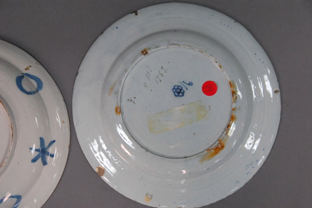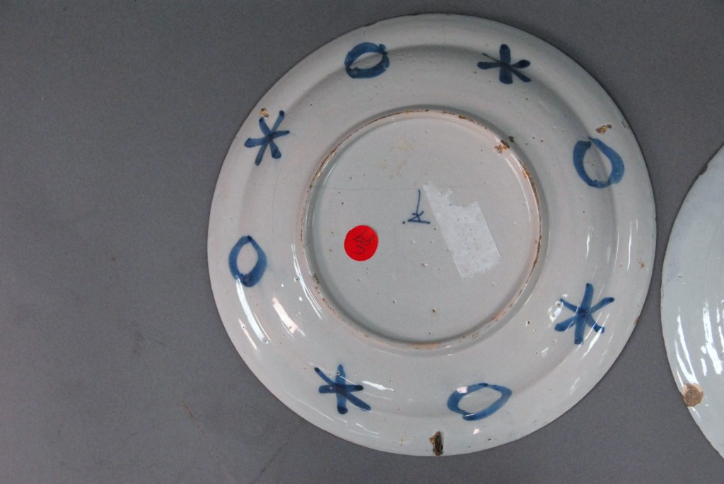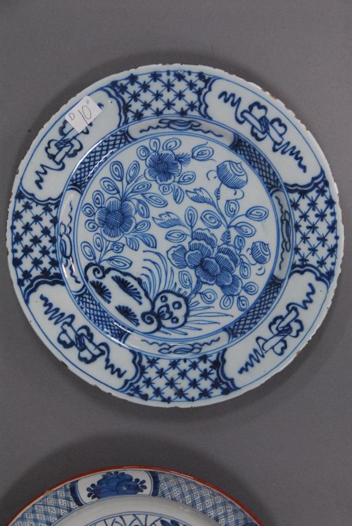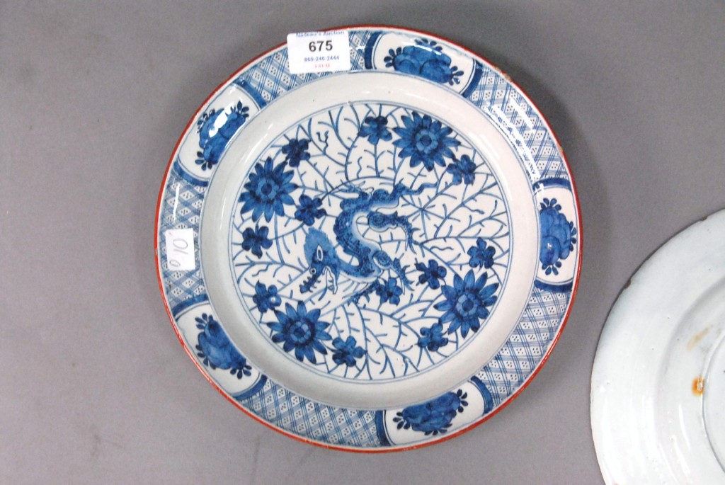 Two Delft plates, one with blue dragon. – dia. 10in.