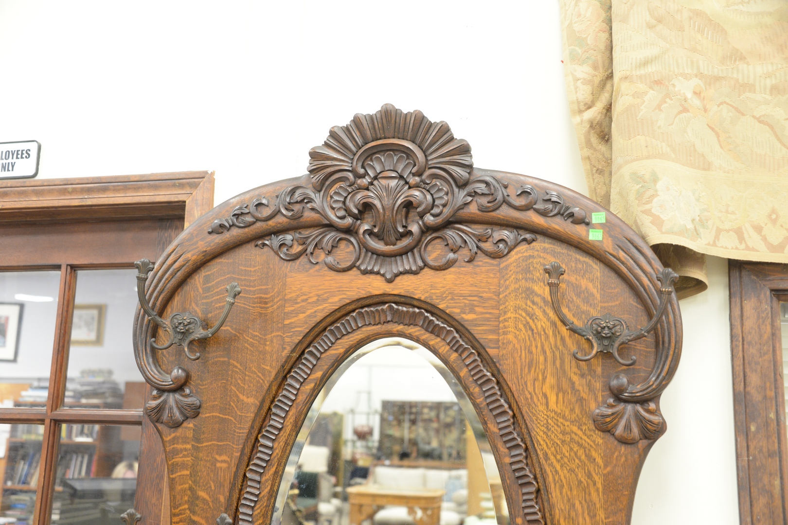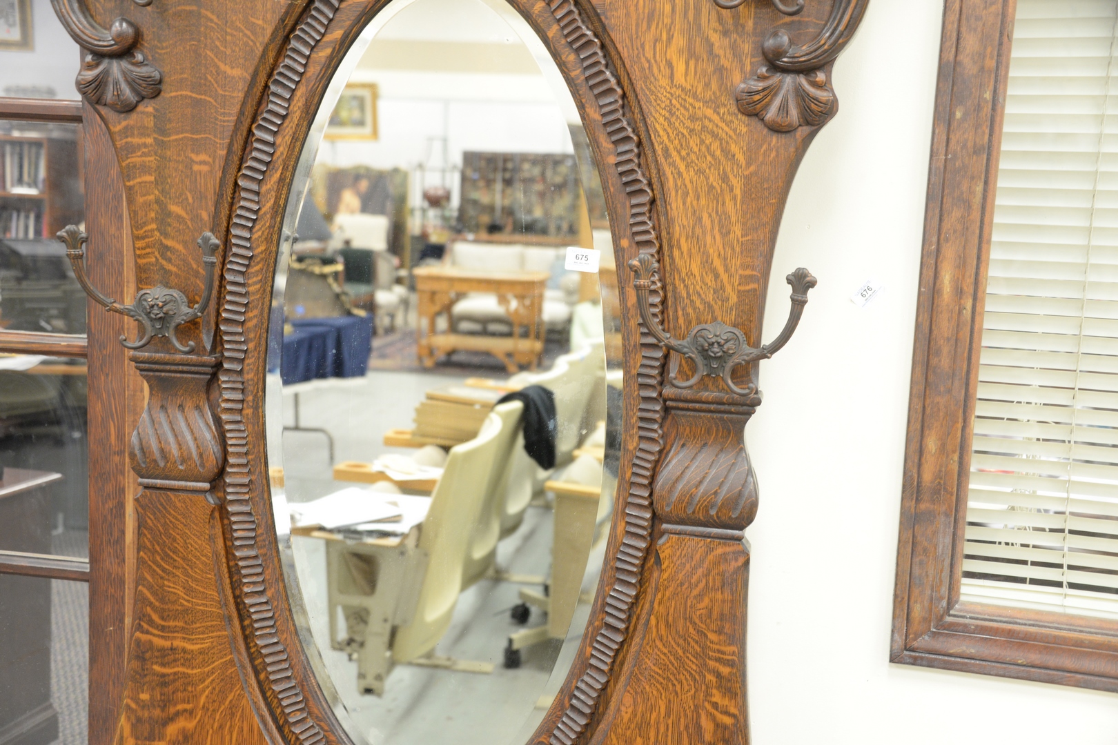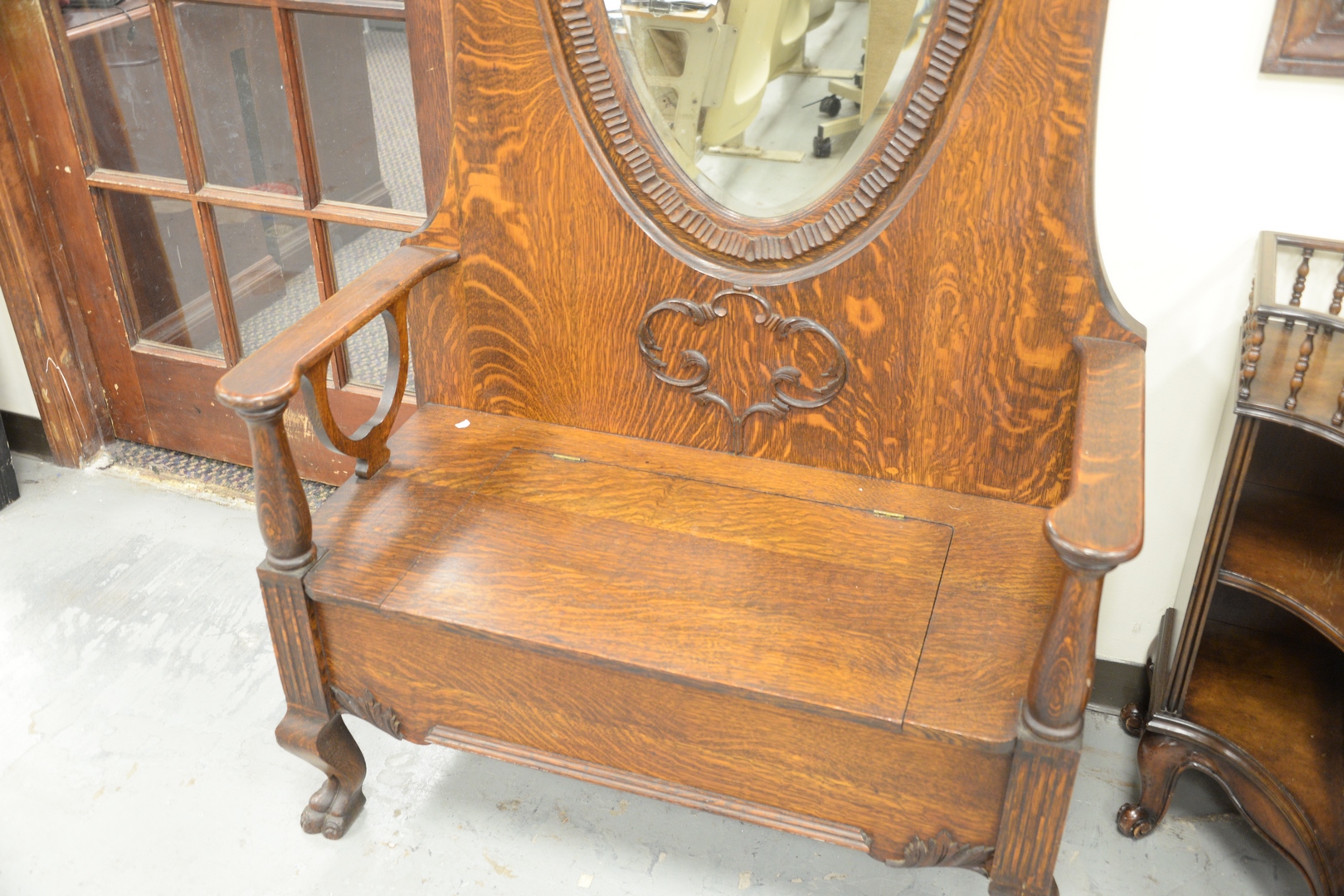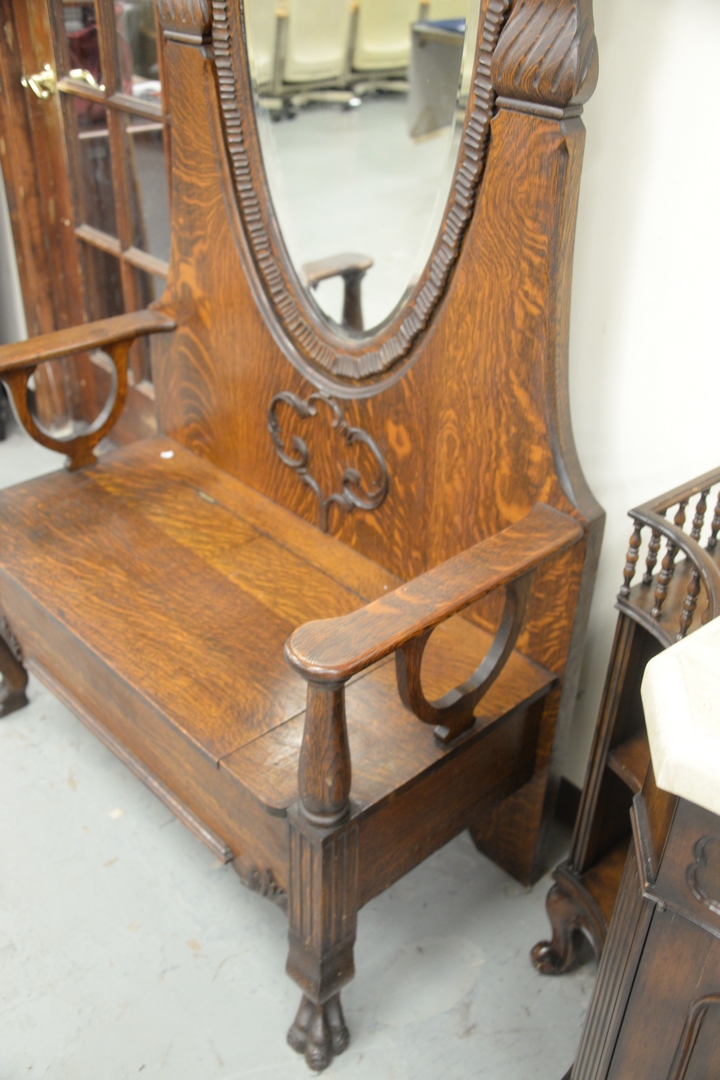 Lot 675: Victorian Quarter Sawn Oak Hall Rack, having oval beveled mirror lift seat and hoof feet, probably original finish, height 85 inches…