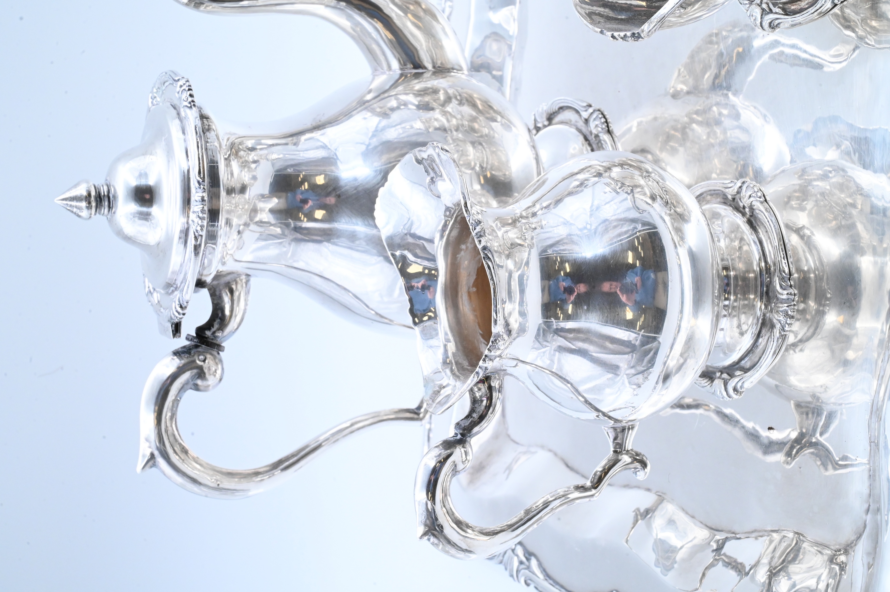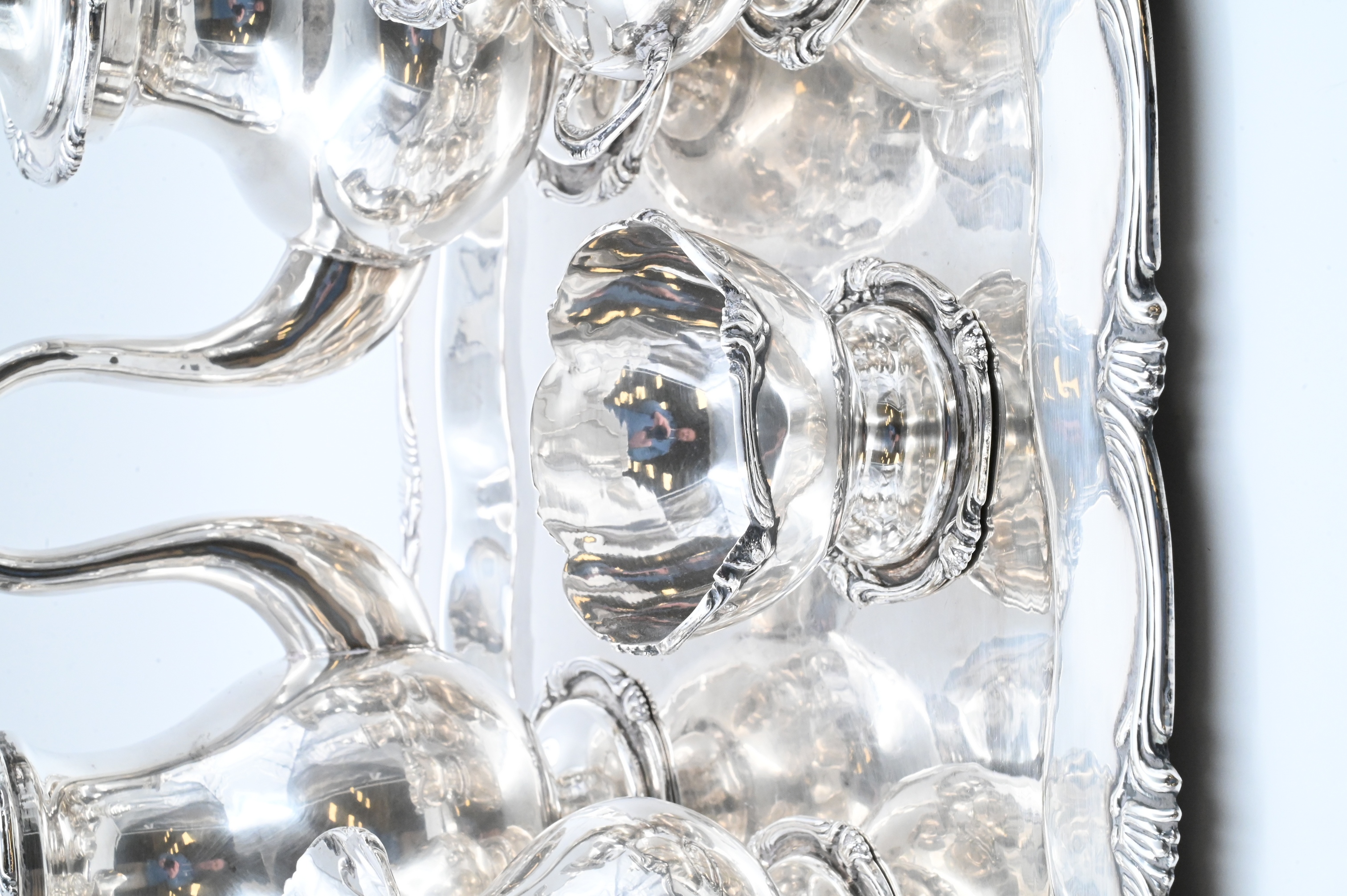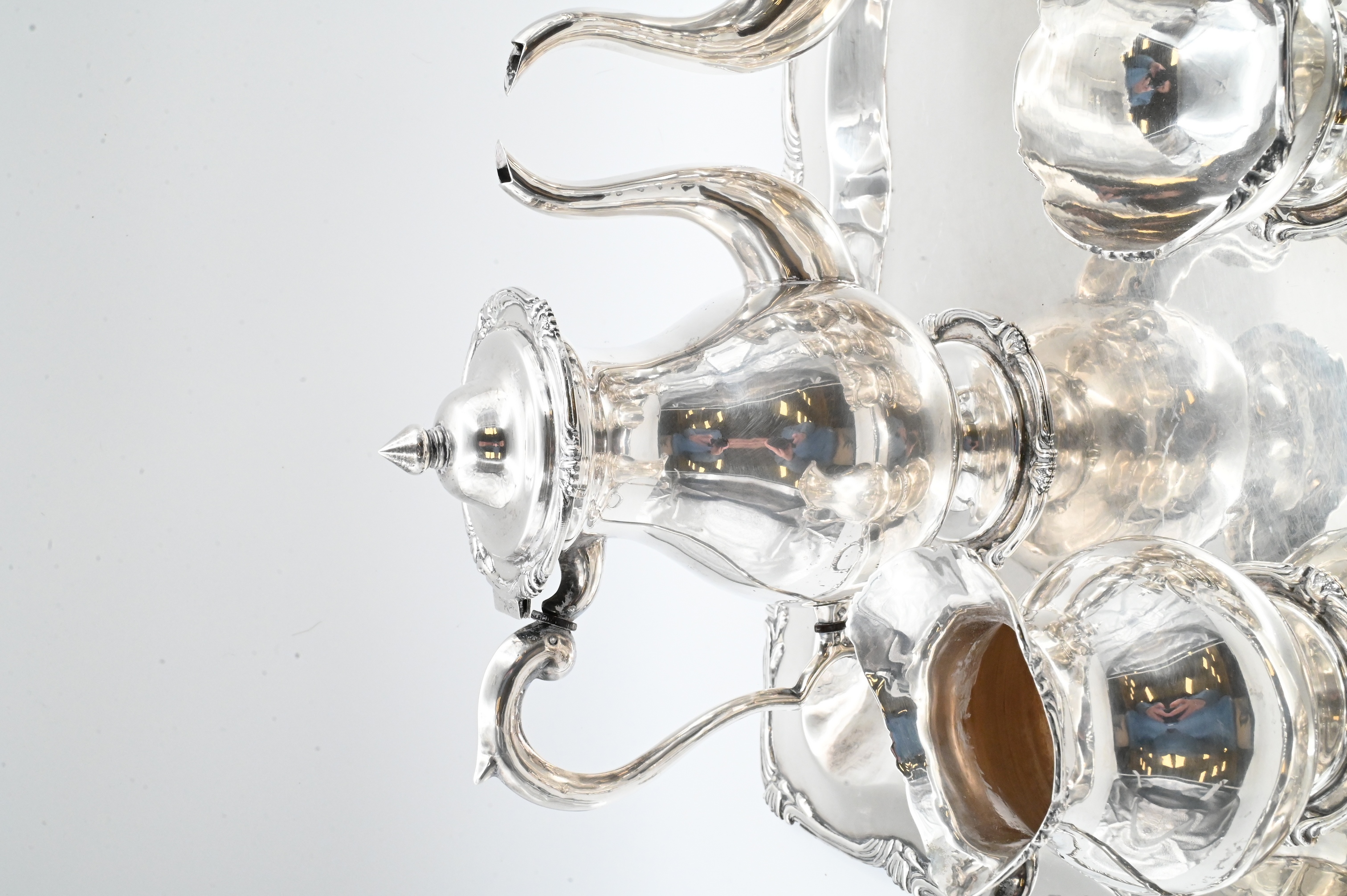 comprising a coffee pot (10 inches) , teapot (9 inches) , covered sugar bowl (6 inches), creamer (5 1/2 inches), waste bowl (3 inches) , and matching handled tray (15 3/4″ x 28″), each piece of bulbous form with scroll handles, shaped rims, and raised rocaille borders, all pieces marked 925