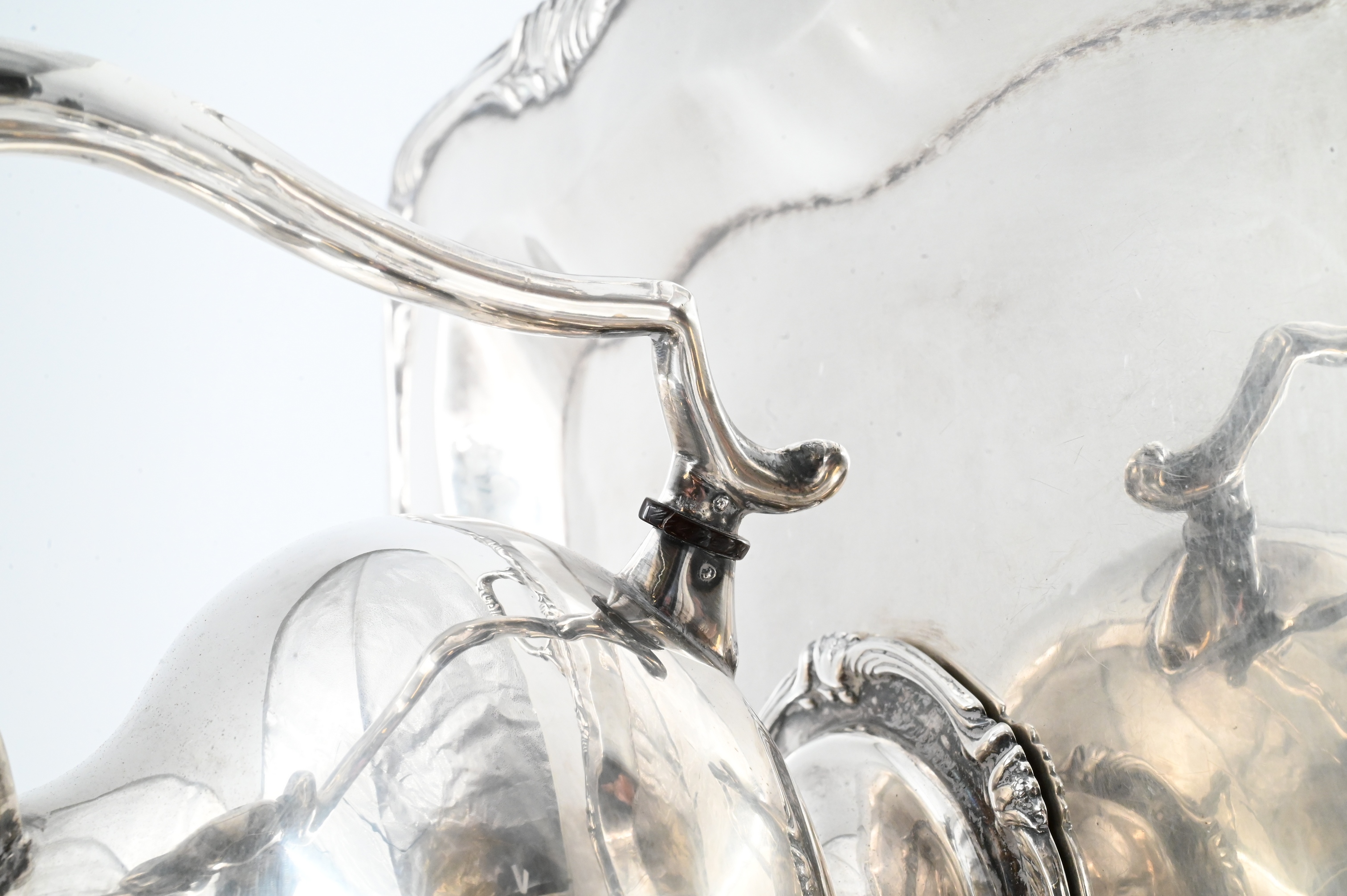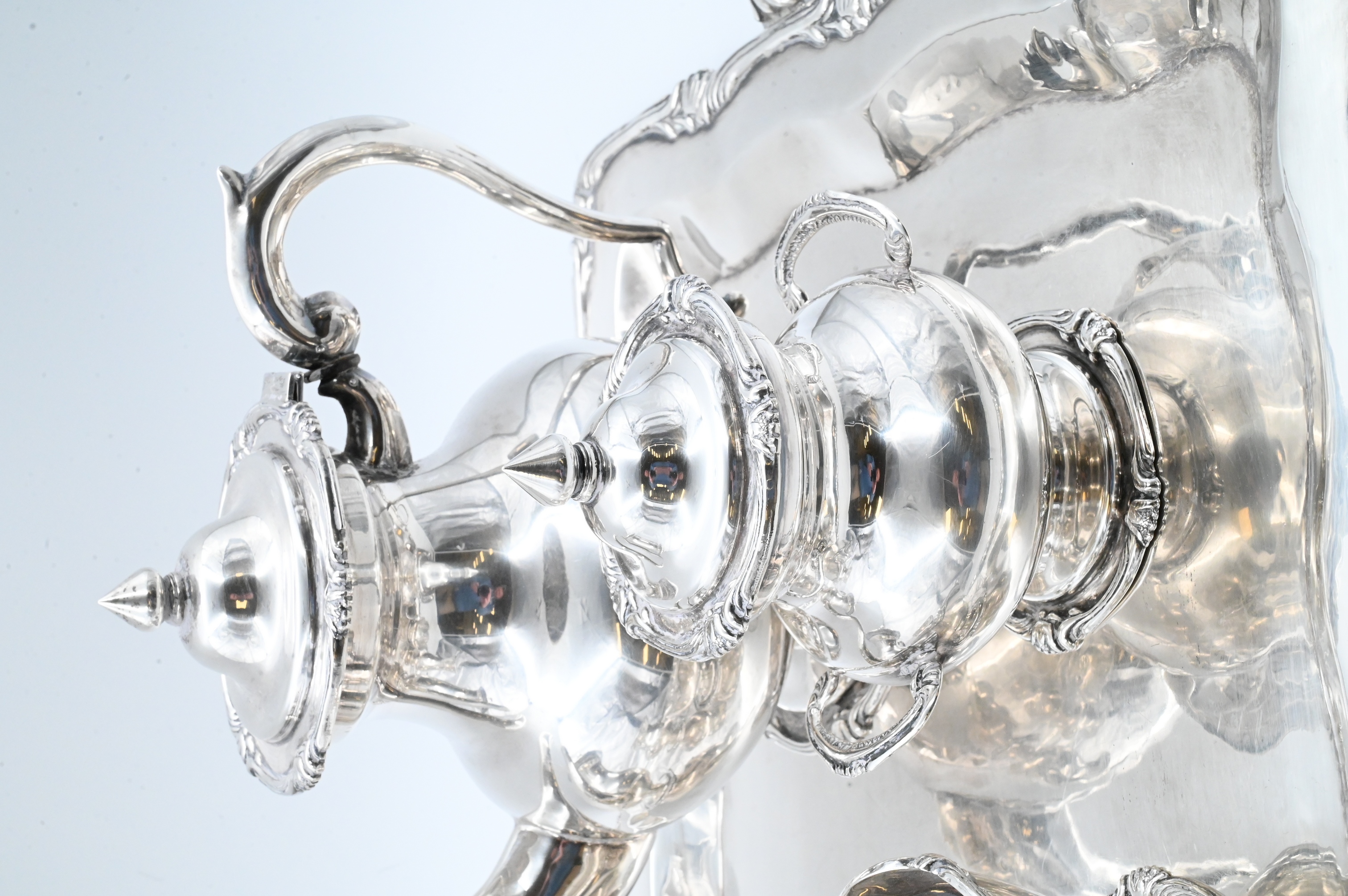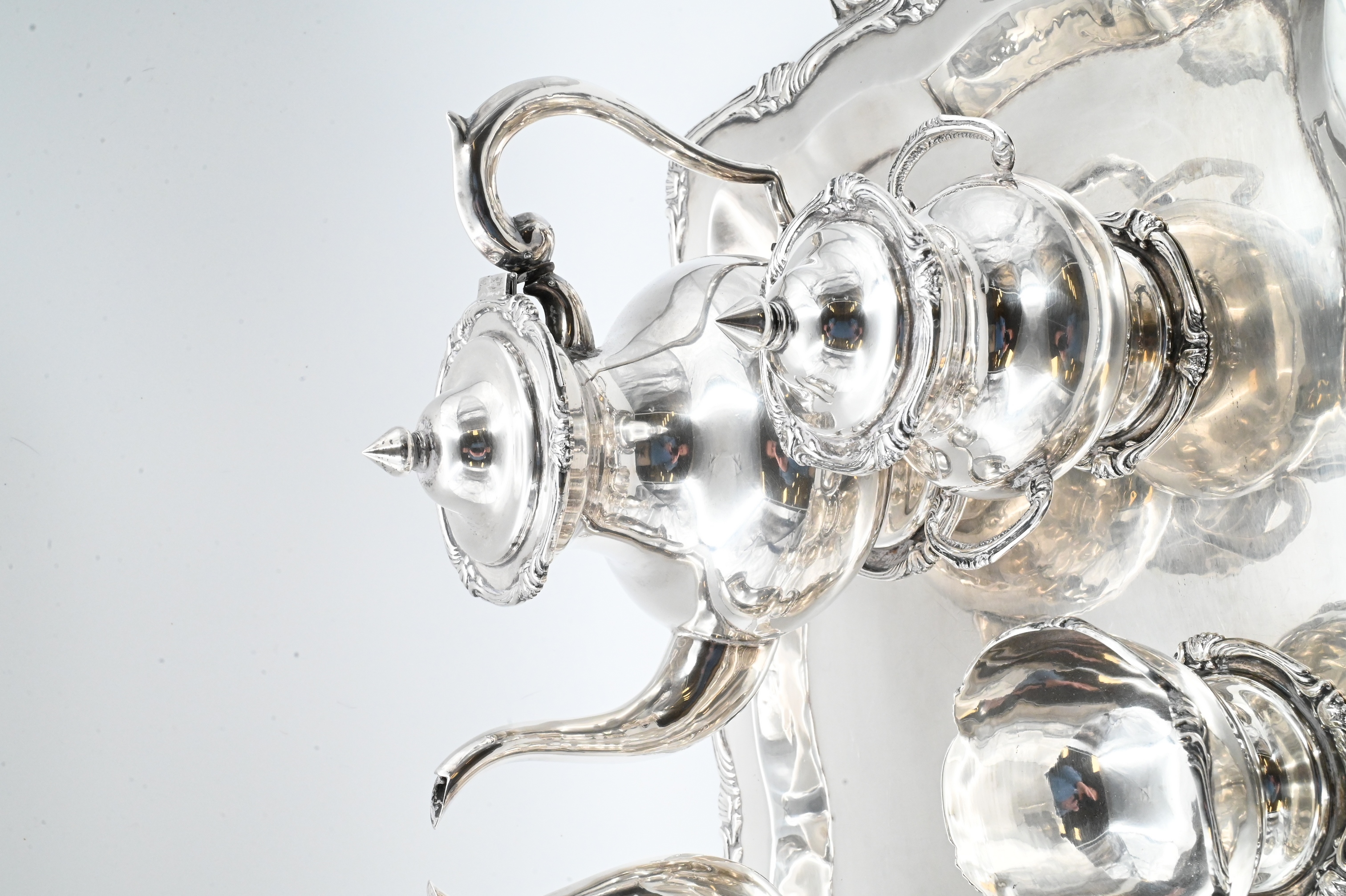 comprising a coffee pot (10 inches) , teapot (9 inches) , covered sugar bowl (6 inches), creamer (5 1/2 inches), waste bowl (3 inches) , and matching handled tray (15 3/4″ x 28″), each piece of bulbous form with scroll handles, shaped rims, and raised rocaille borders, all pieces marked 925