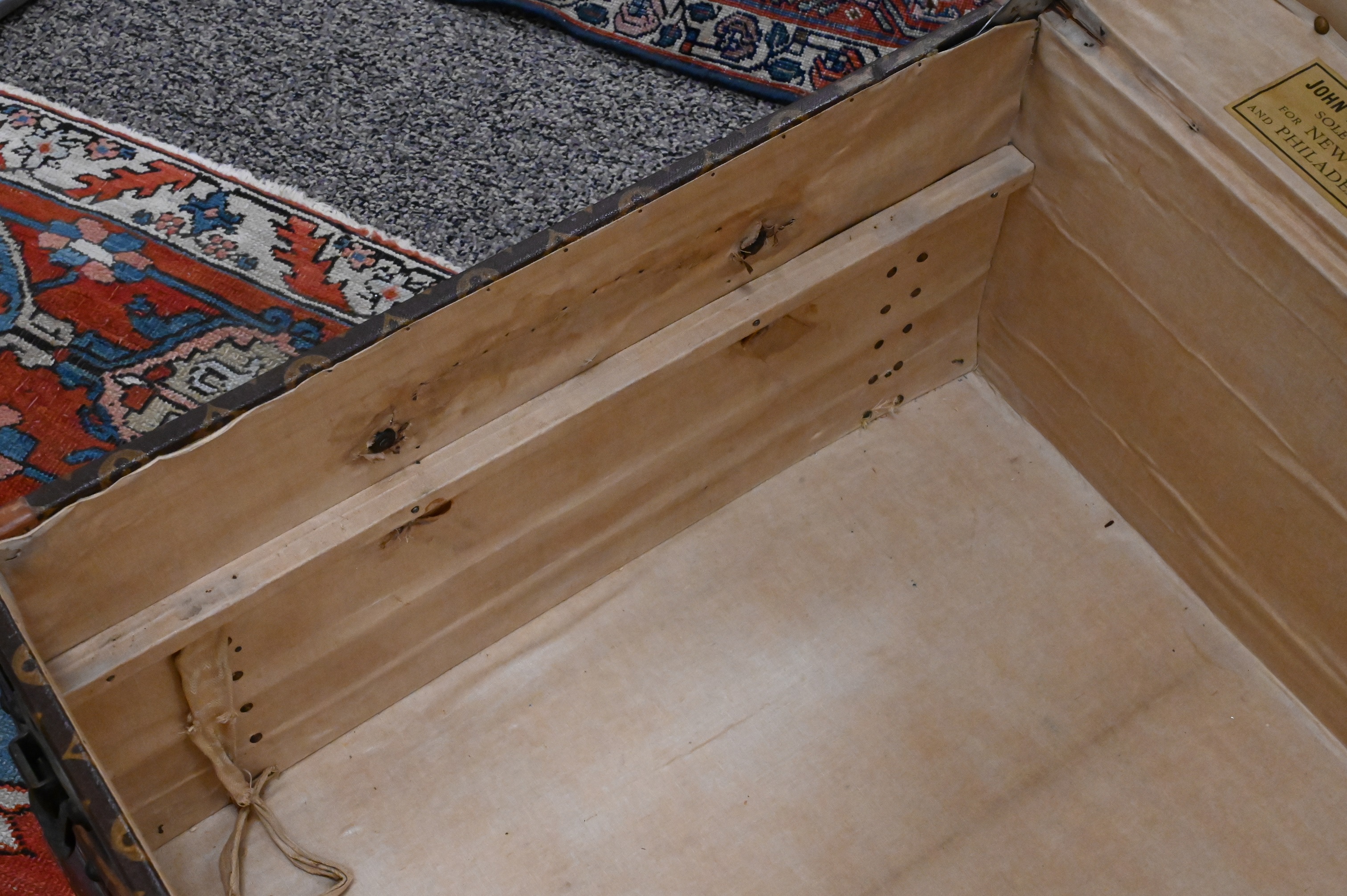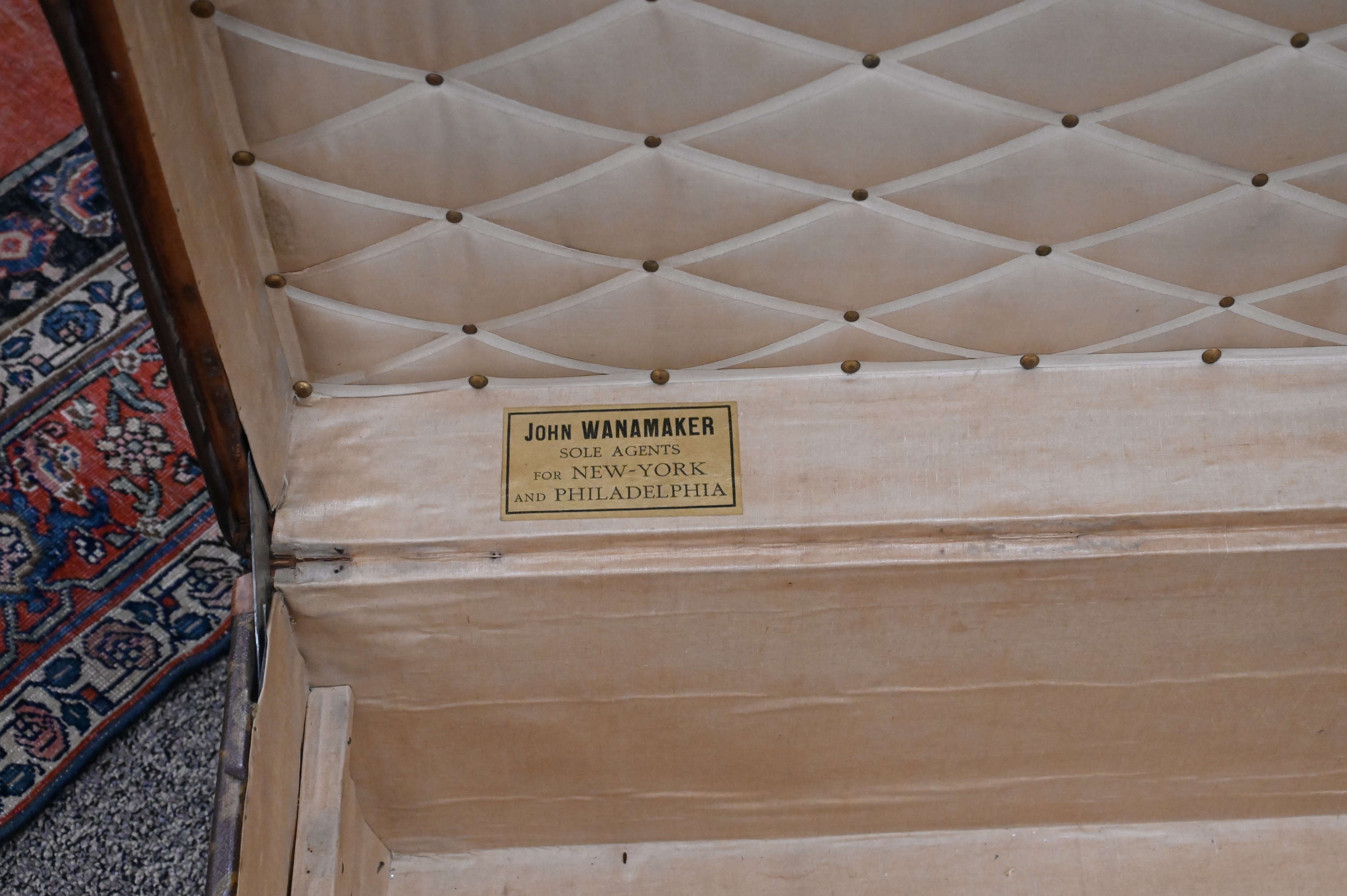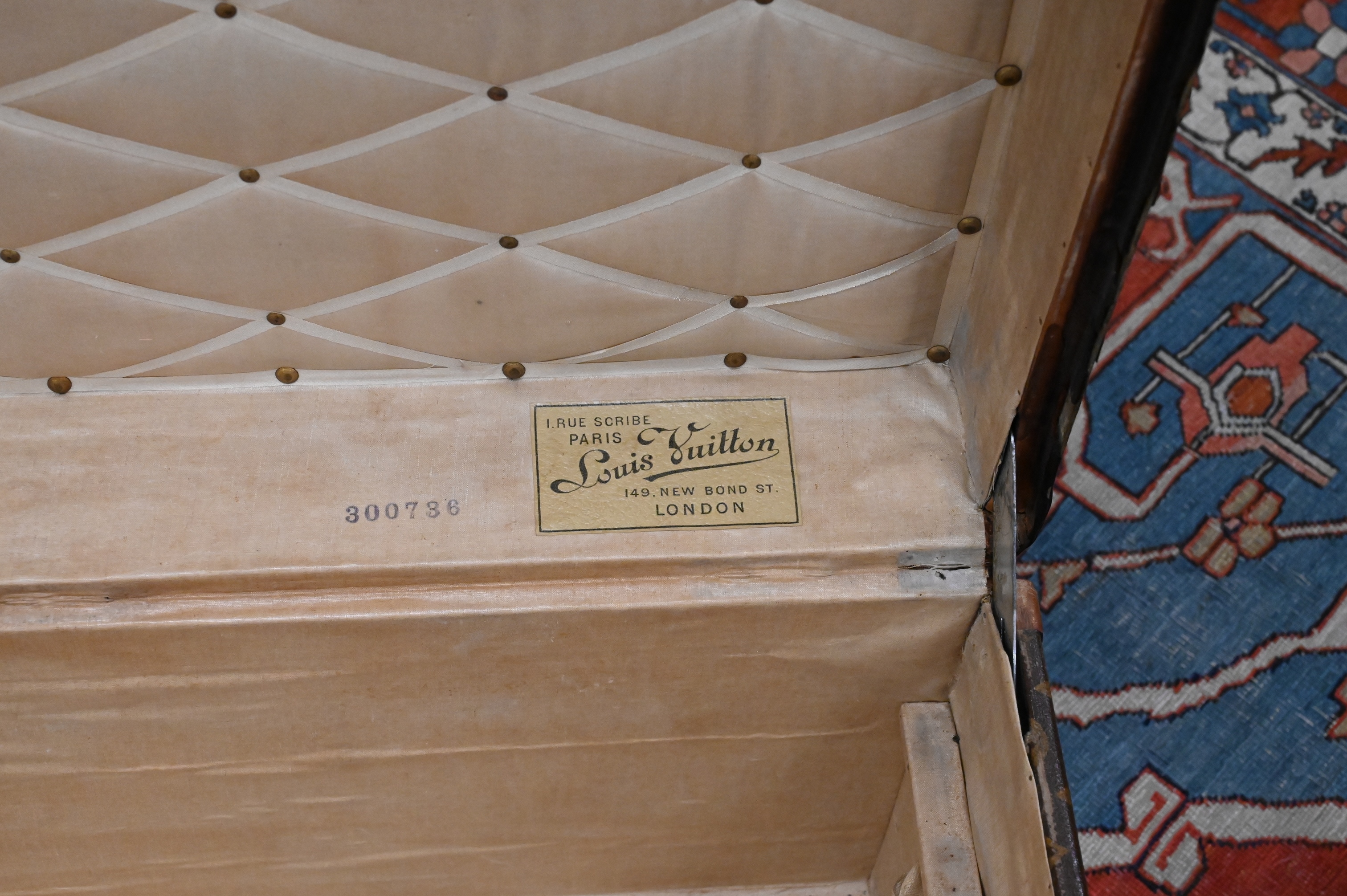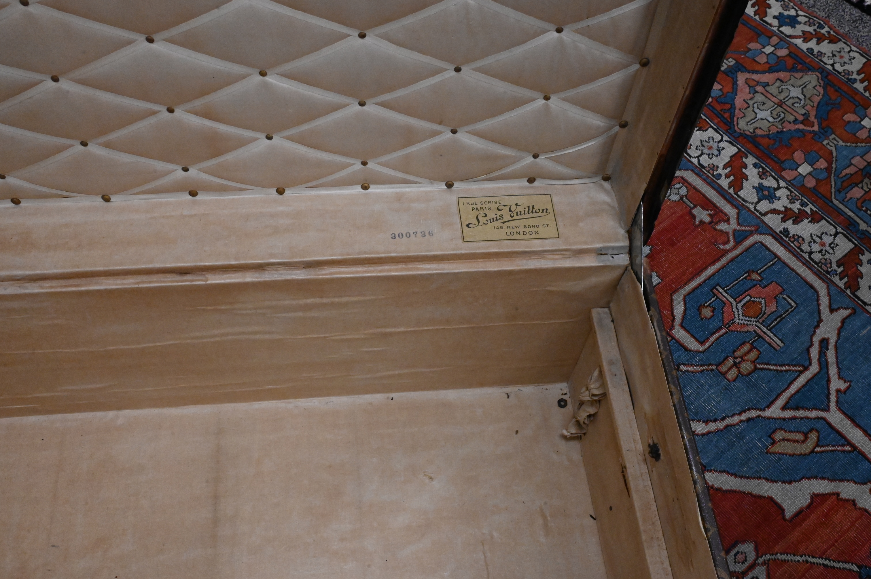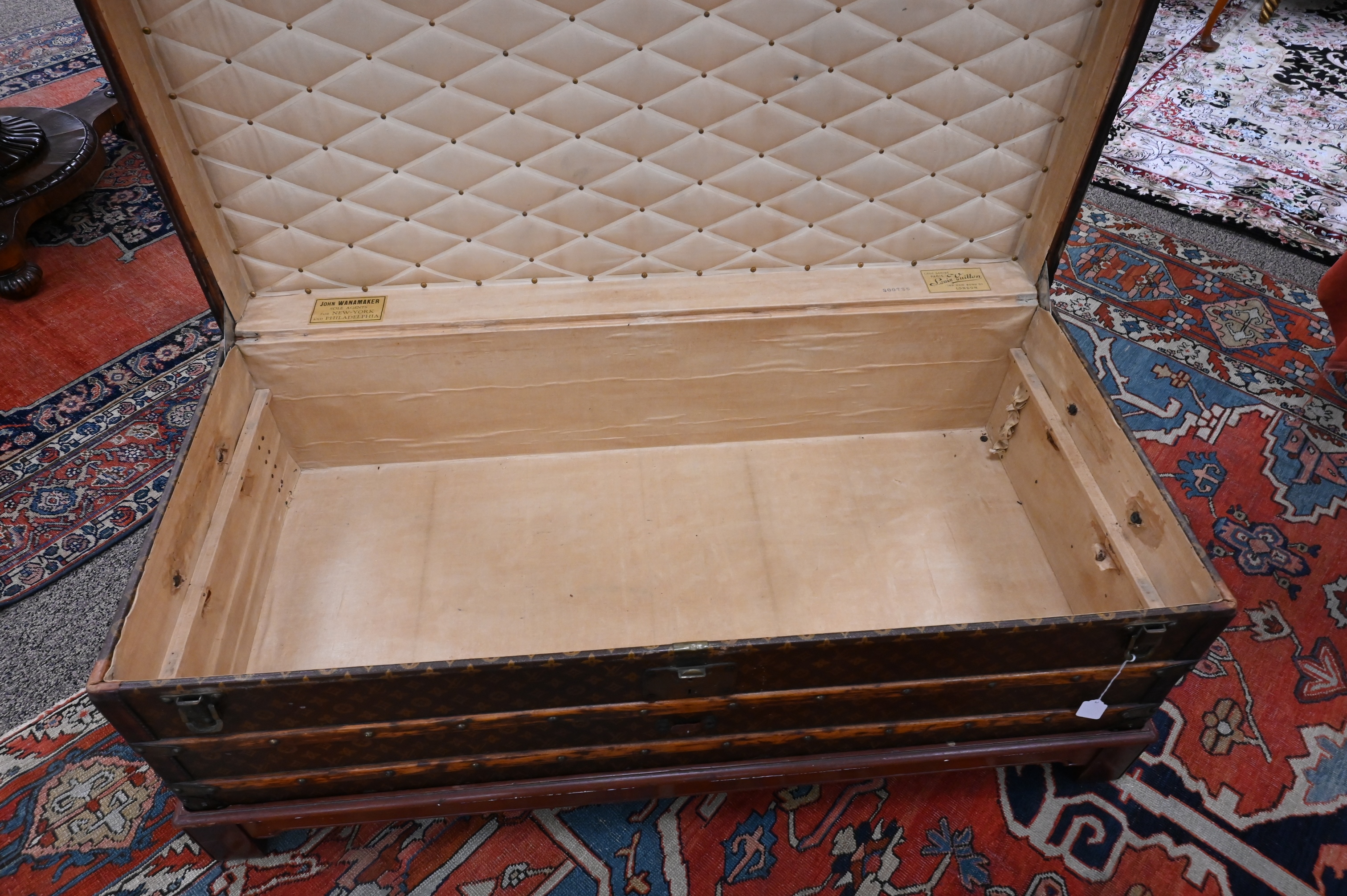 having wooden fitted base interior without trays, labels of John Wandmaker and Louis Vuitton 300736, top edging of leather dry with spots missing