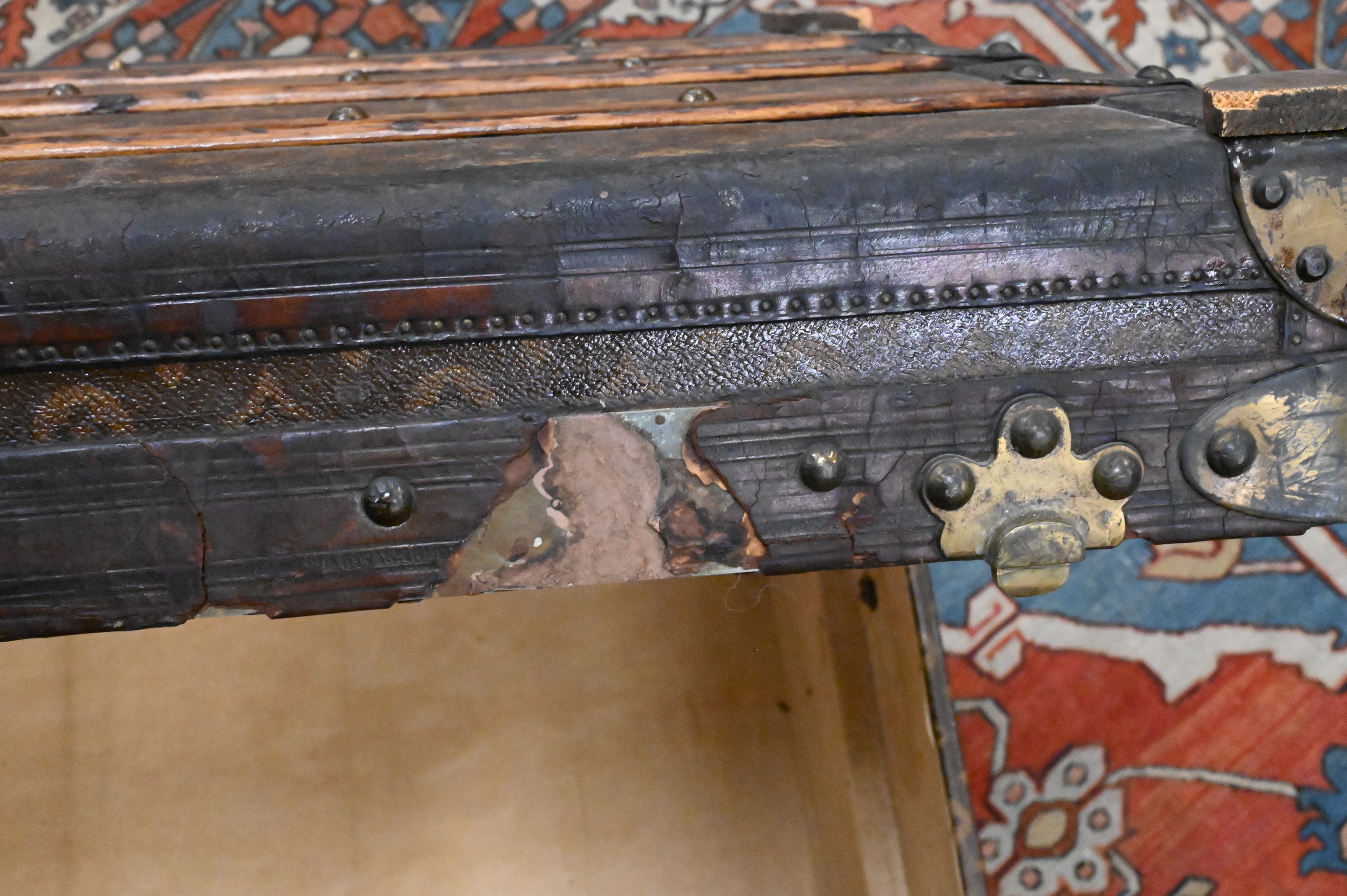 Condition: Presents well, exterior well worn from use, age cracks to top panel, strapping missing in front, interior tray not present