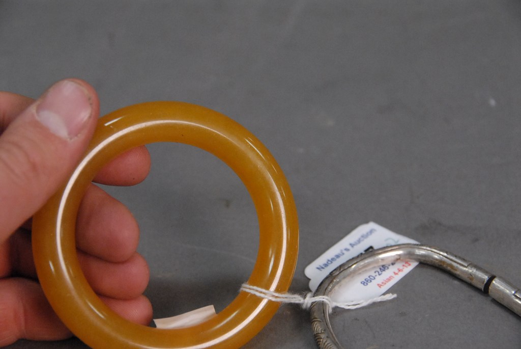 Two Oriental bracelets, one is yellow hardstone and the other silver. dia. 3in.