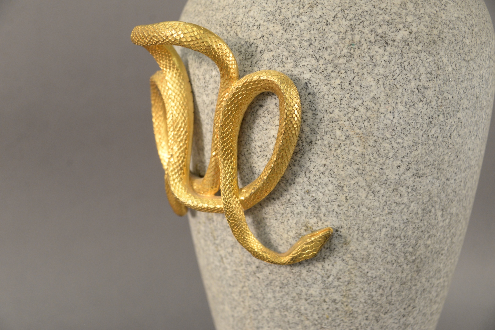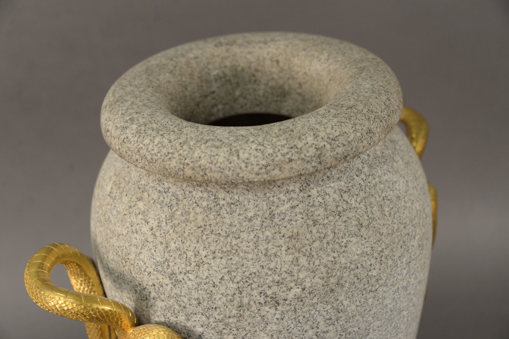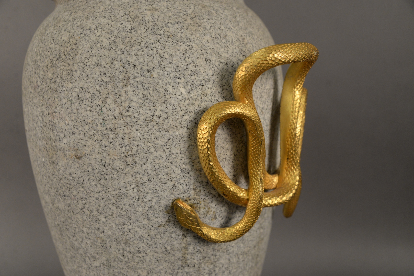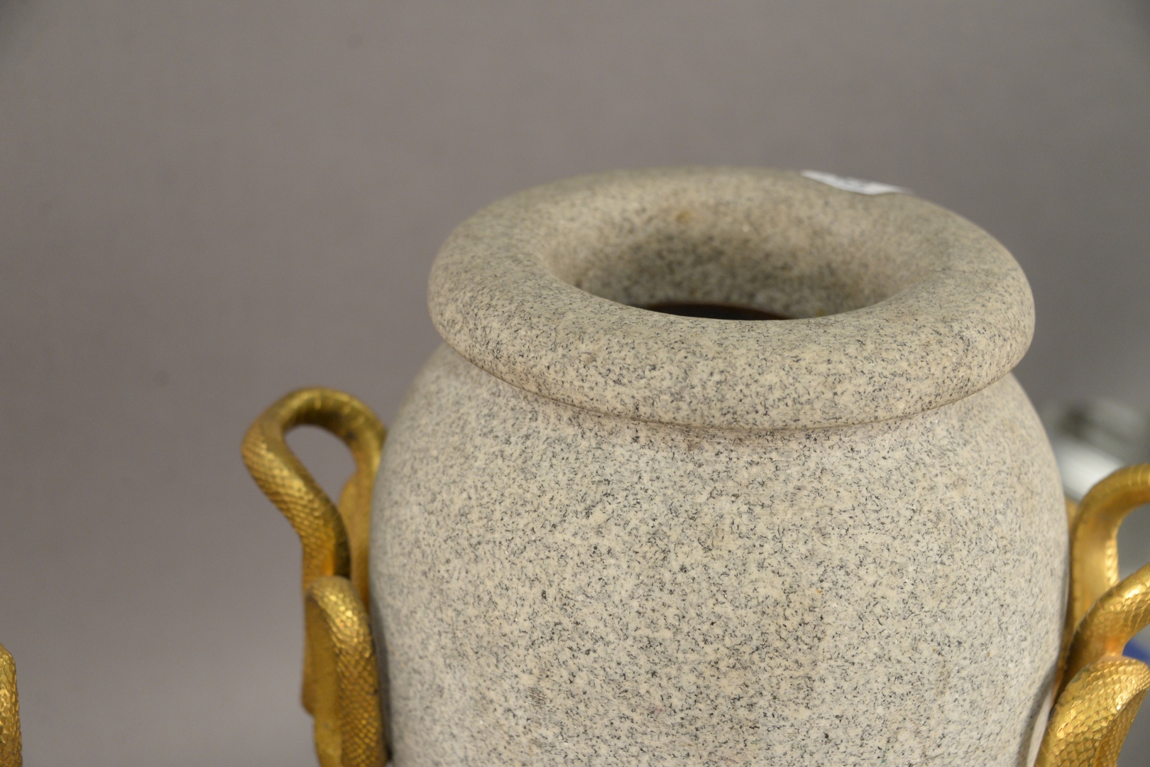 Pair of Stone Urns having gilt bronze snake handles, height 22 inches.