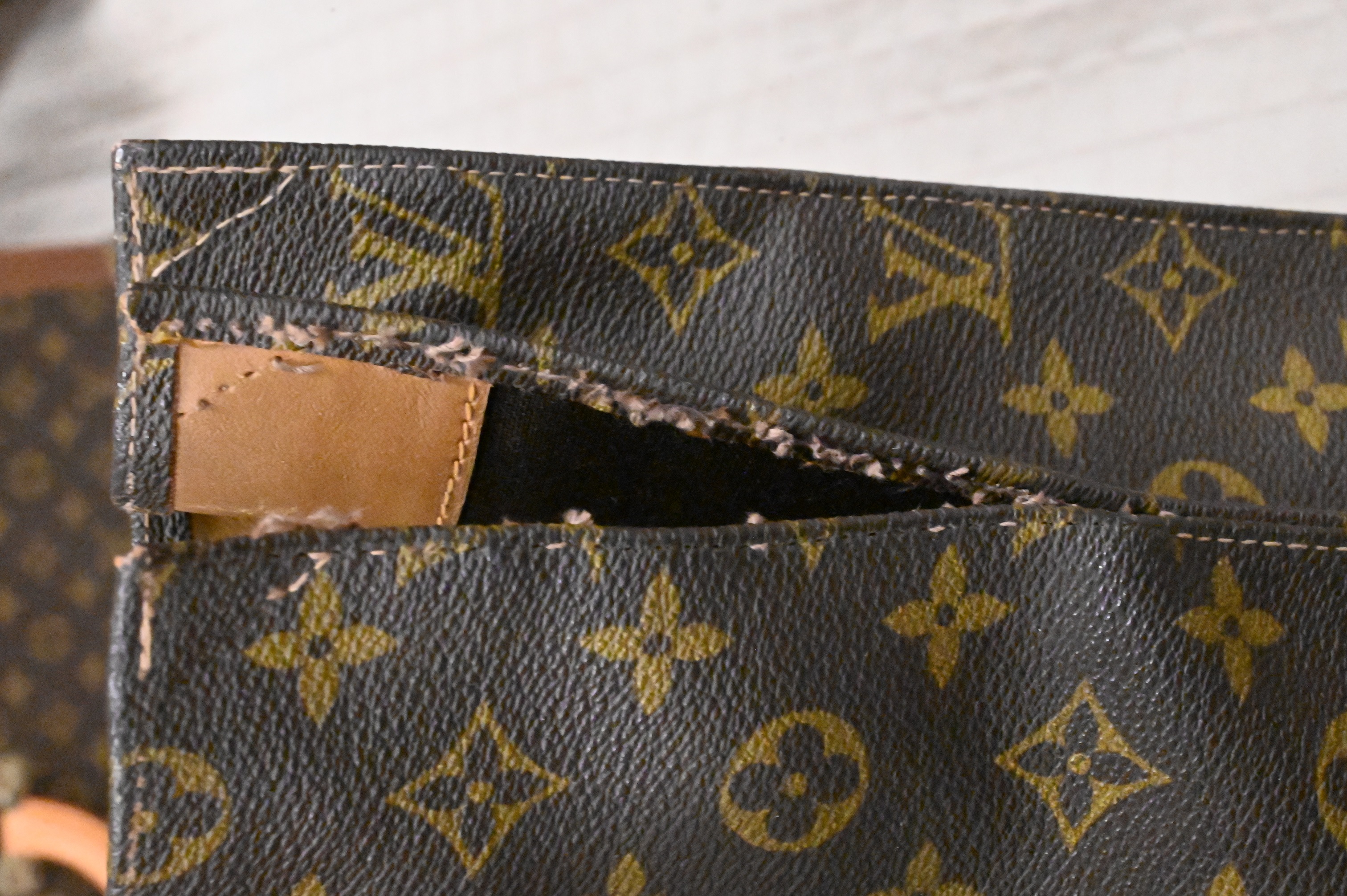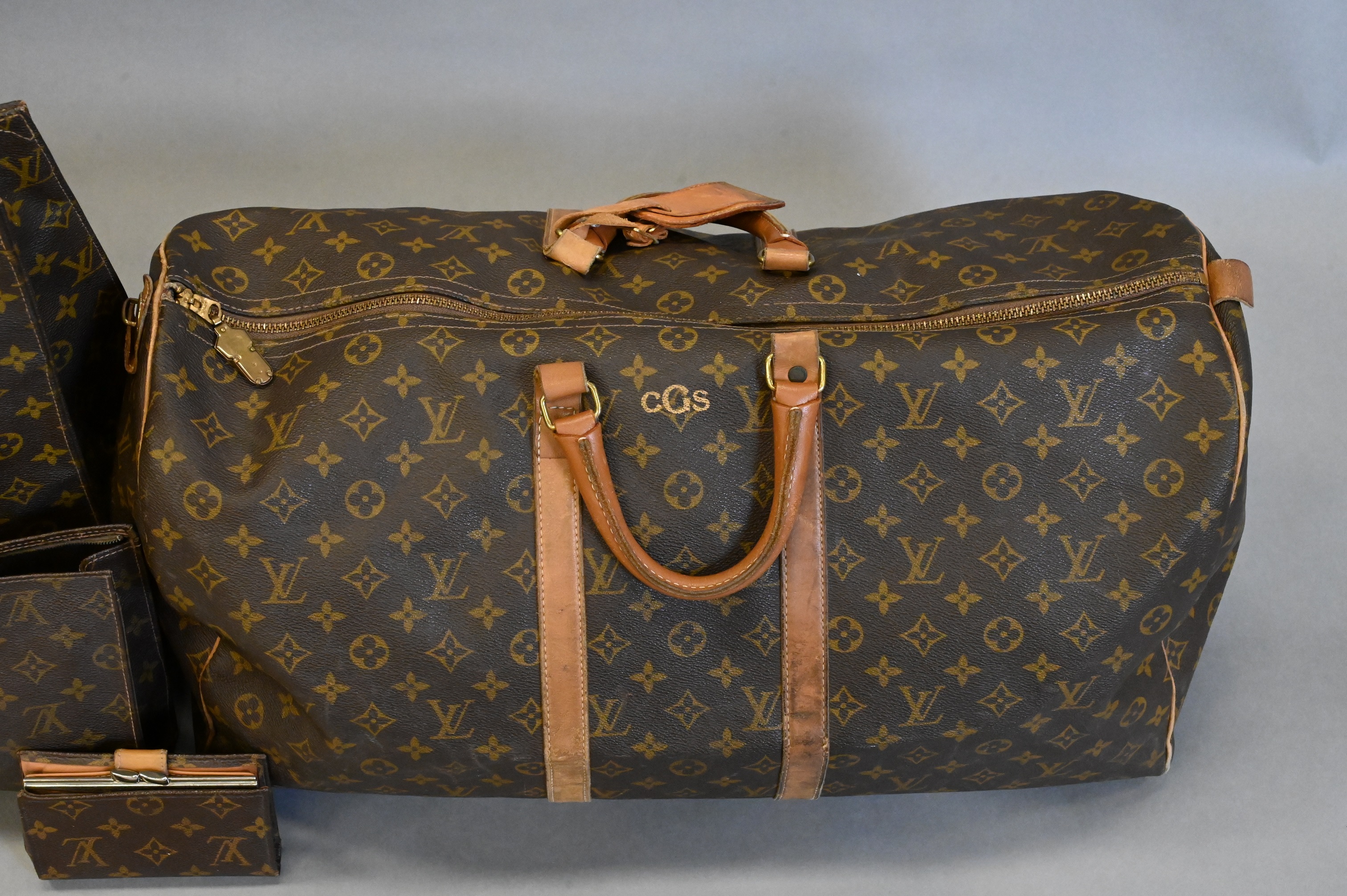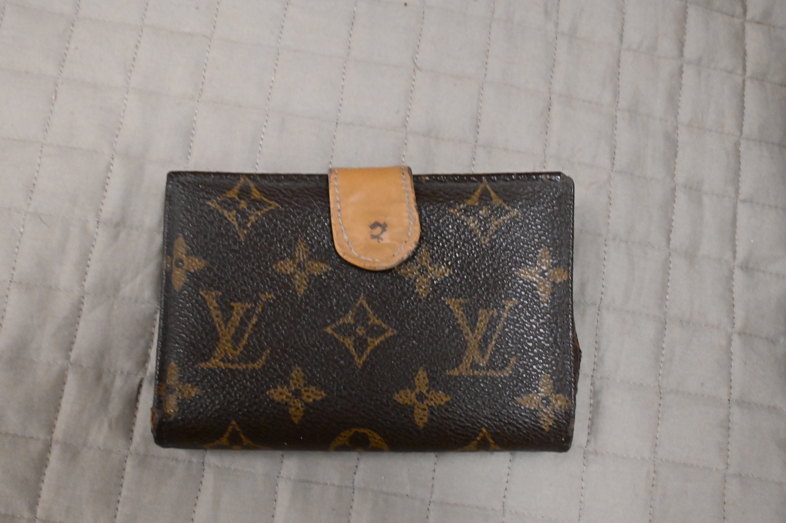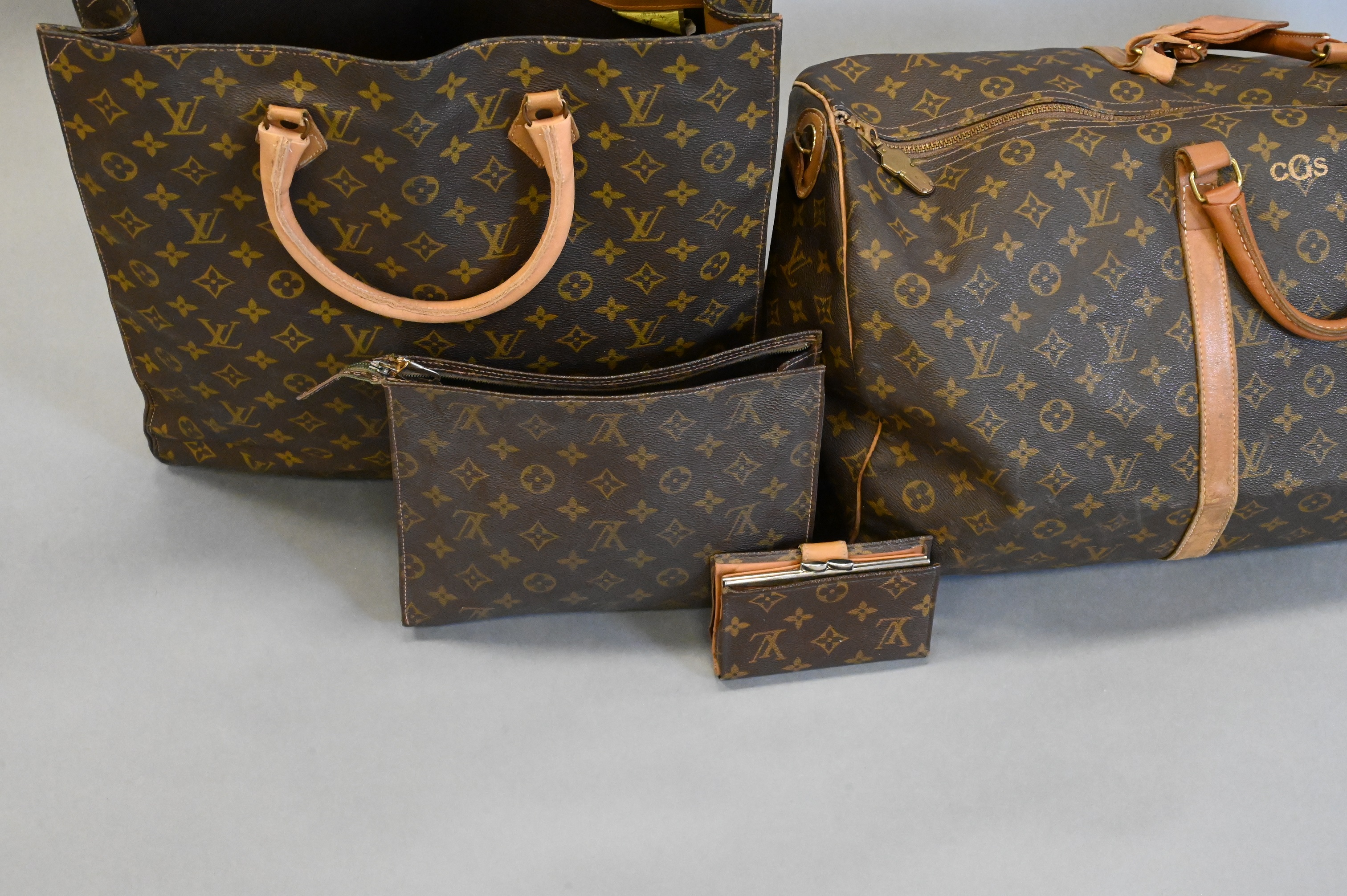 Condition: as is, rough condition, having tear, largest bag with tarnish, wallet with scuffing to edges, tote bag having four inch rip from top, smaller purse with broken zipper