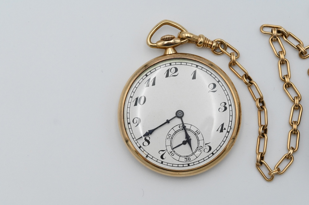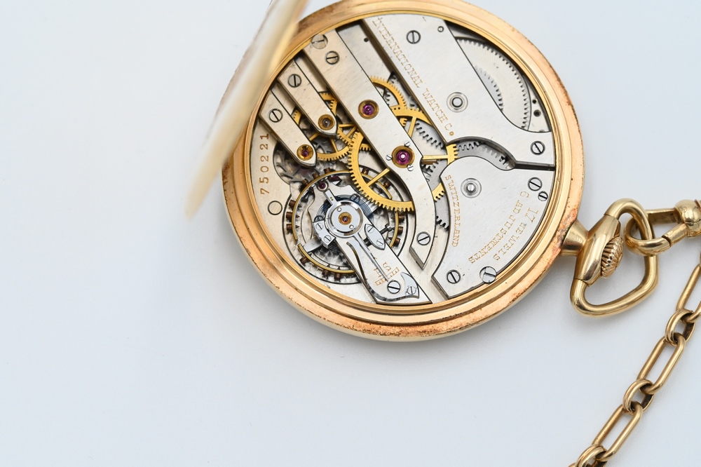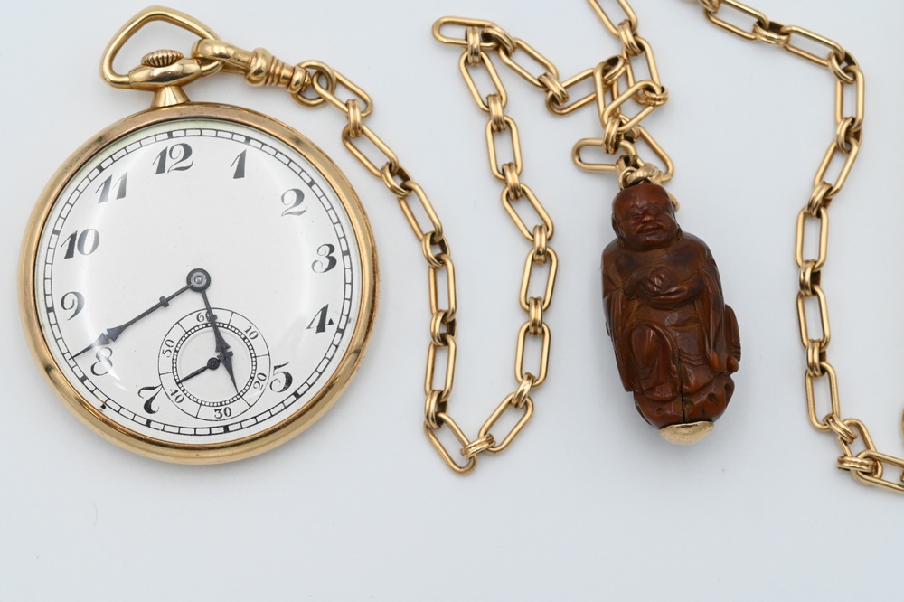 14 Karat Gold Lot, to include an International open face pocket watch; a Tiffany & Company lead pencil; along with a 14 karat gold watch chain, watch total weight 48 grams; pen and chain total weight 33 grams.