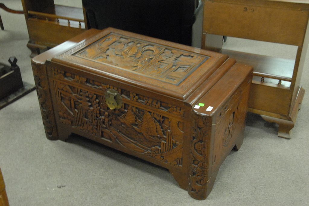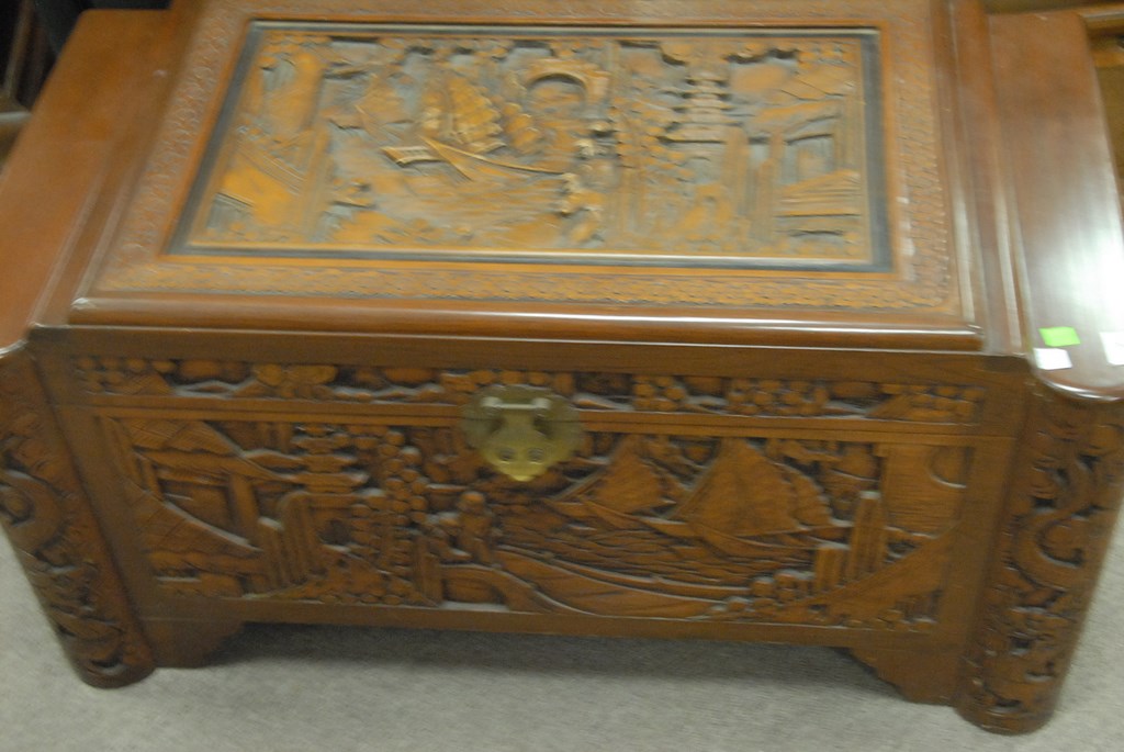 Camphorwood carved lift top chest, ht. 18, wd. 36.