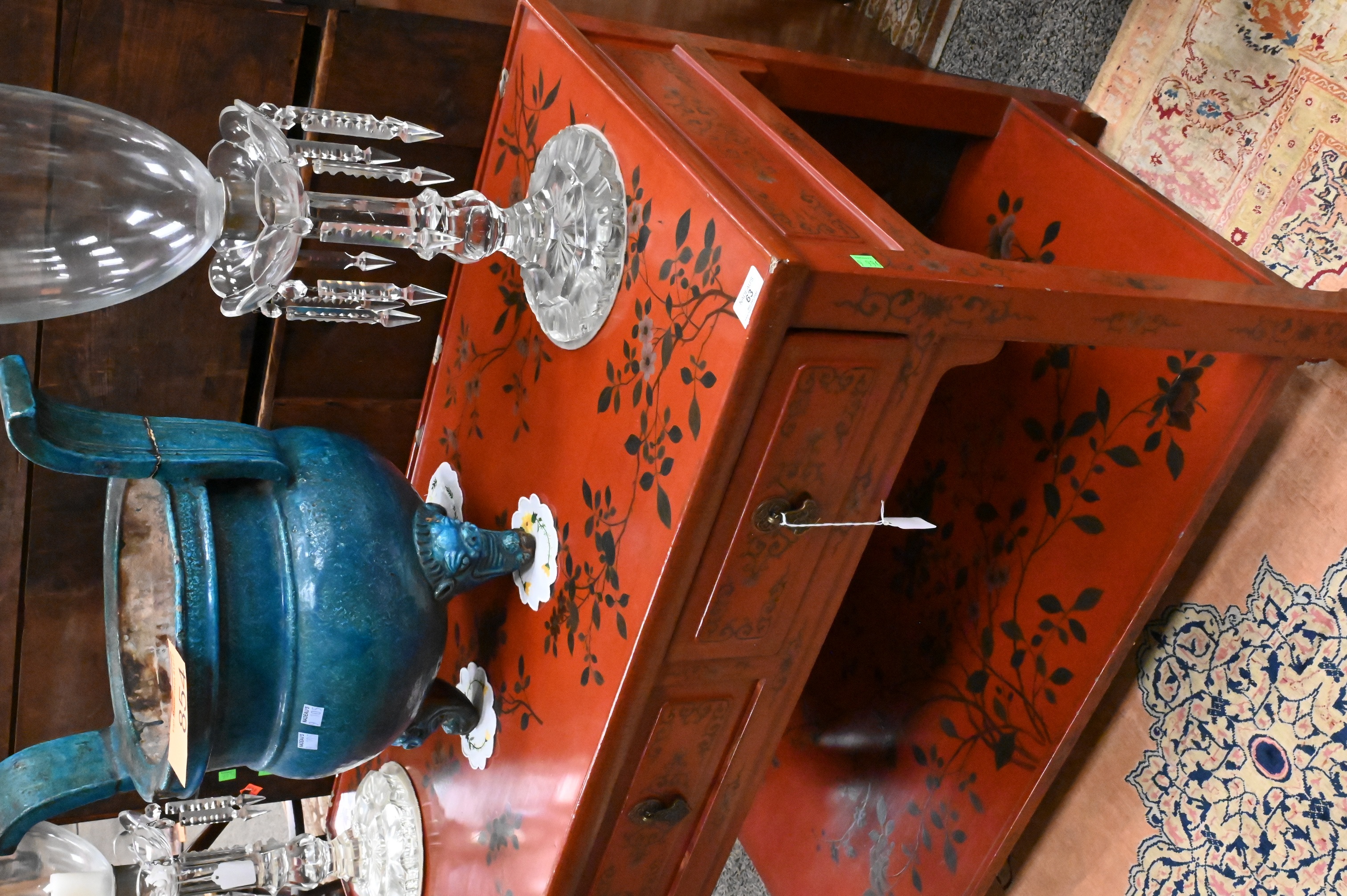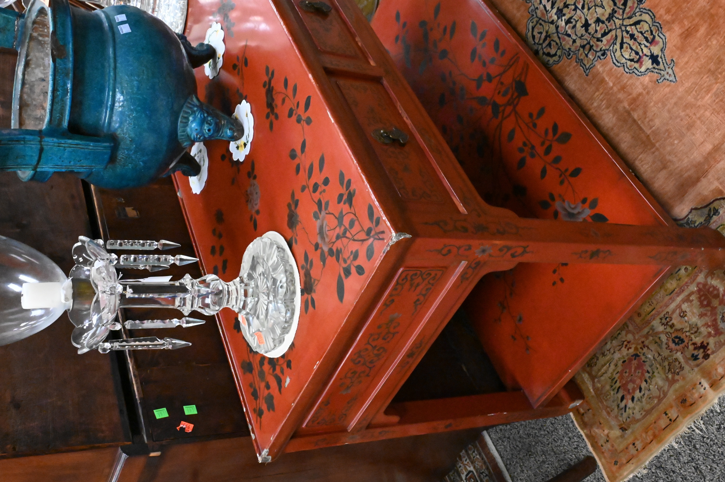 rectangular top decorated with floral motifs above two drawers fitted with brass pulls, over an open lower shelf also decorated with floral sprays, raised on straight legs, rich red lacquer ground with painted black decoration