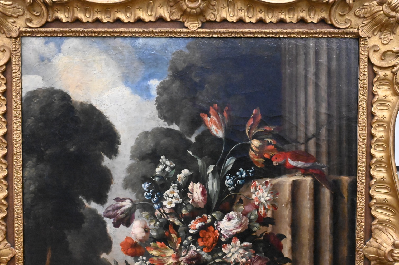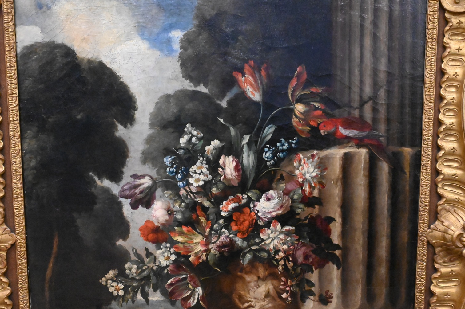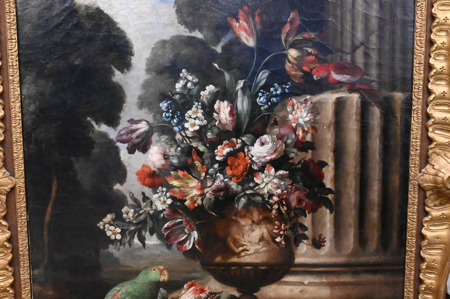featuring tulips and roses in a classical vase with three parrots perched on the steps of a colonnade with a forest landscape in the background, possibly Italian