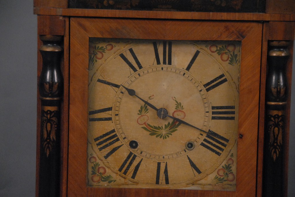 Federal mahogany two part shelf clock, Wooden Works Elisha Hodgkiss, ht. 32.