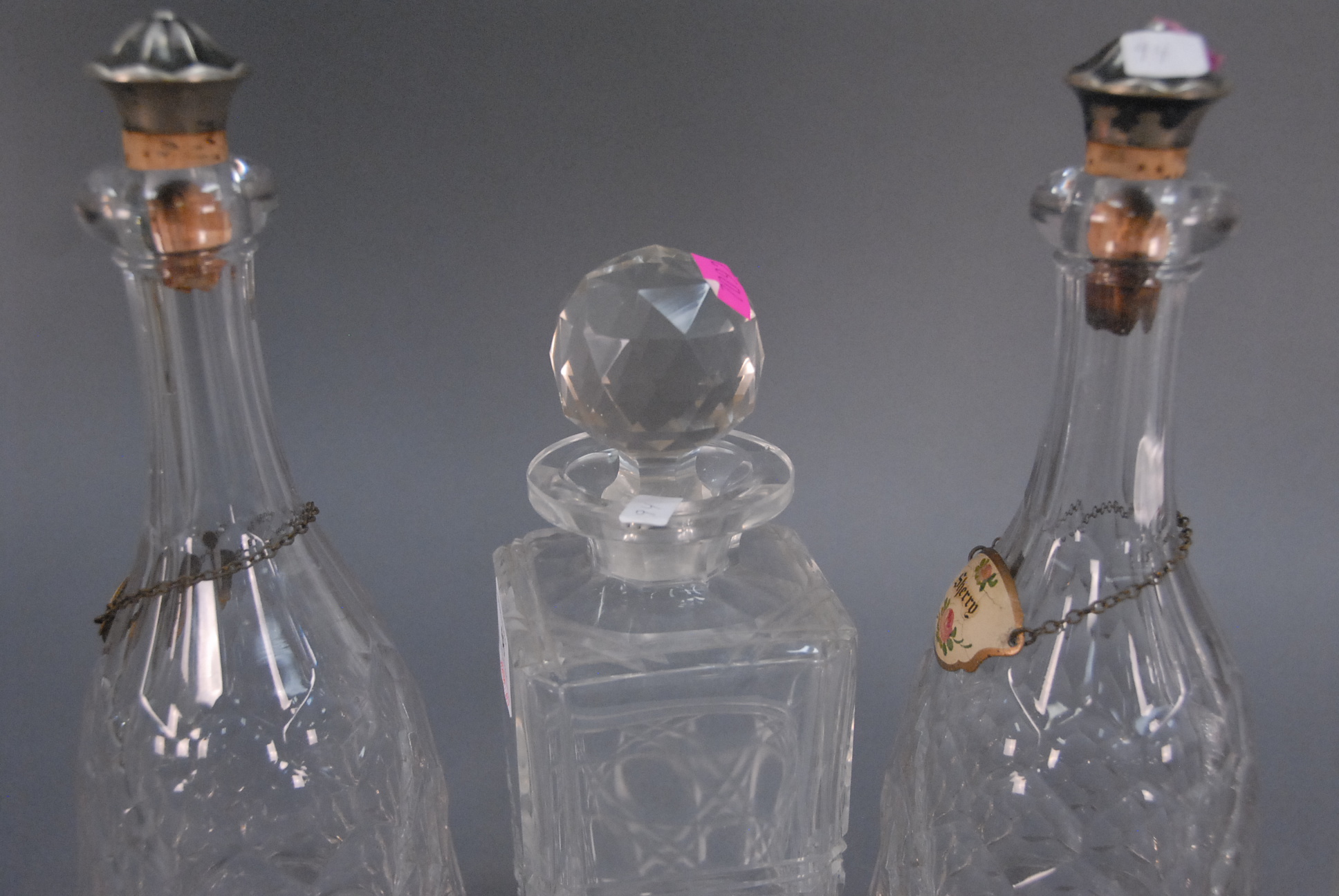 Four crystal decanters, two with silver topped corks, ht. 10in. – 12 1/2in.