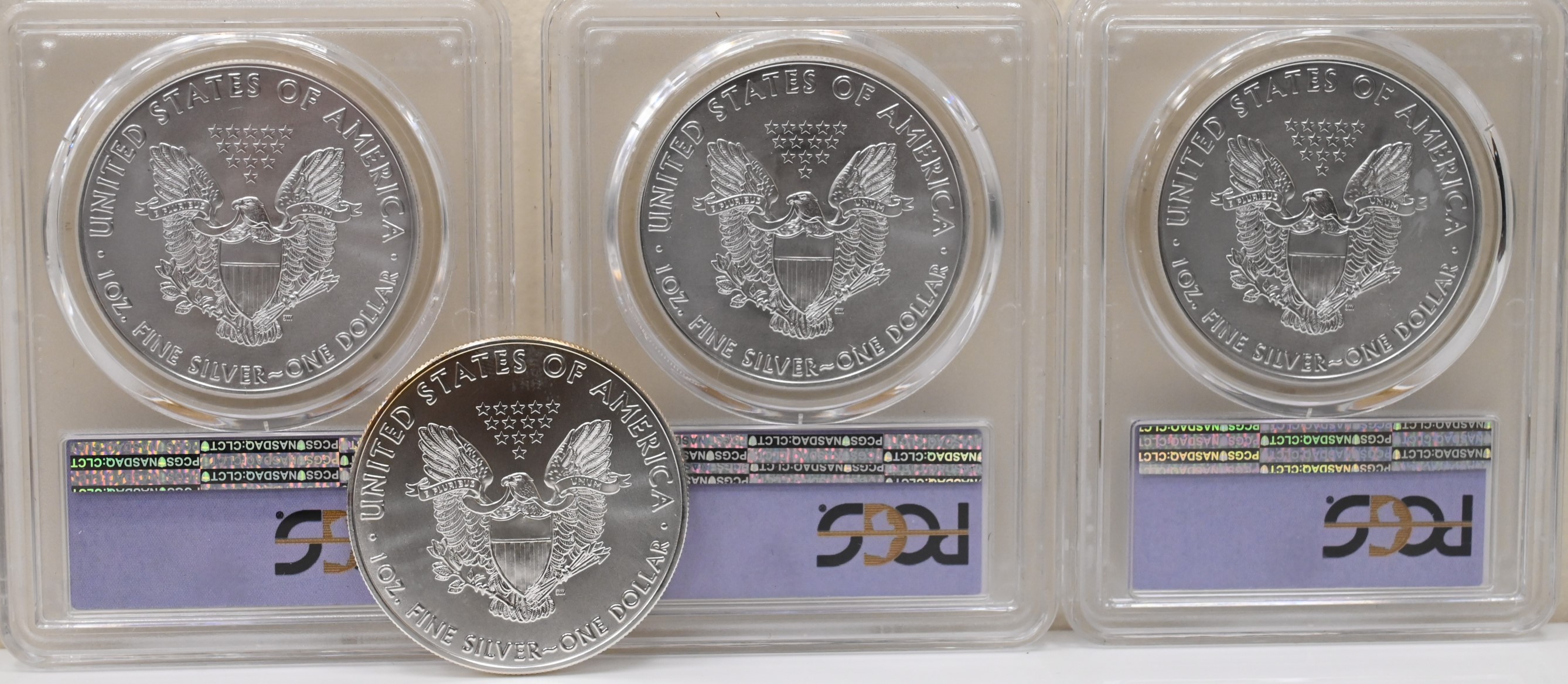 Four Silver Eagles, to include three 2017 Black Eagle First Strike PCGS 70 uncirculated, plus one MS-2017 silver eagle.