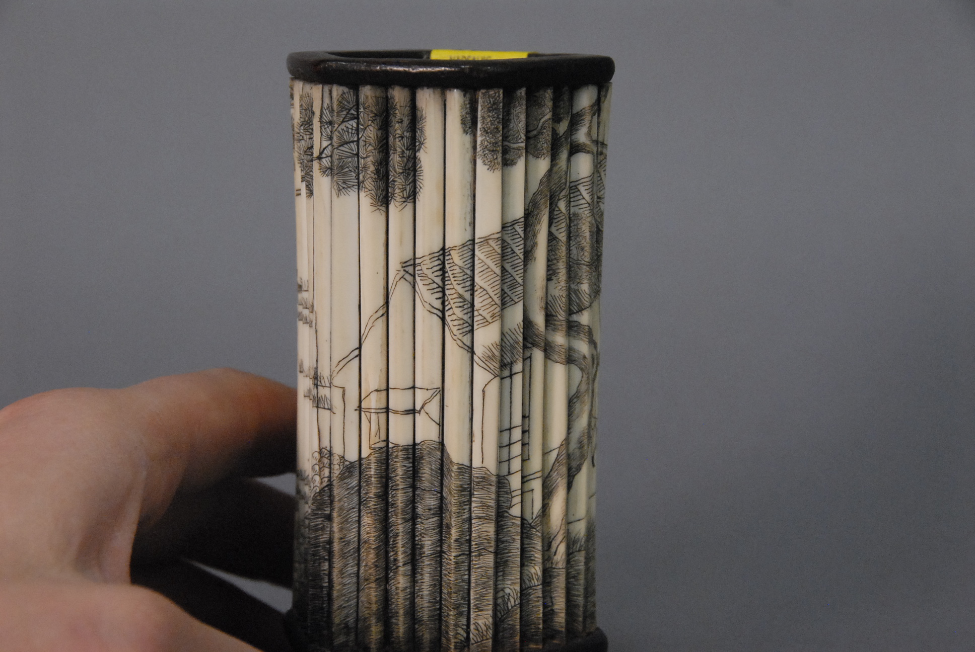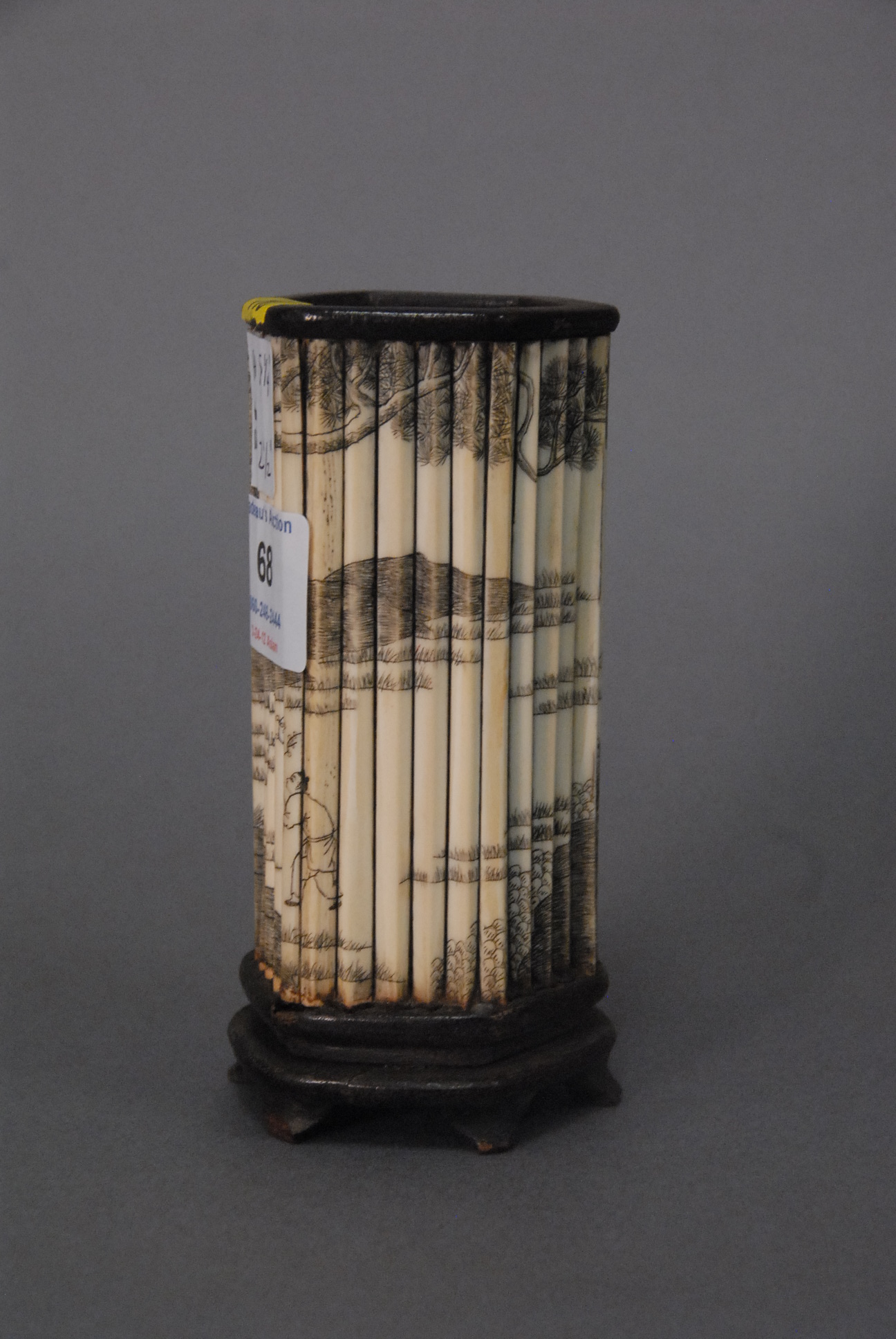 Lot 68: Ivory hexagon stick vase, made of thirty small ivory sticks and incised landscape, with carved wood top and bottom, ht 5 1/4 .