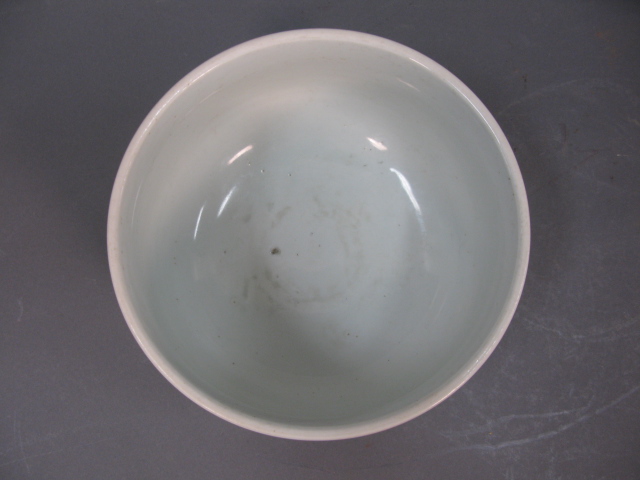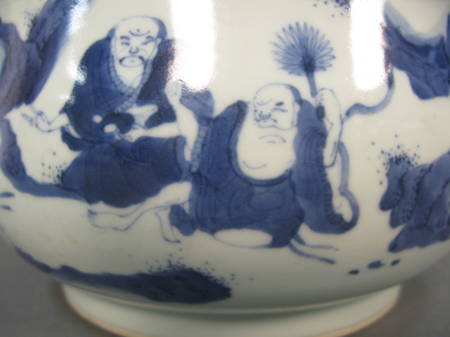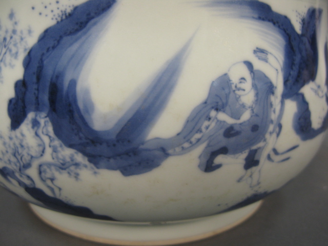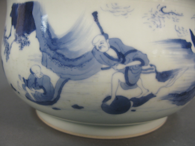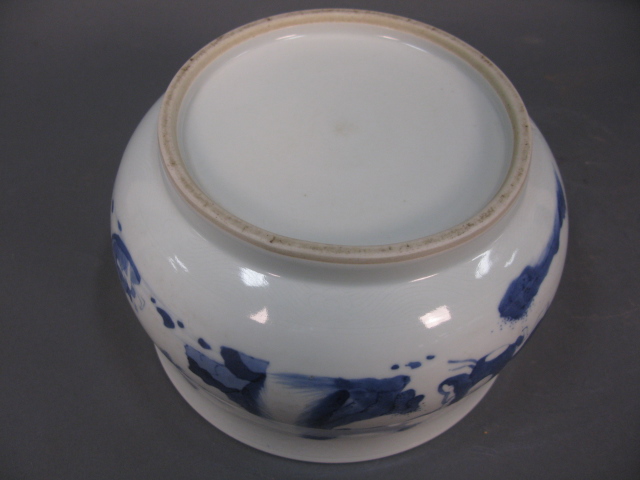 Oriental porcelain blue and white scholar’s bowl having five scholars with landscape background.