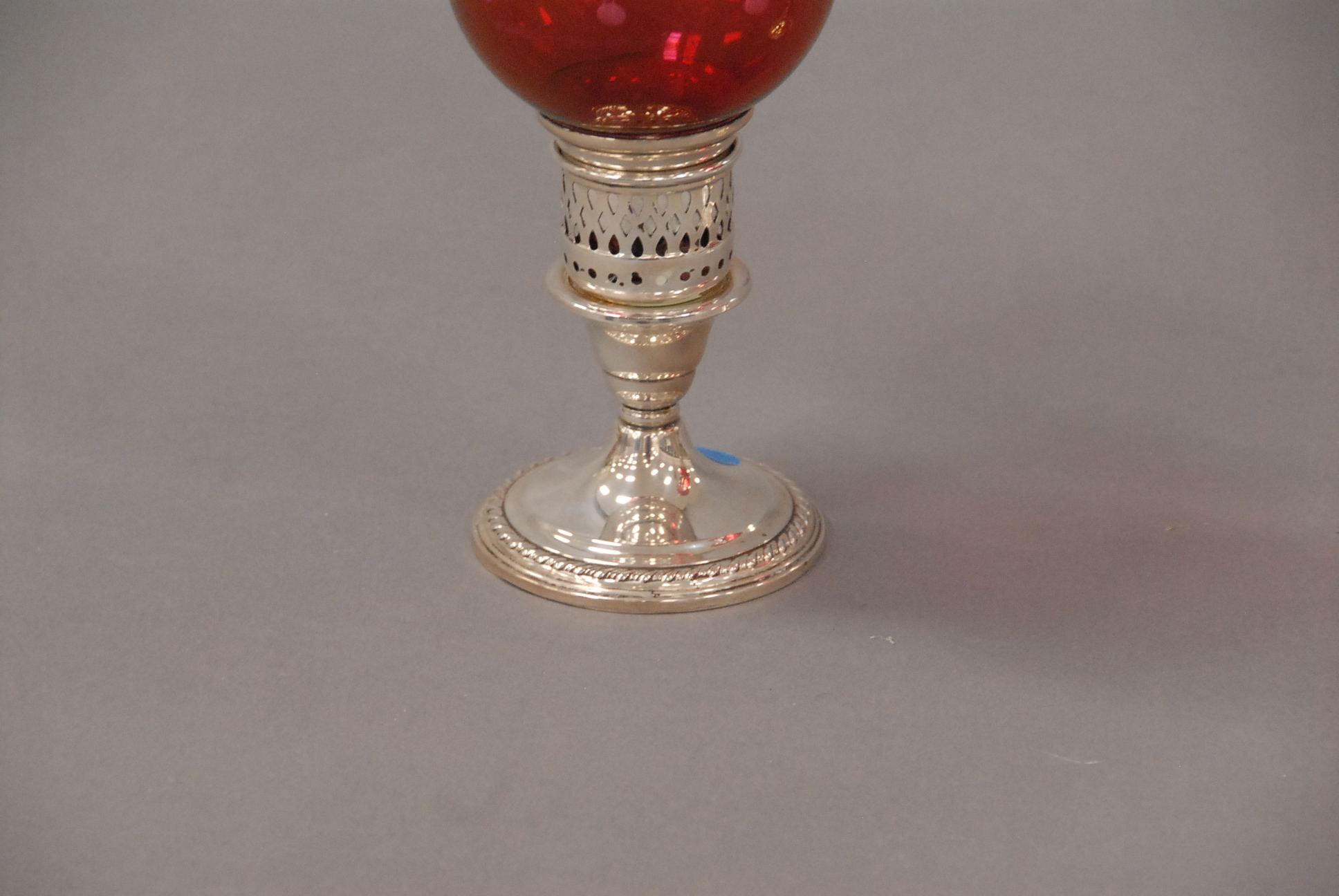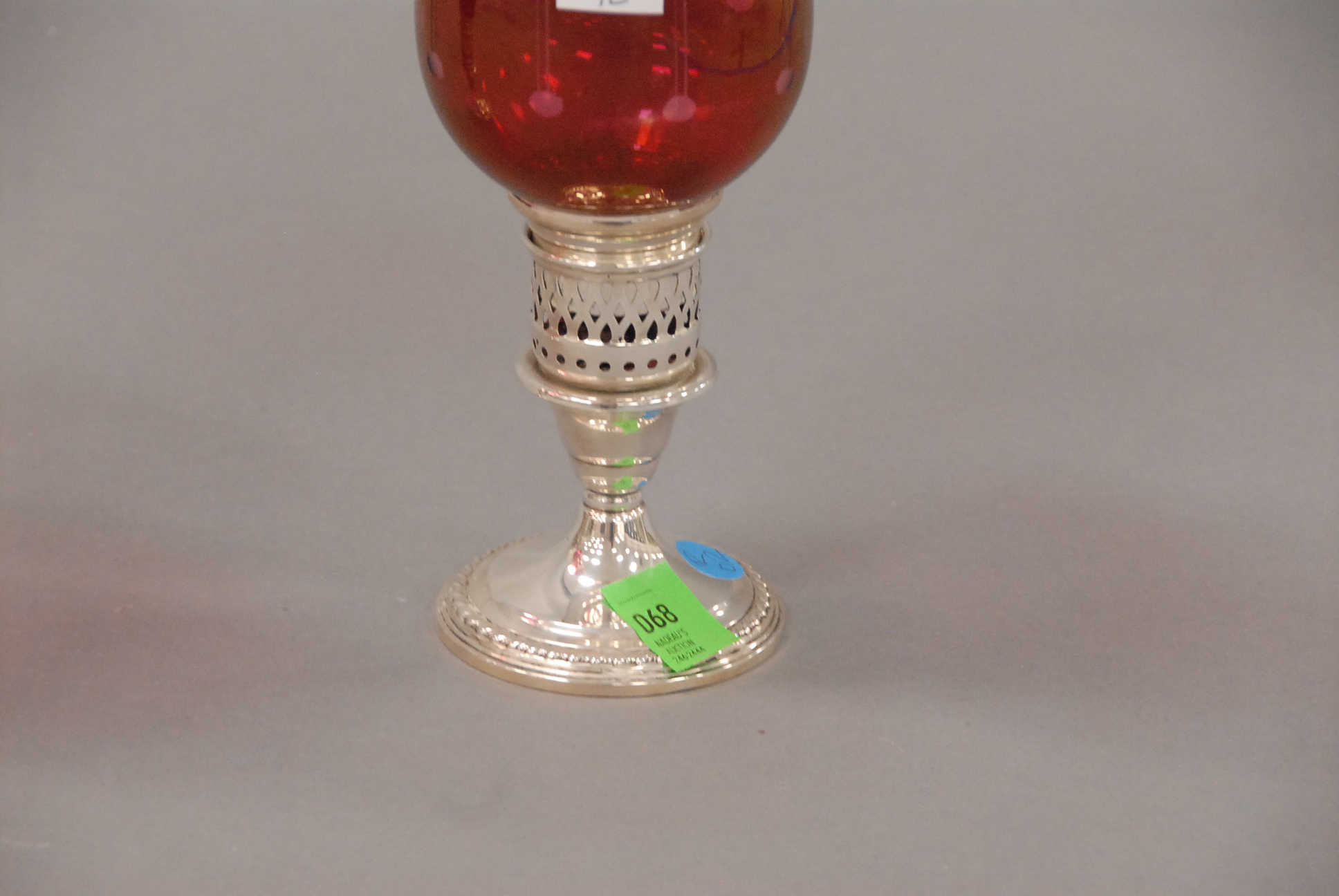 Pair of weighted sterling candle holders with cranberry cut to clear shades.