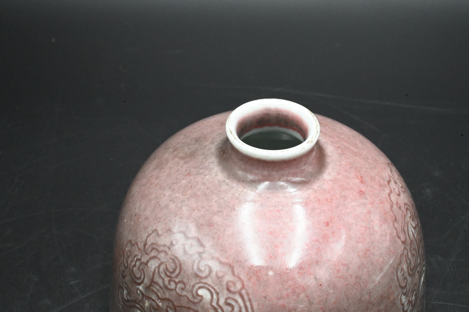 Peachbloom Beehive Water Pot (Daibi Tsun), one of the eight precious shapes for the scholar’s table, in overall “ashes of roses” glaze and incised with three stylized dragon rondels, base with apocryphal underglaze blue six-character Kangxi regnal mark, height 3 1/6 inches, diameter 5 inches.